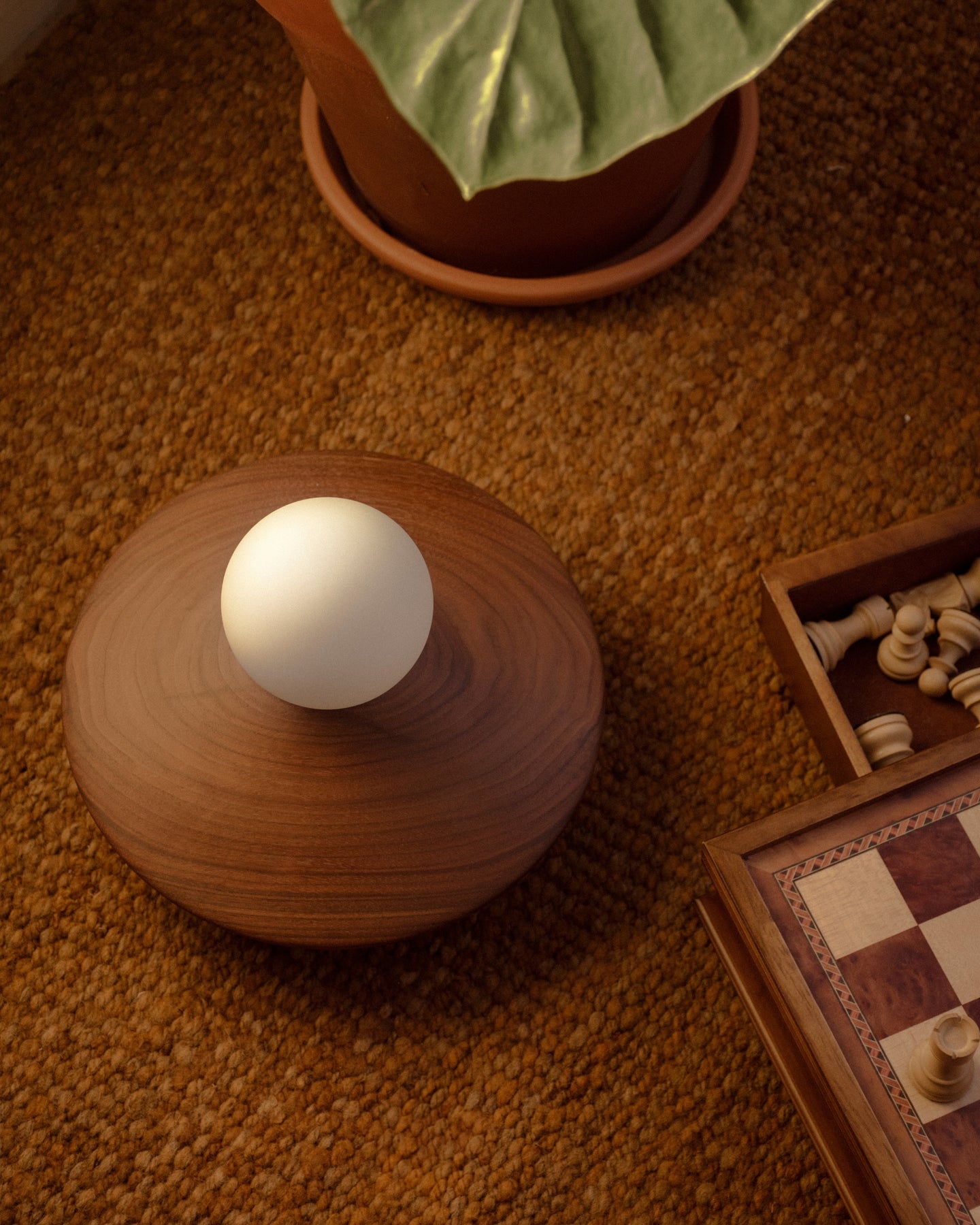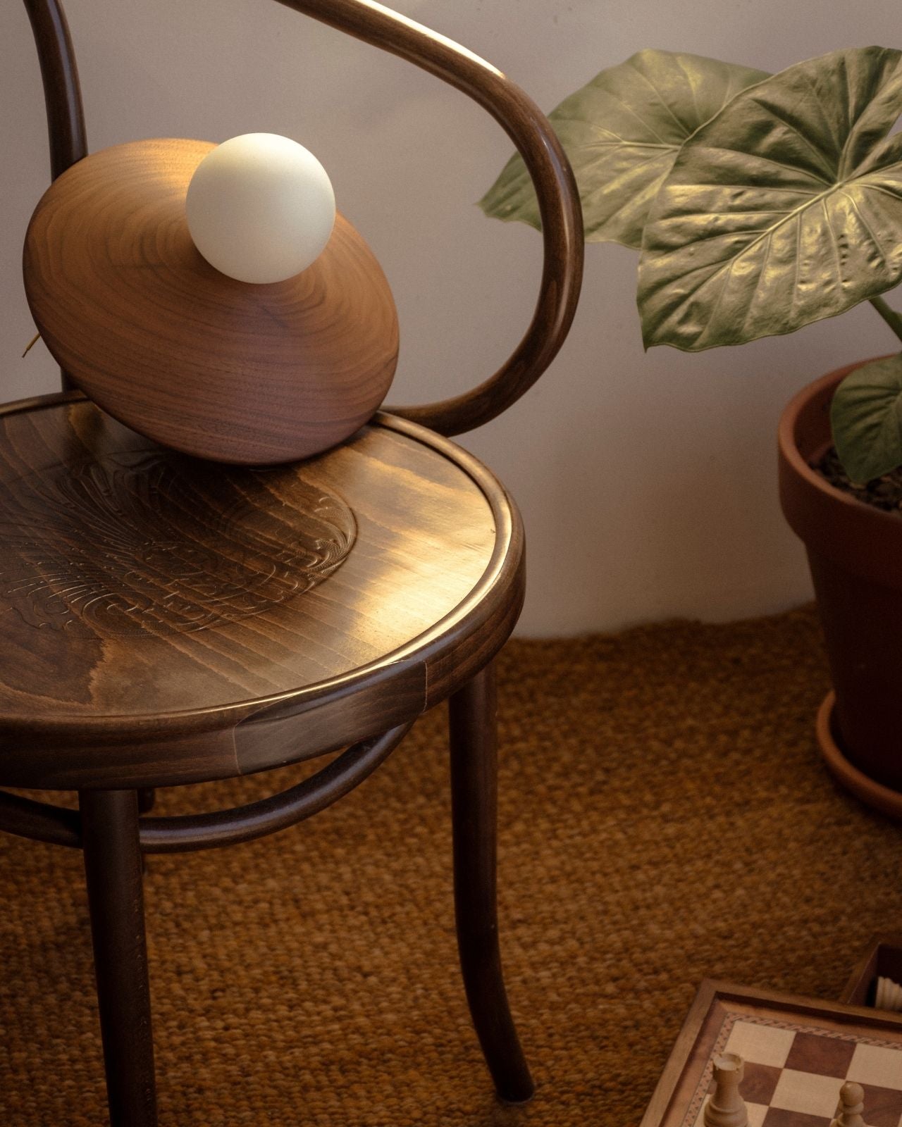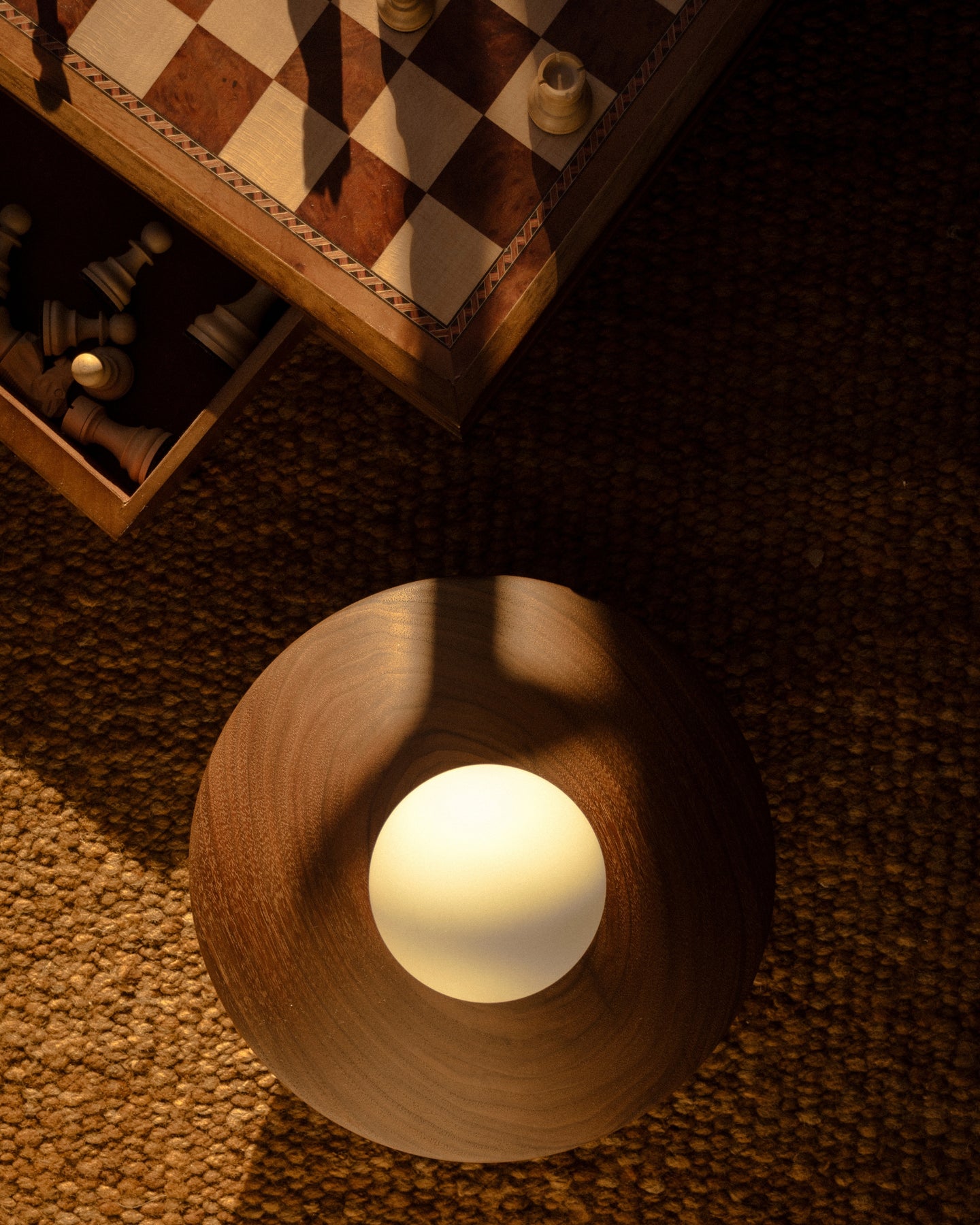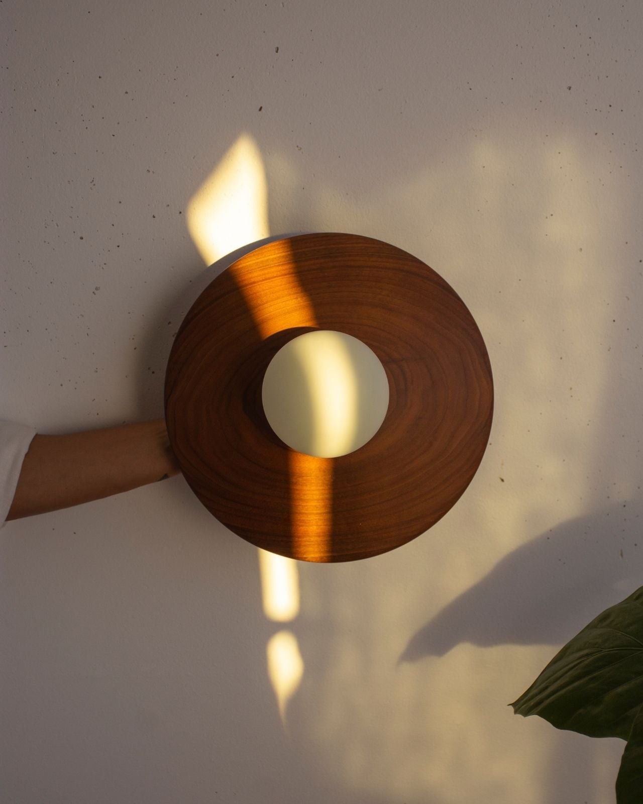 Introducing the wall-mounted disc complimented by a brushed nickel, brass, satin white or matte black backplate, a stunning addition to the Bright Beads collection. These lights are crafted by hand from FSC-approved walnut and oak, showcasing their unique textural qualities as a sculptural element.