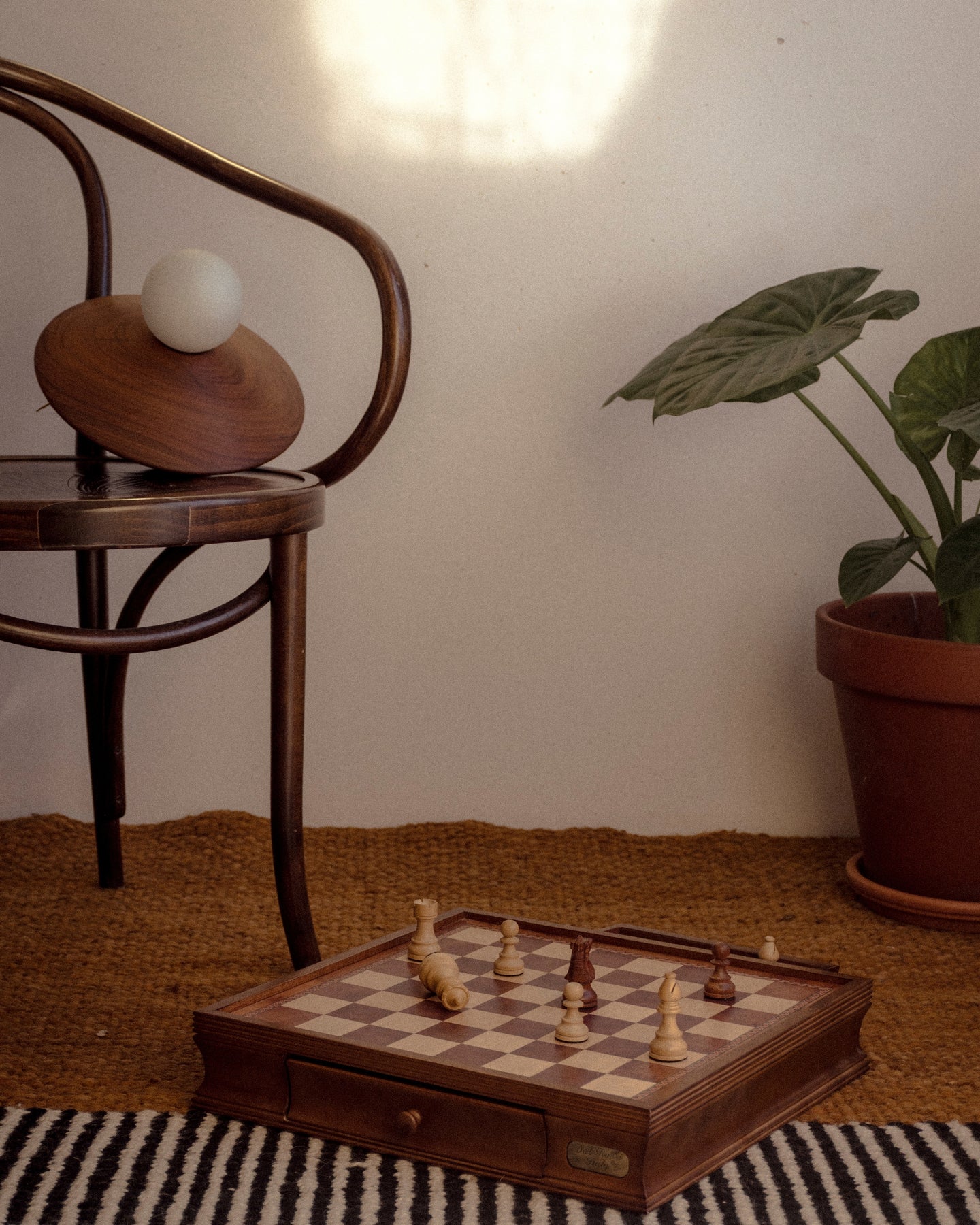 Wooden chessboard with pieces on a rug next to a chair and plant