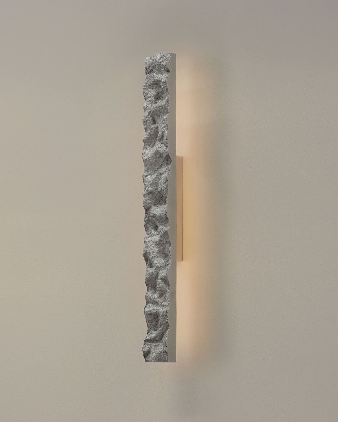 The Carst Wall Sconce is a distinctive sculptural piece crafted through innovative techniques. Handmade by artisans in Melbourne, it begins with a length of concrete that is carefully carved, then used to form a mould. From this, an aluminium casting is created, capturing the raw texture of the original concrete. The result is a striking wall light with a Brutalist style and a textured finish.