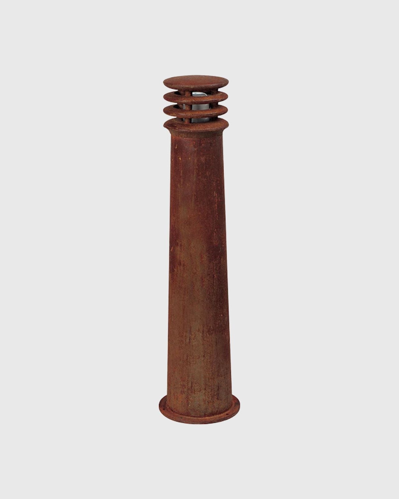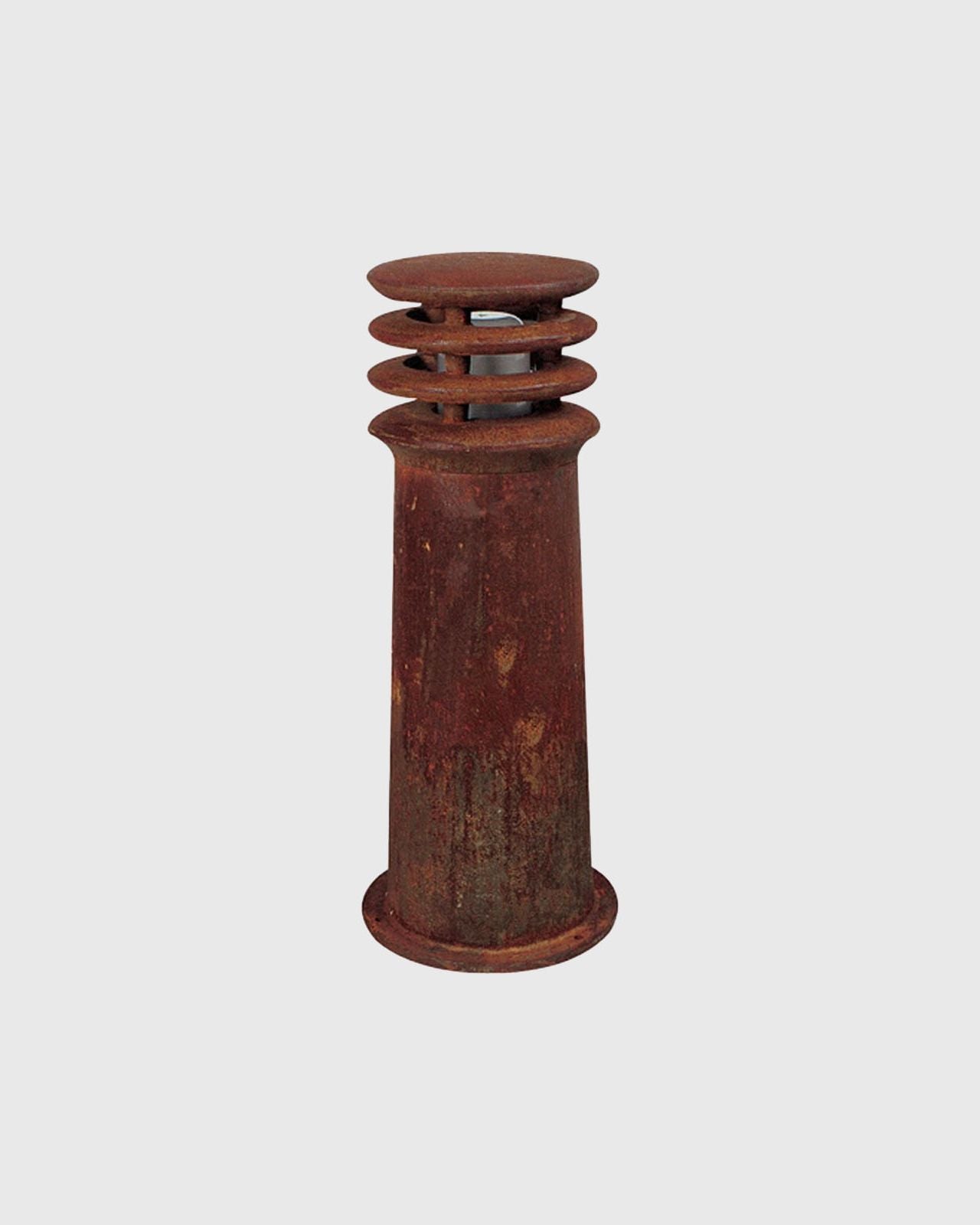 Constructed from cast iron, this Belgian-made bollard light boasts superb quality and timeless appeal. The textured rust finish provides a natural yet contemporary look that blends subtly into gardens. This finish will not continue to rust, showing a very light superficial layer after decades. When dry, it showcases a reddish-brown colour which changes to a deep brown when wet.