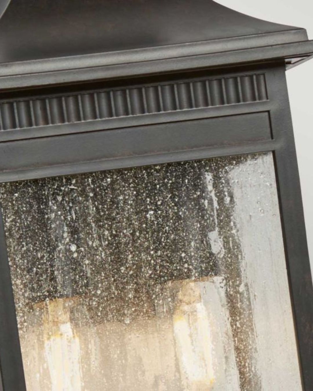 This bronze classic lantern wall light has beautiful seeded glass panels that when illuminated the texture creates a calming ambience and adds intricate detail to your outdoor lighting selections.