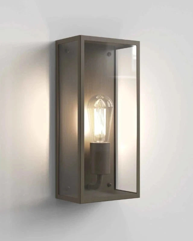 This classic minimalistic outdoor box wall light comes in a textured black and Bronze with a clear glass surround. This light is compatible with both LED bulbs and has an IP44 rating to ensure the durability and quality finishes will withstand the natural elements when placed outside under cover or in the bathroom. This timeless classic would look great on either side of your front door, lighting up your patio, veranda, laundry or bathroom.