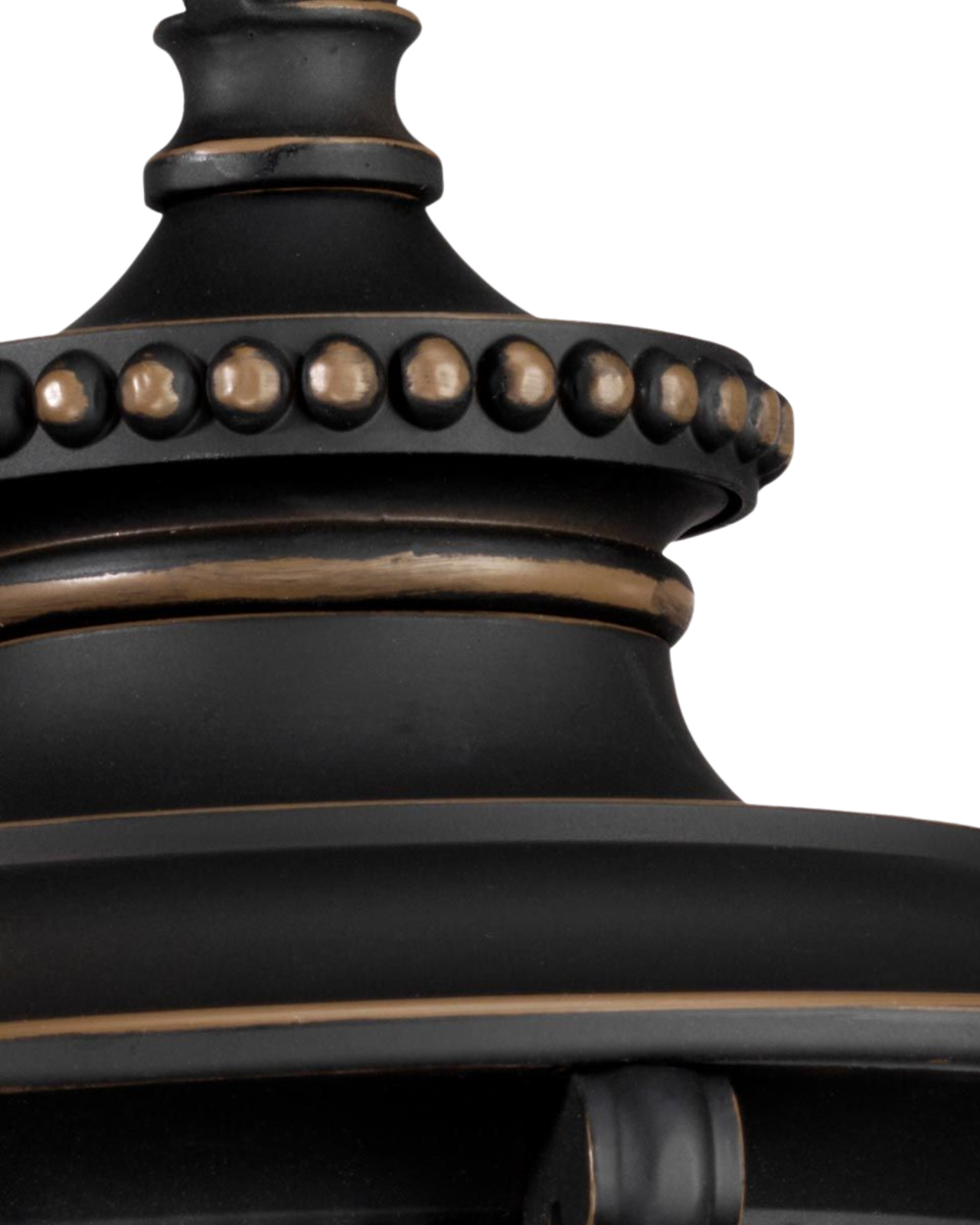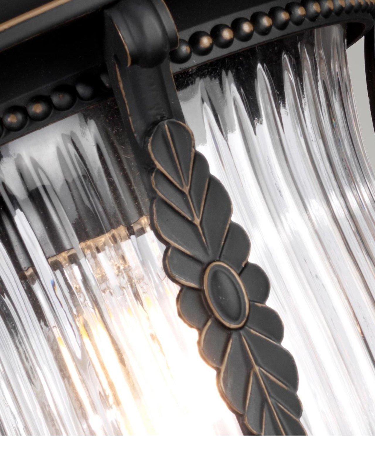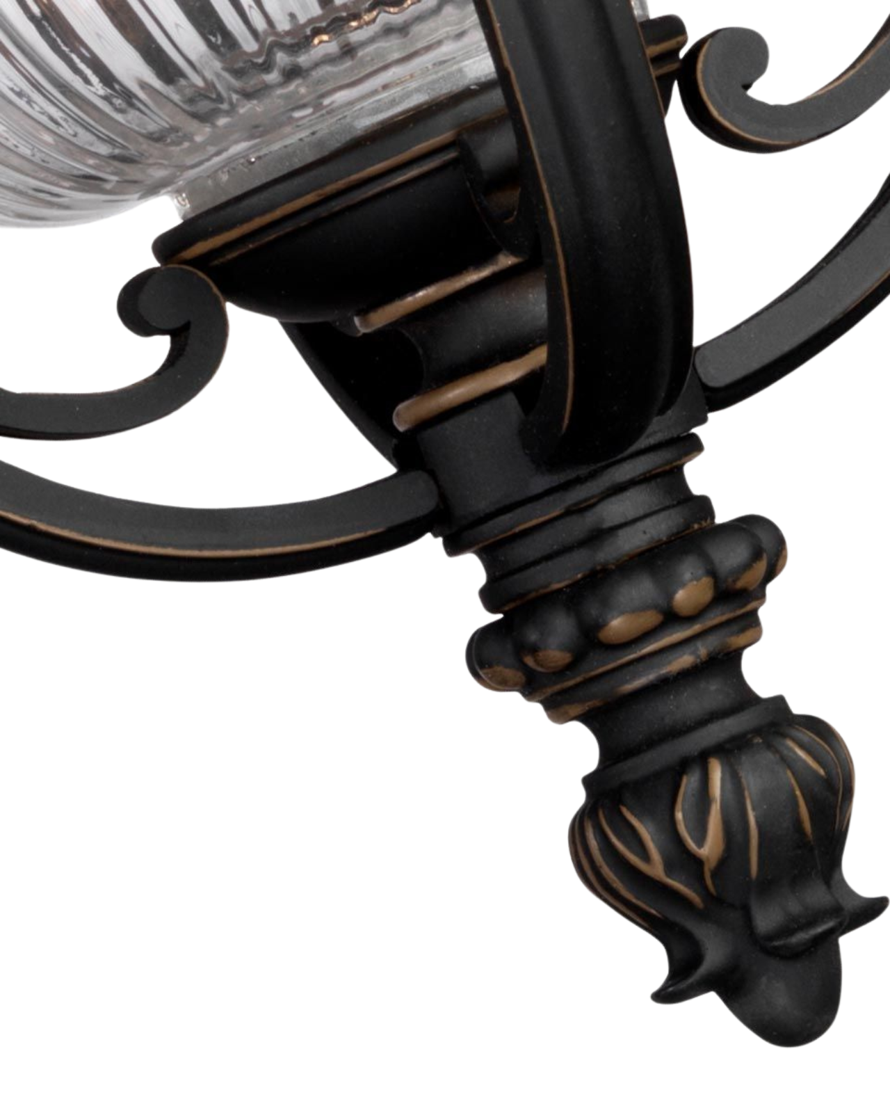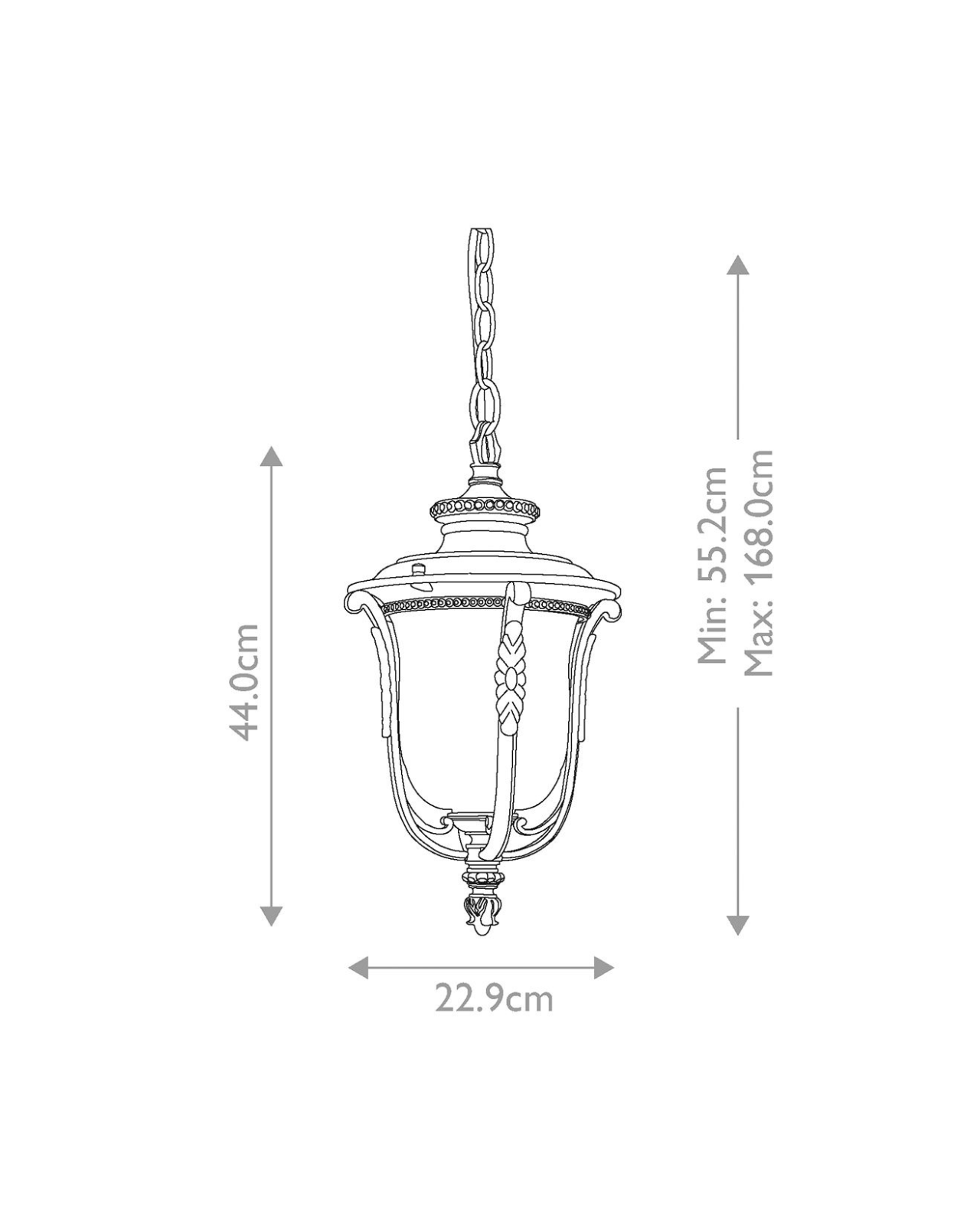 This classical designed lantern features a Rubber Bronze finish which will embellish your outdoors. The nuanced bead patterns, medallions and scrolling of the metalwork emphasises the workmanship when the complementing clear ribbed glass beautifully diffuses the light. This exterior pendant light has a maximum drop of 168cm and will perfectly suit your cover porche, patio or terrace setting the right ambience.