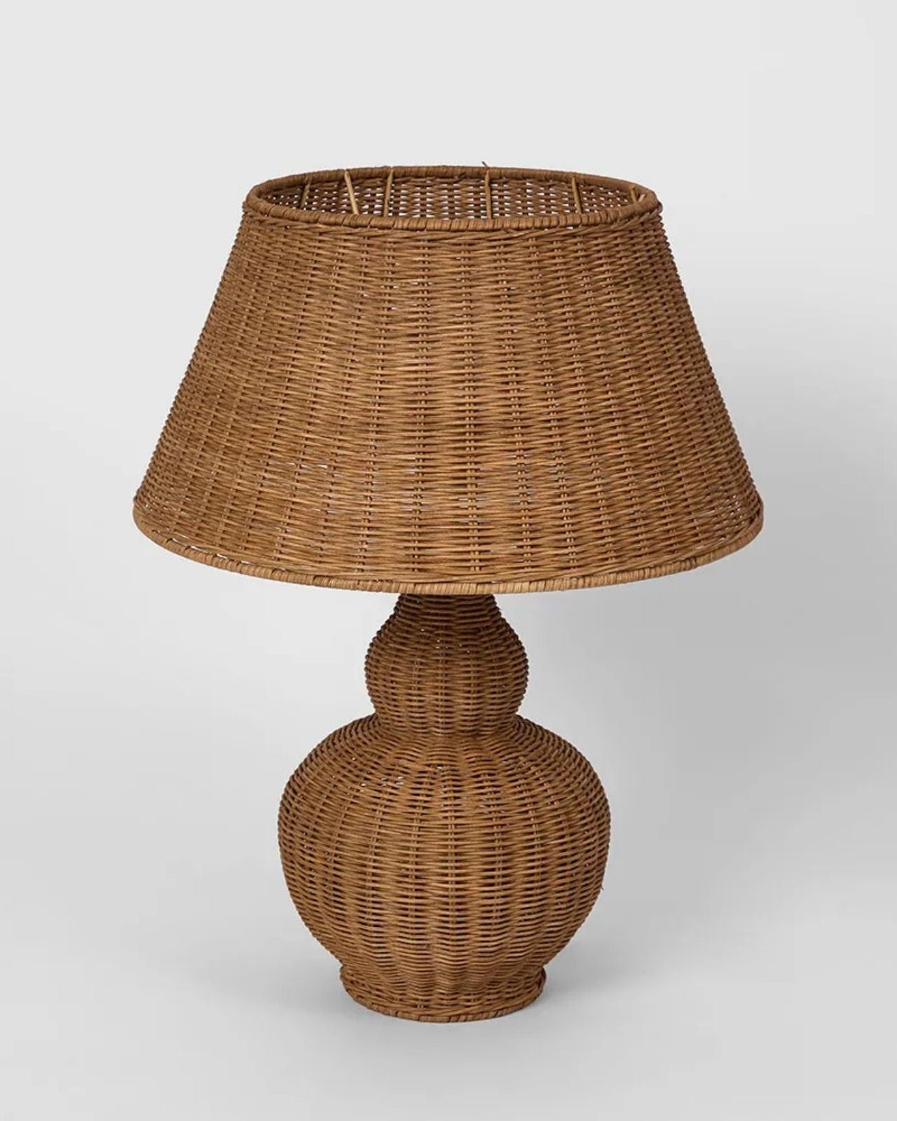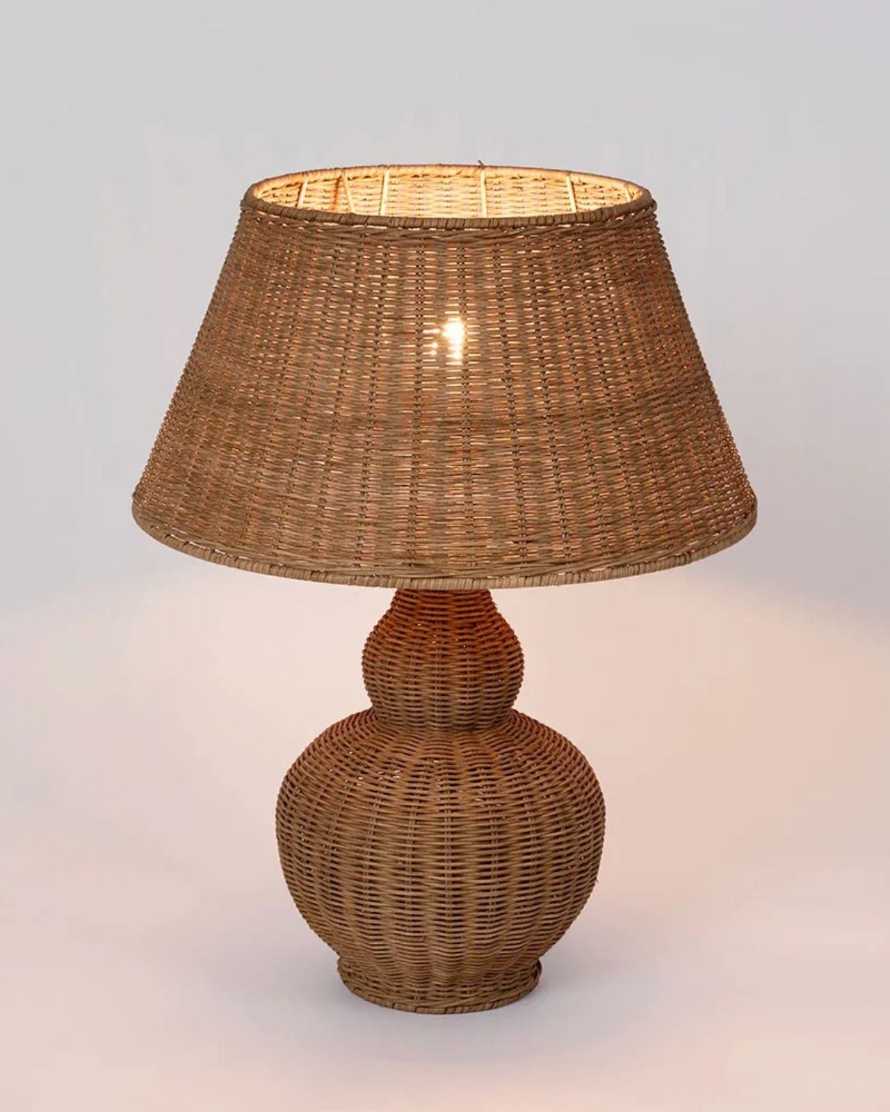 Wicker table lamp with a woven shade on a light gray background