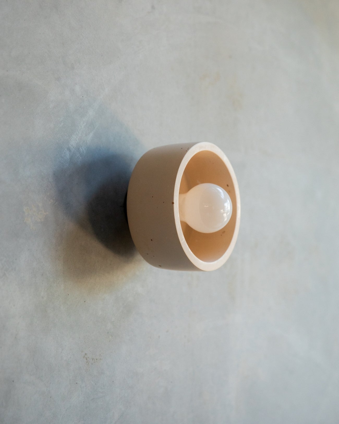 The Cylindrical Concrete Wall Light features a wide cylindrical design that blends minimalist elegance with raw materials. This fitting is made from concrete and glass fibres that are hand-poured locally in Ballina, and is available in a curated palette of earthy tones including charcoal, cocoa, bone white, sand, nude, terracotta, and moss. Perfect for adding soft, ambient illumination to hallways, living spaces, or bedrooms, its understated shape and natural finishes create a warm and inviting atmosphere.