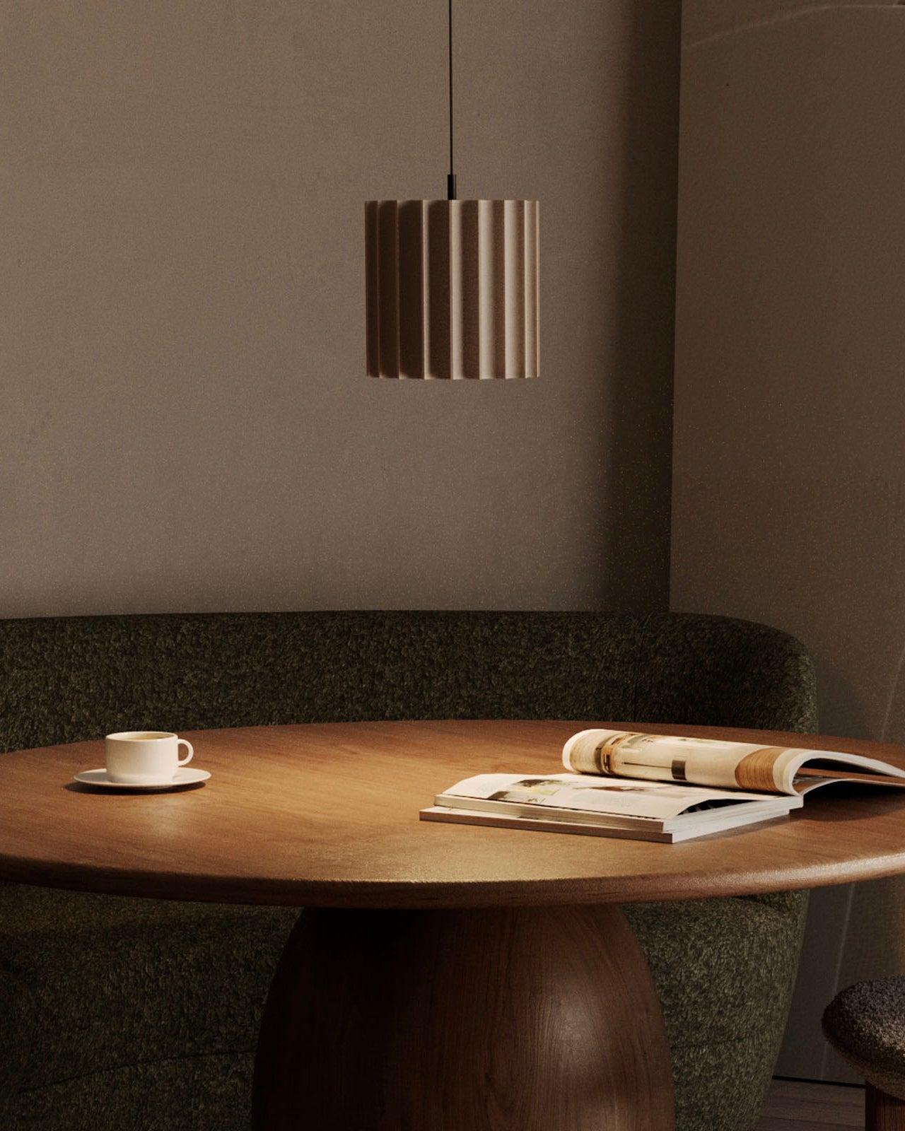 Round wooden table with a cup and books in a room with a Cylindrical Pleated Ceramic Pendant Light and gray walls.