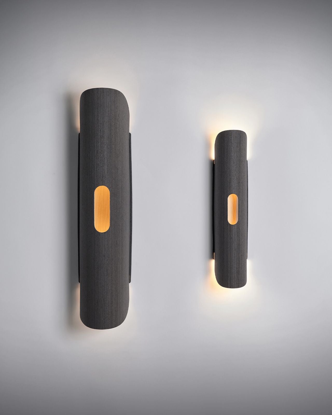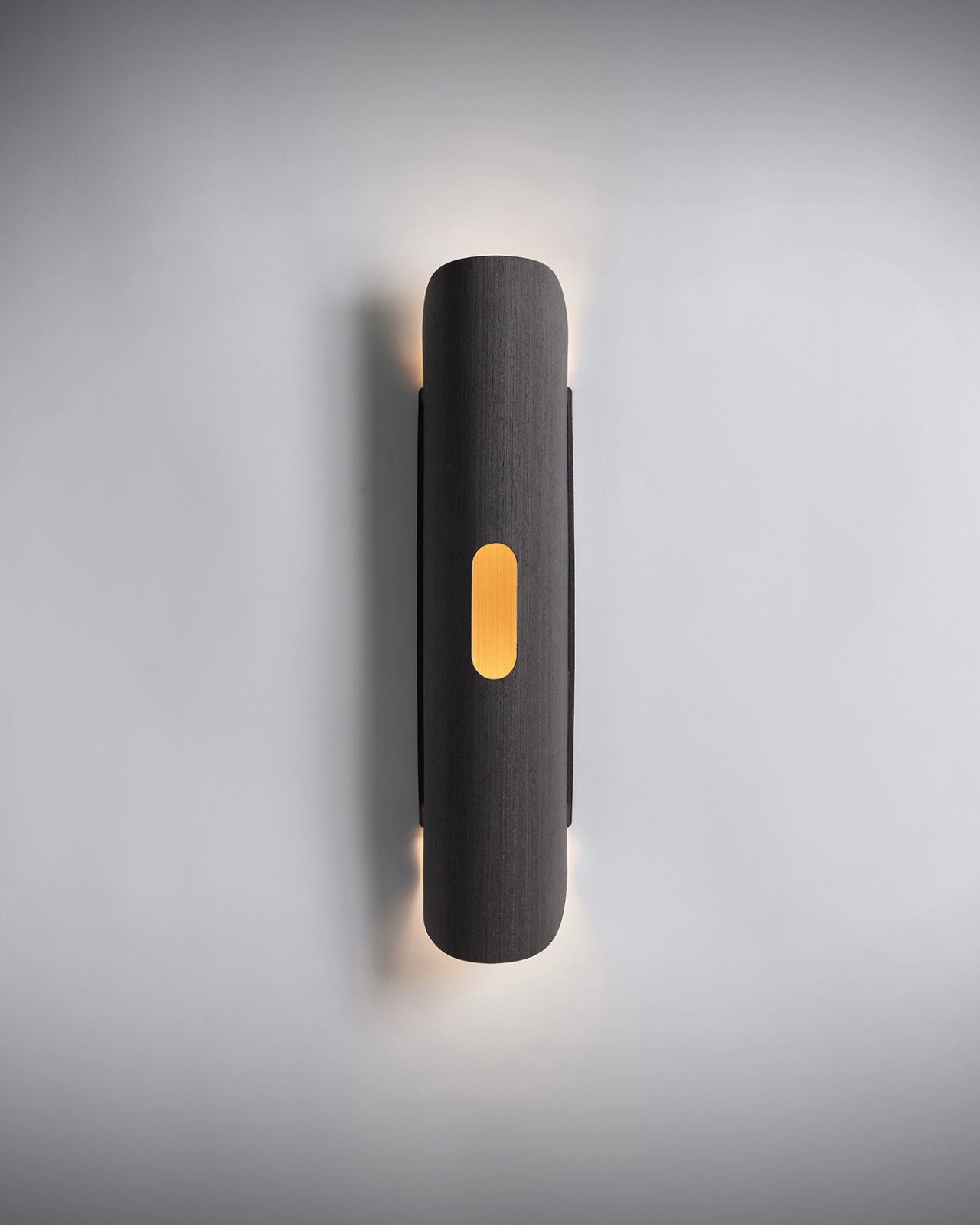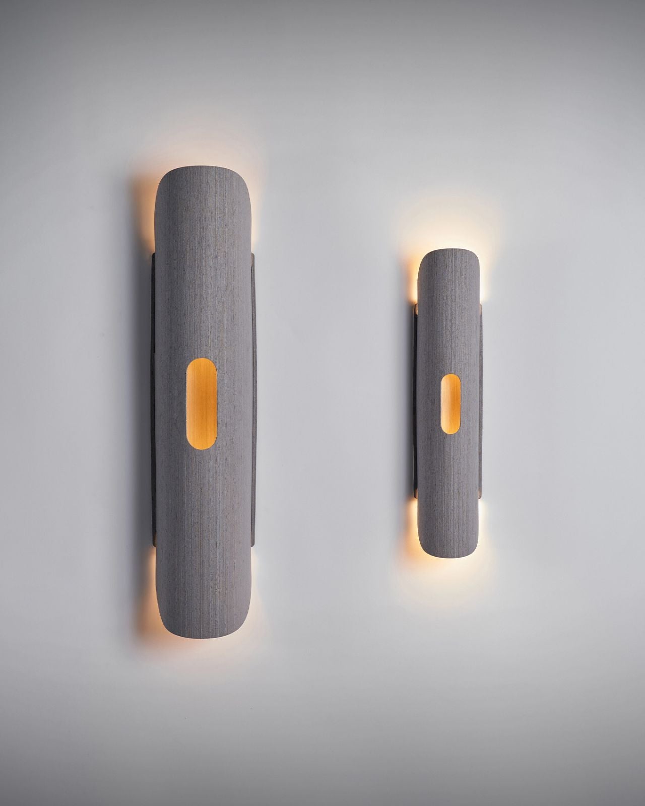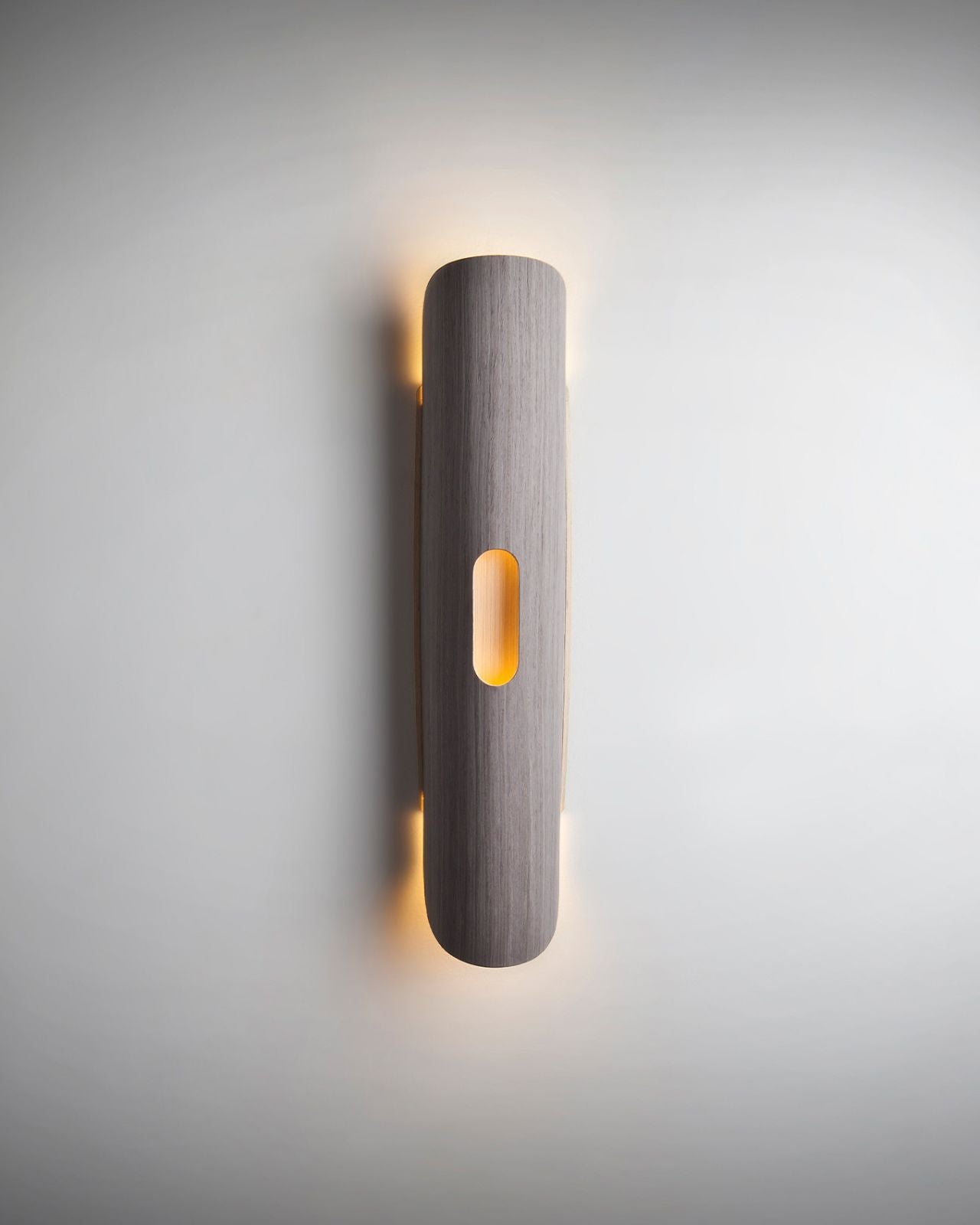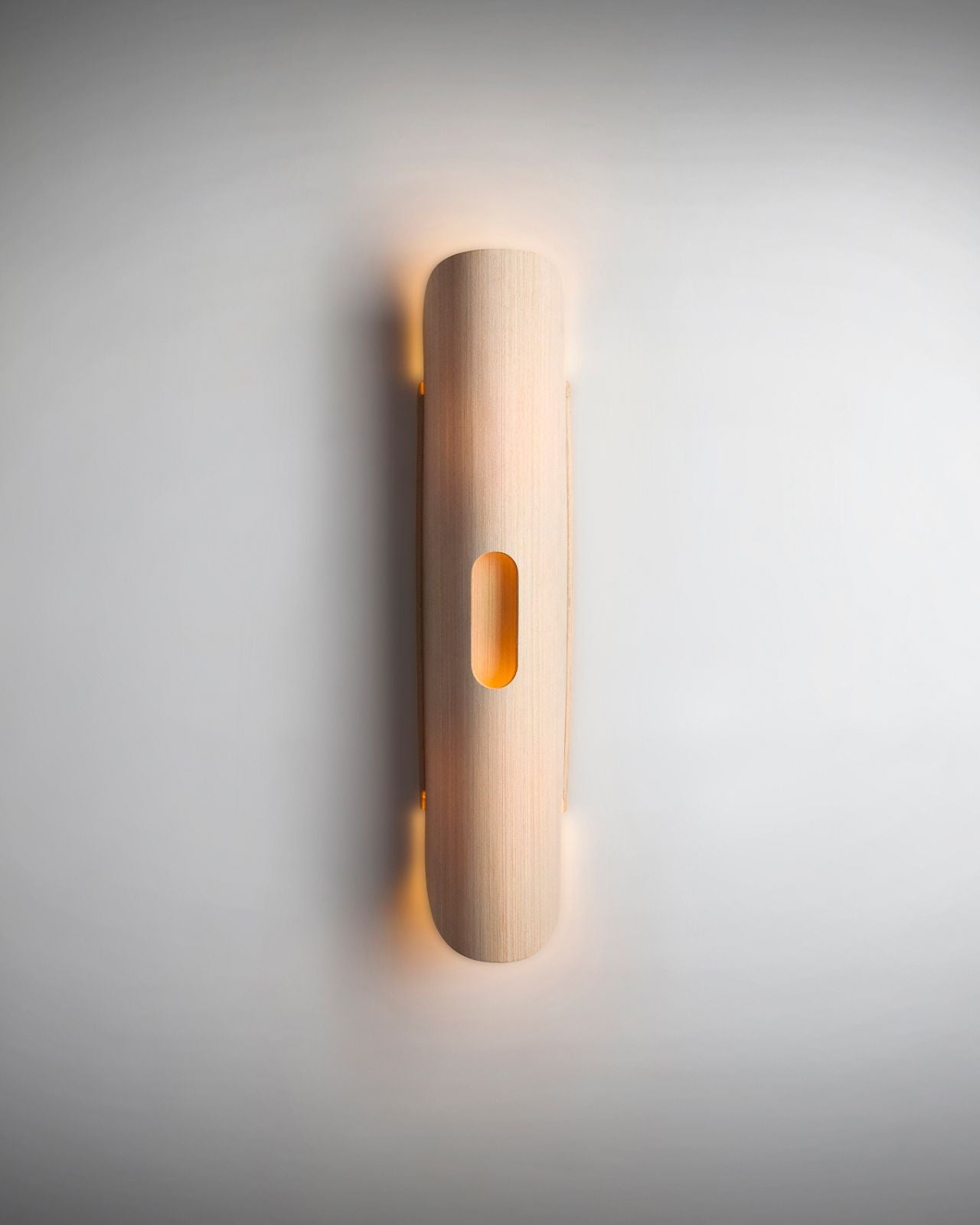 Carefully crafted from flexible wood veneer this wall lamp showcases a curved cylindrical shape that will enhance the walls of living areas, hallways and storefronts. This uniquely aesthetic design softly distributes indirect light. Available in assorted finishes this wall light is designed to suit coastal-luxe and modern interiors. Please note the colour choice is for the interior and exterior of the shade. Please get in contact for custom colours.