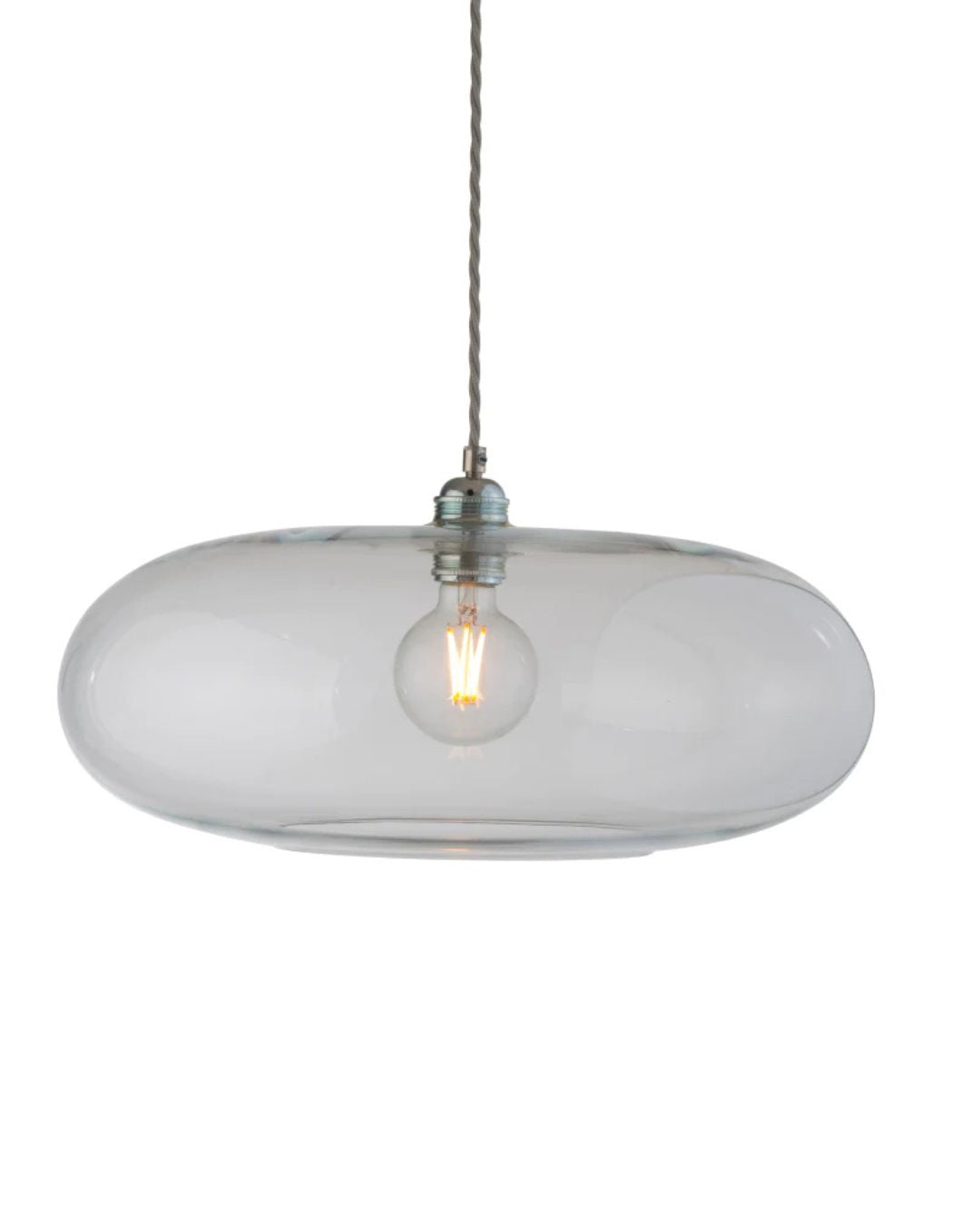 Clear glass pendant light with a visible bulb on a white background