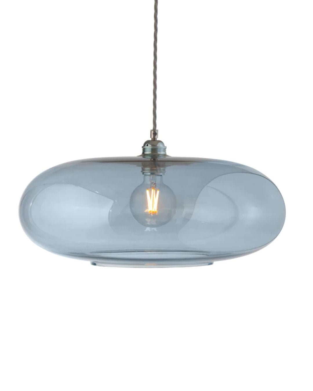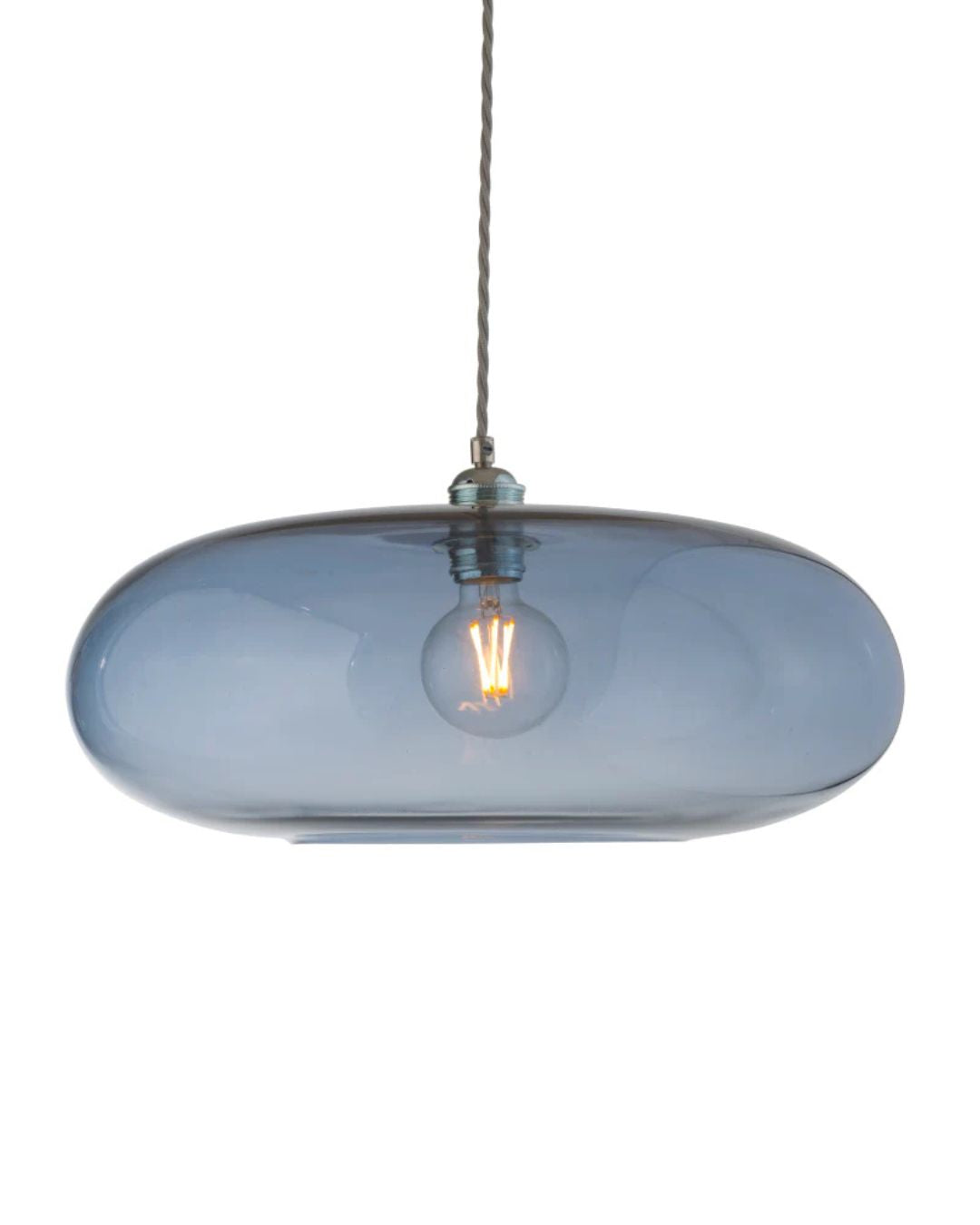 Blue glass pendant light with a visible bulb on a white background