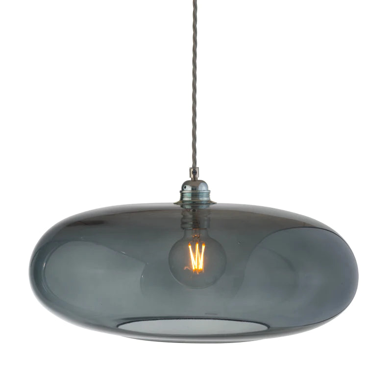 This pendant is an artisan piece that features a wide shape and a shallow height. It is designed and crafted by hand in Denmark, using mouth-blown glass techniques and silver detailing to create a retro aesthetic that adds a touch of sophistication to any interior. You can use it as a single installation to make a focal point in your home or install it as a cluster. It requires an E27 globe, which is not included. You can choose from a variety of sizes and glass colours to suit your interior space.