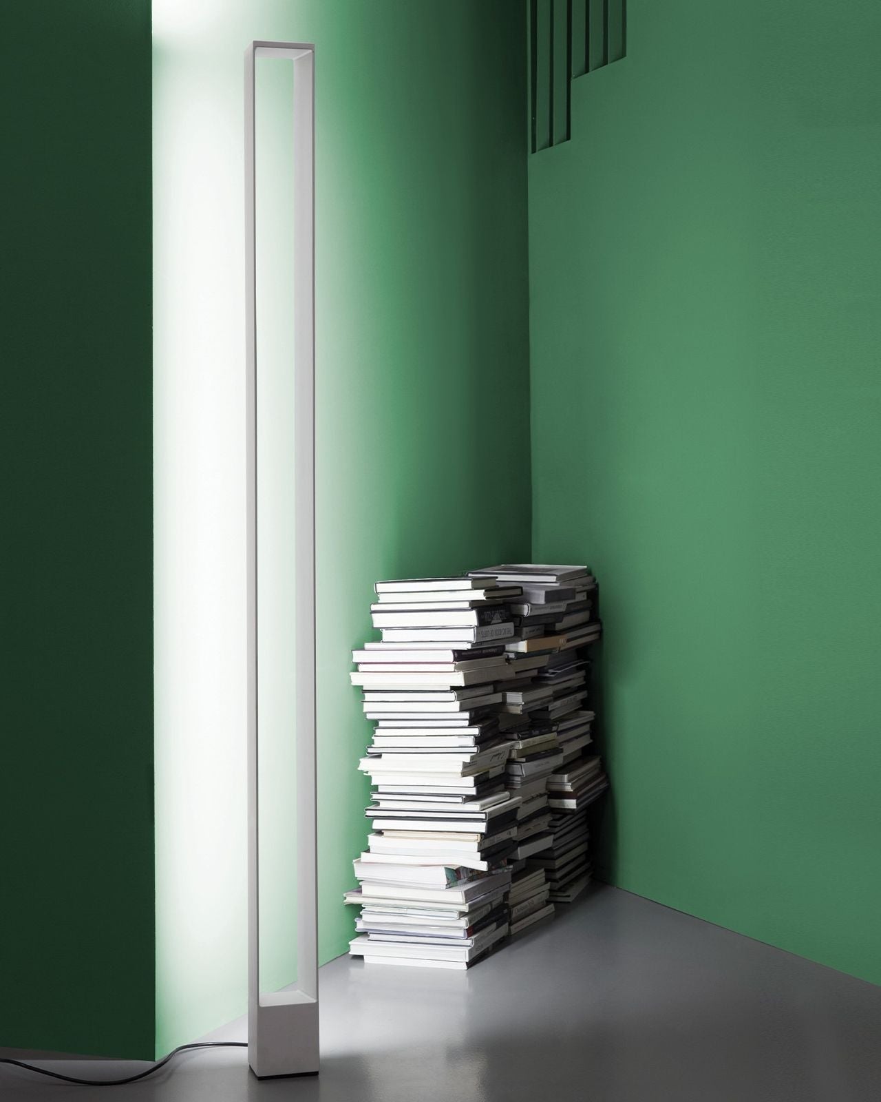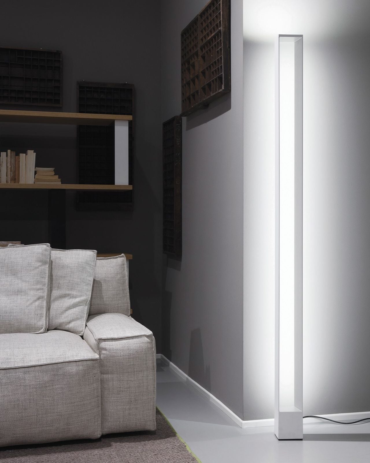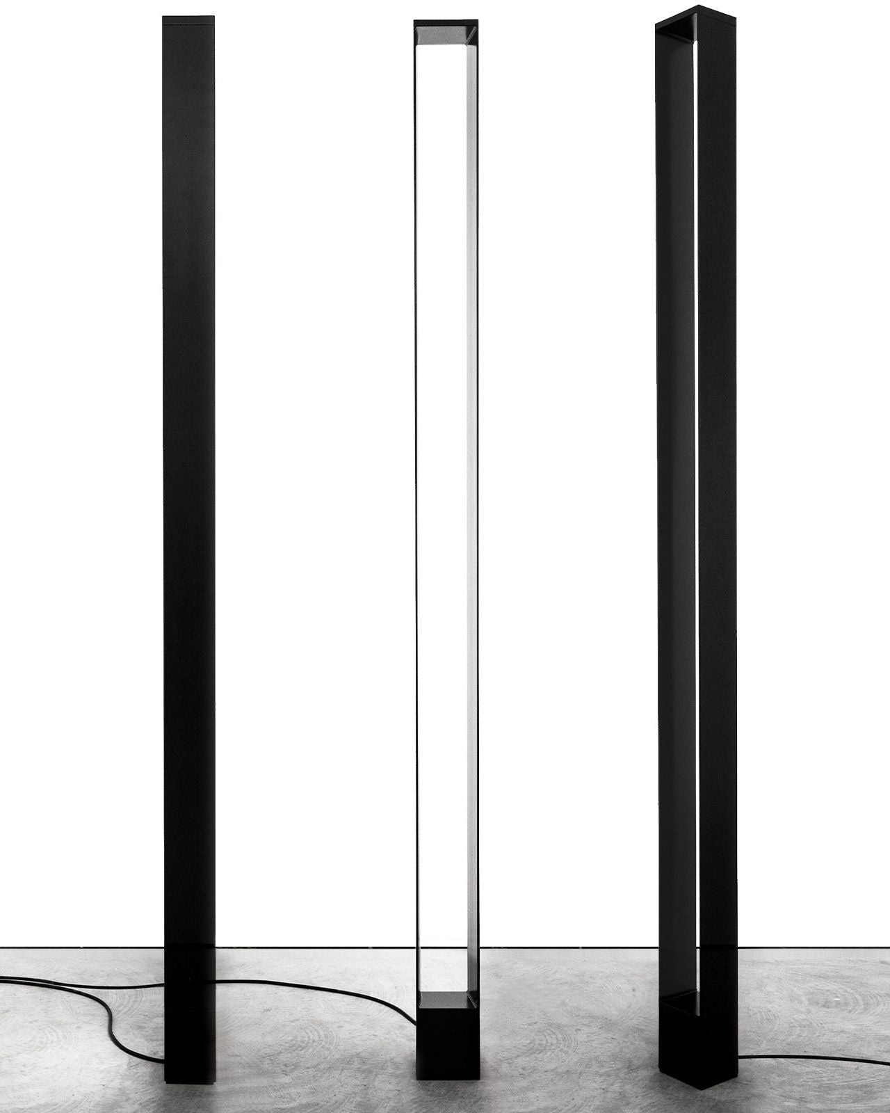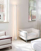 The Dimmable Rectangular LED Floor Lamp with body in extruded aluminium, heads and base in die-casted aluminium, diffusers in opal and transparent metacrylate. Structure painted in matt white or black. The uplight LED source gives the uplight warm and diffused flood, while the side LED provides an indirect ambient light. Dimmable, double switching on the cable.