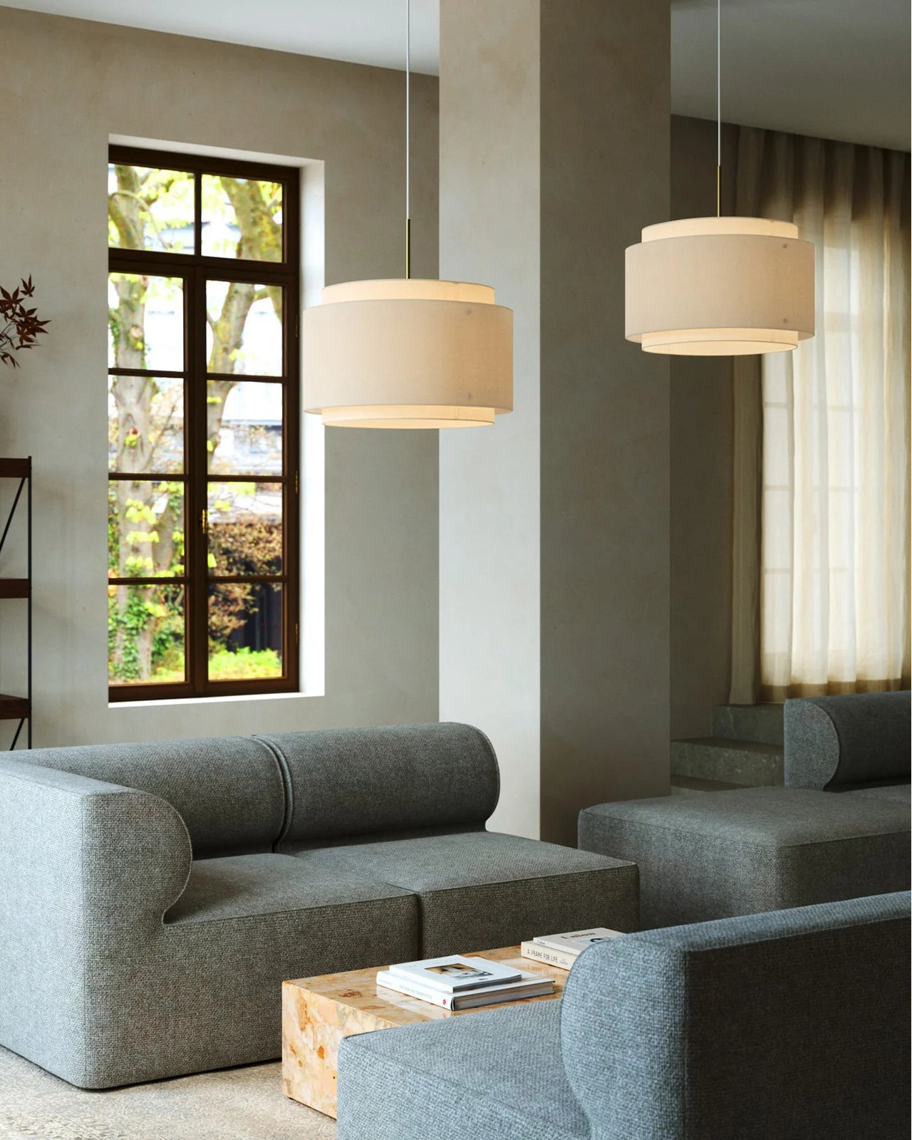 The Double Shaded Fabric Pendant features a modern yet cosy design with two layered fabric shades in a neutral, warm beige colour. The structure creates a soft, diffused glow, making it ideal for ambient lighting in living rooms, dining areas, or bedrooms. Suspended from a fabric cable, complemented by a metallic accent near the top of the shade. The design blends minimalist and Japandi aesthetics, creating a soft and warm design language.