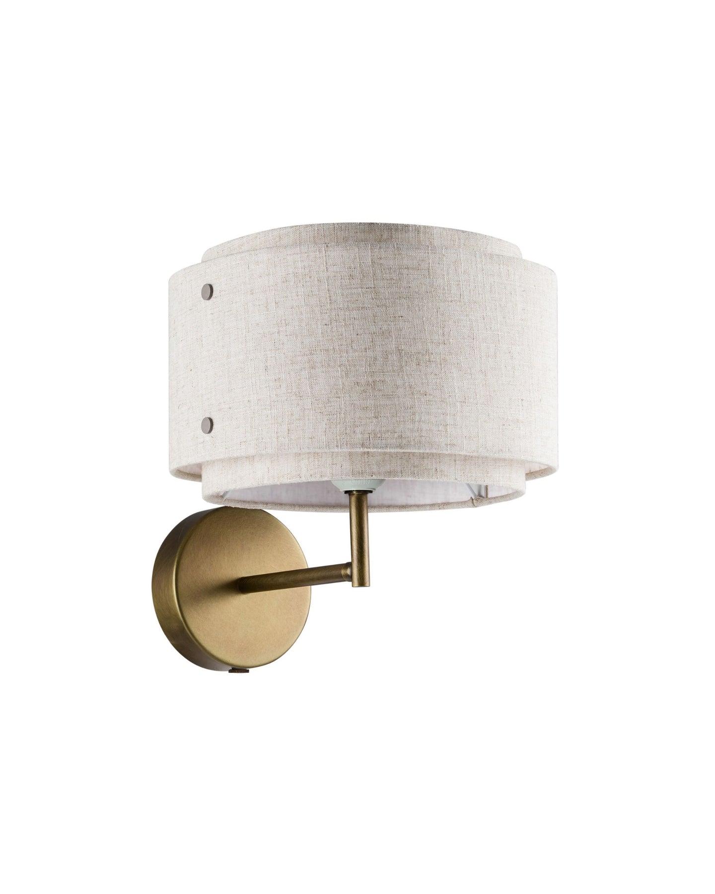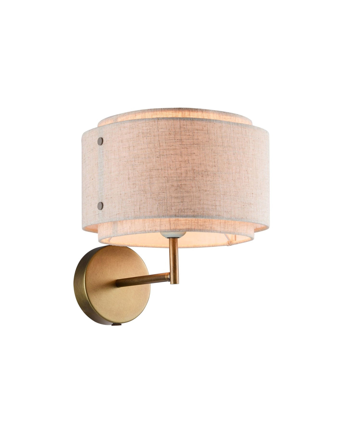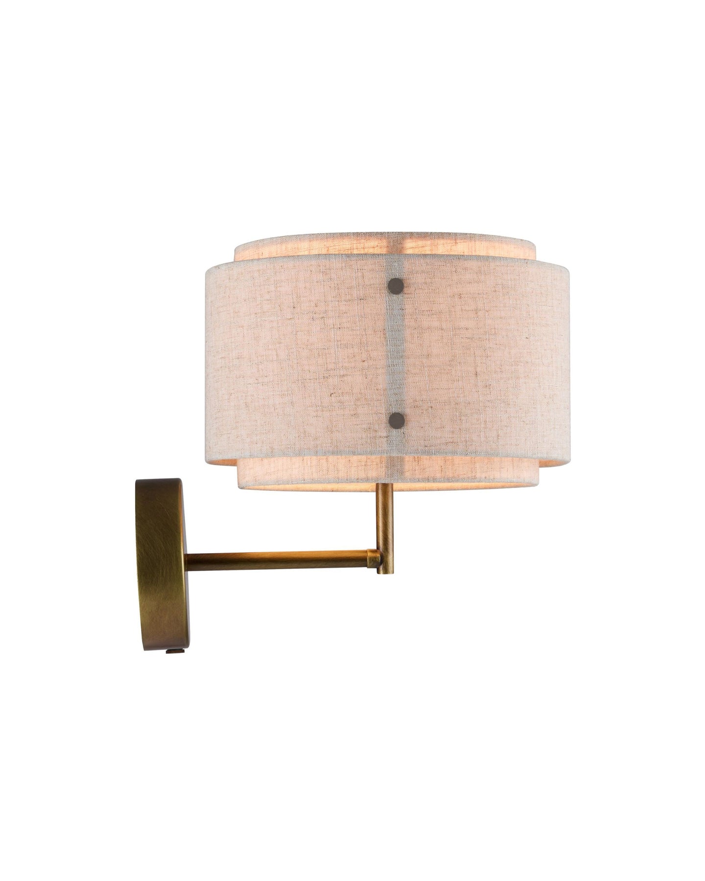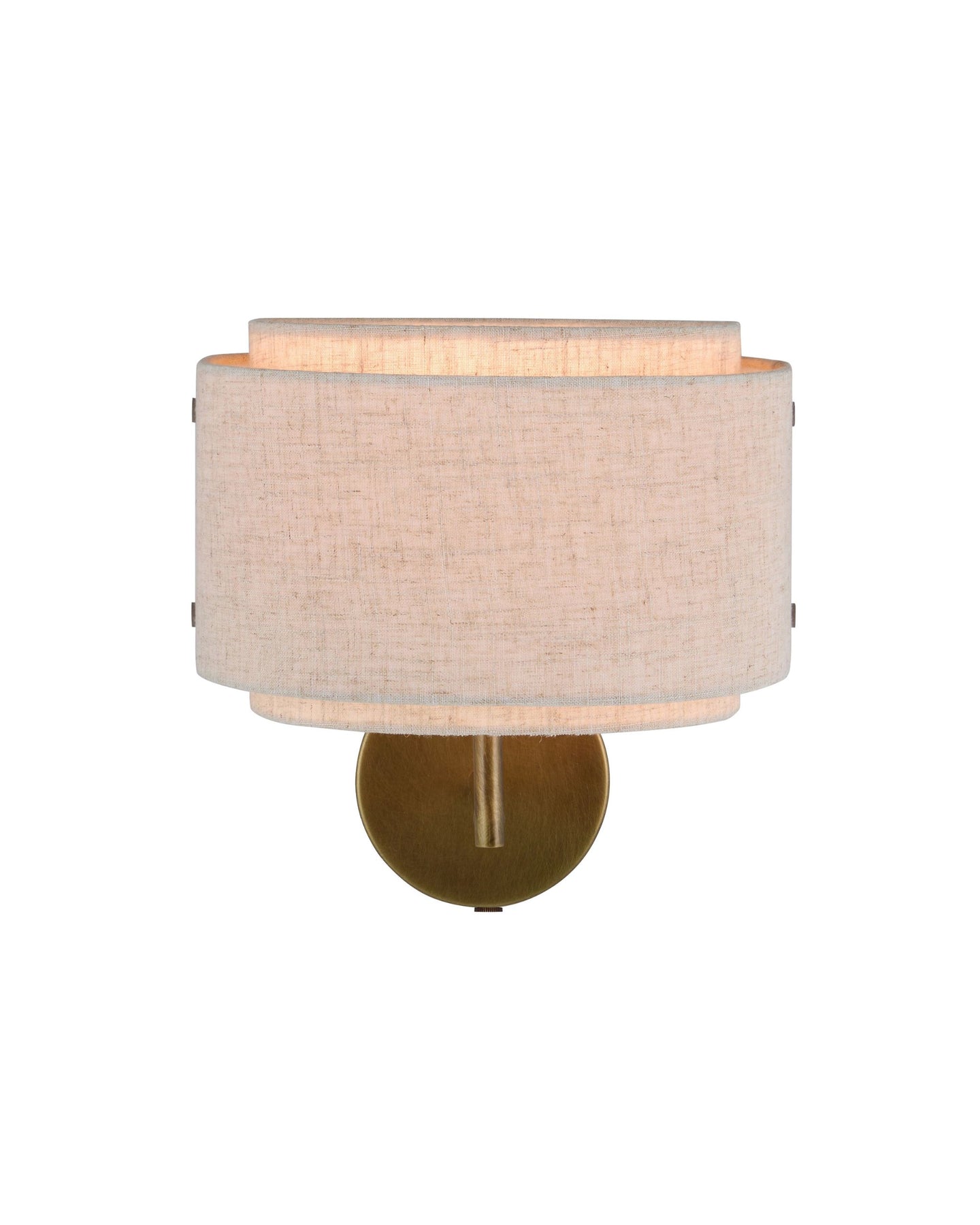 The Double Shaded Fabric Wall Sconce blends minimalist and Japandi aesthetics. Featuring an elegant double-shaded fabric shade overlapping layers of light beige linen fabric, creating a soft, diffused glow to enhance warmth in neutral spaces. The fixture is supported by a round metal base with a burnished brass finish, adding a sophisticated charm. A short metal arm extends from the base, holding the shade in place while maintaining a clean and balanced design.