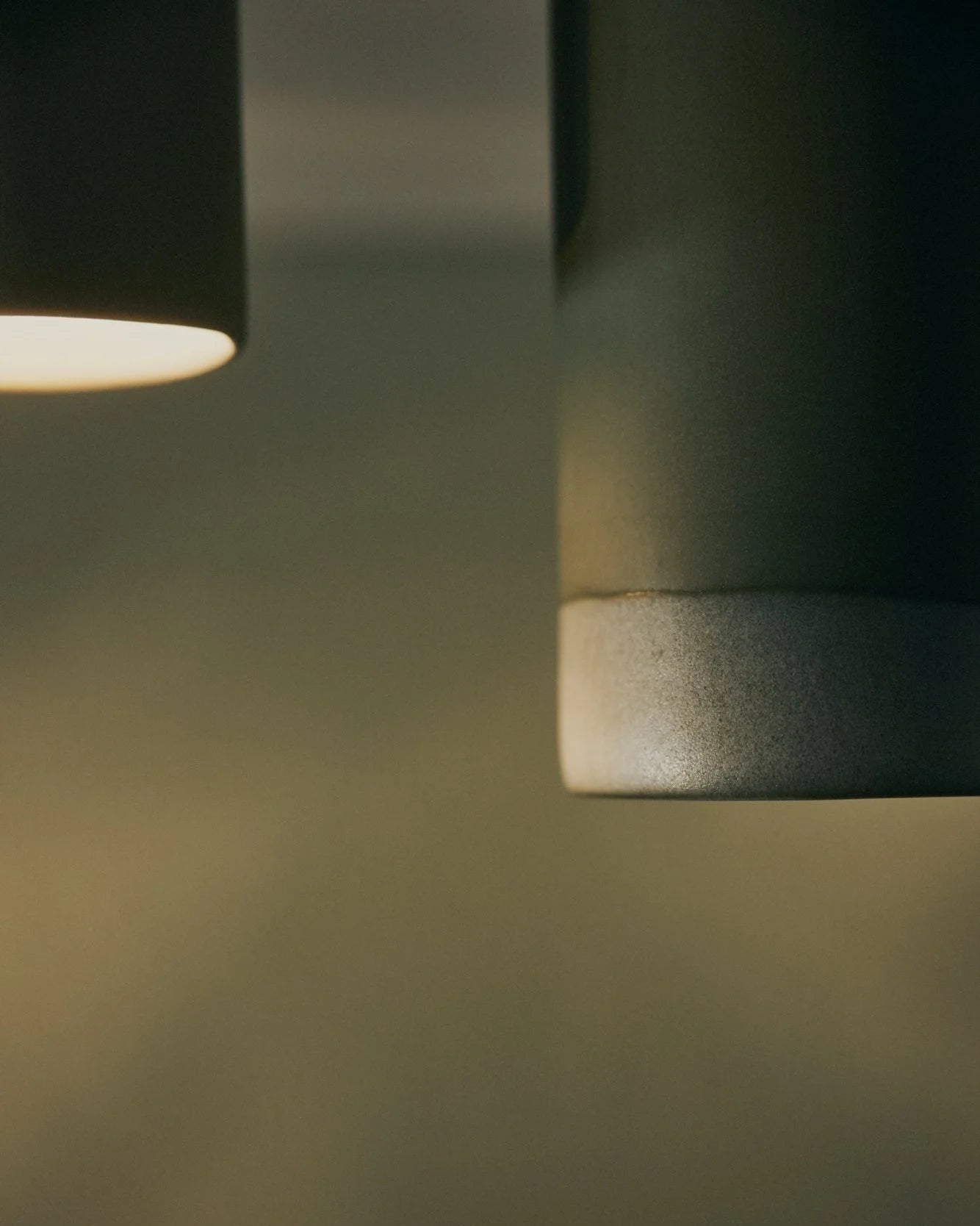 Two cylindrical Dusked ceramic ceiling lights casting shadows on a textured wall.