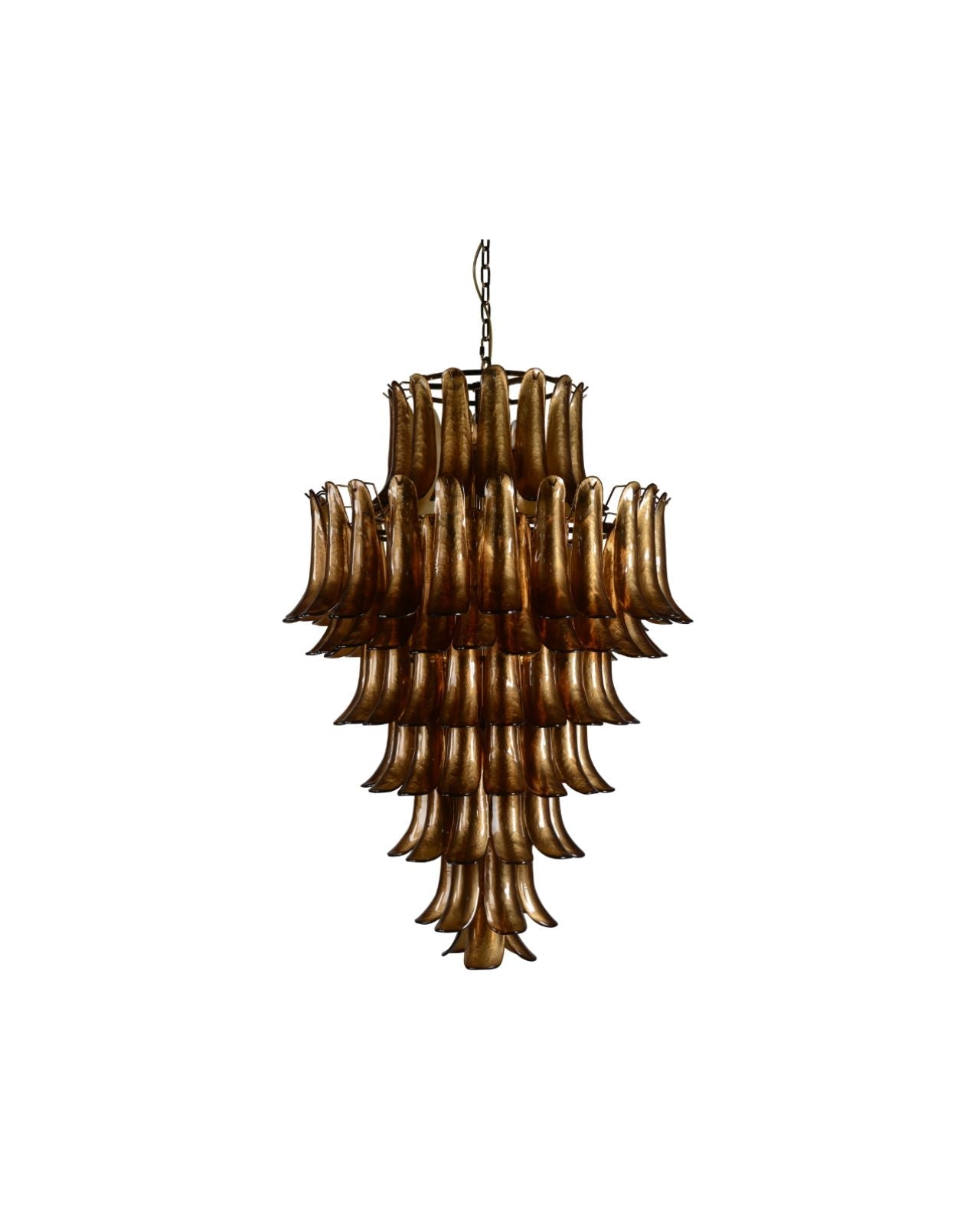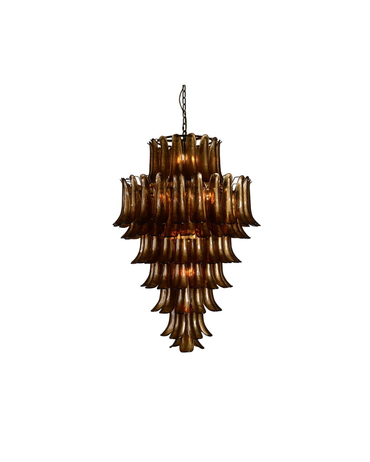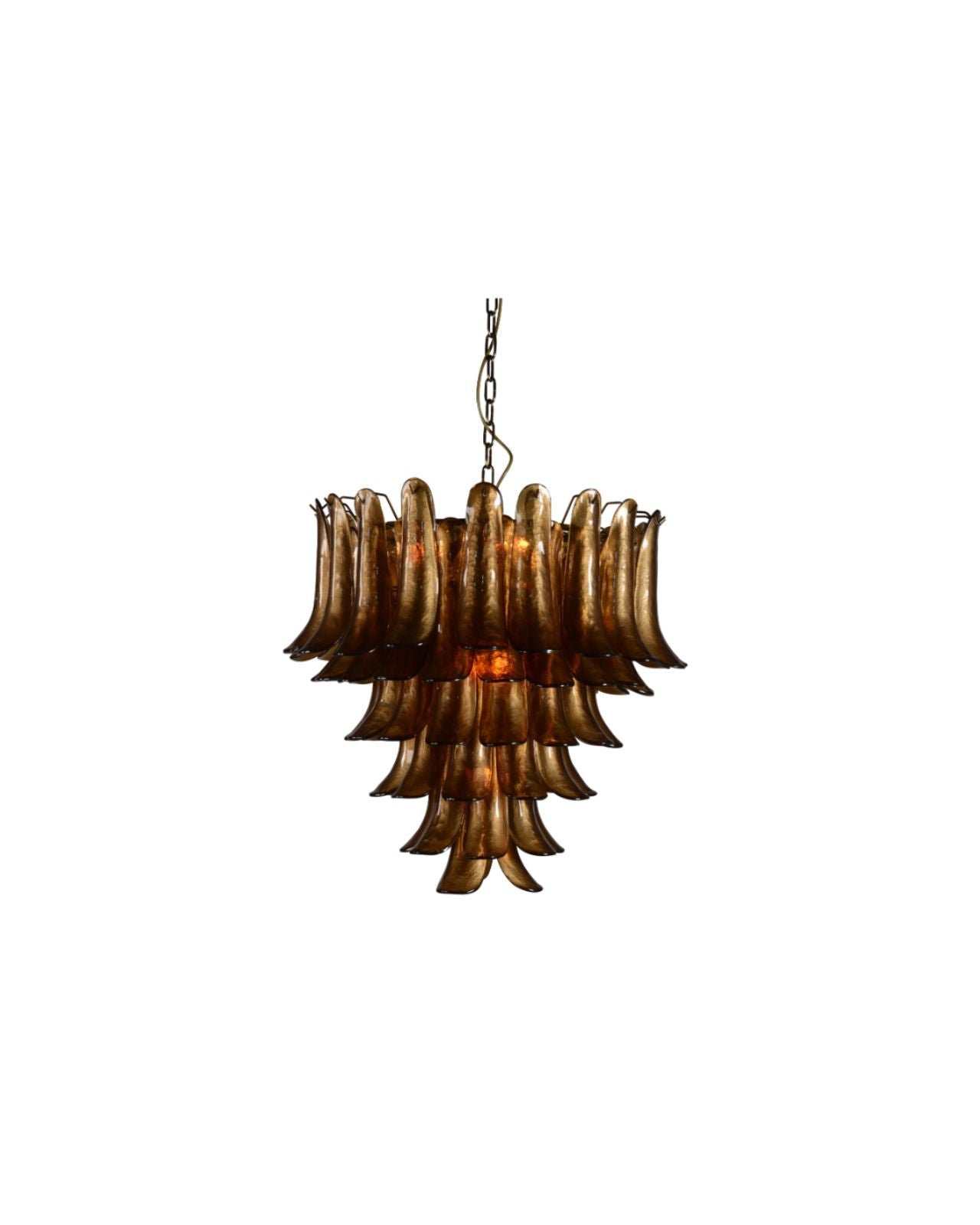 The Eclectic Tinted Glass Chandelier is a visually striking addition for both commercial and residential settings. Select from a small or large size in either a contemporary rose tint or a bold amber tint to perfectly suit the space. Enhance the visual appeal with warm and bright lightbulbs, casting captivating refractions and shadows. This pendant, featuring a chain suspension, complements traditional as well as eclectic-inspired decor.
