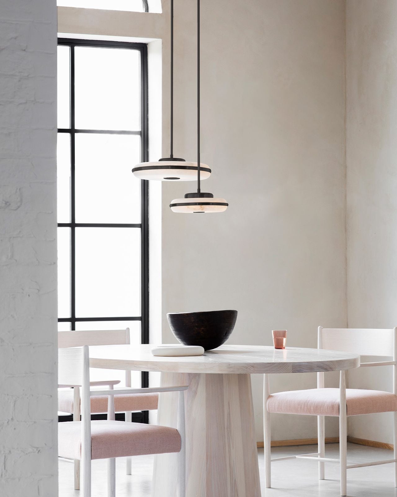 Ideal in a study room, bedroom or living room, this pendant light features a round stone diffuser horizontally suspended from a solid brass stem, available in a range of finishes. The unique veining of the alabaster used for this fixture as well as the brass details will bring style and elegance to homes while creating an inviting atmosphere. This pendant is available in two sizes, making it versatile for both single and clustered installation, perfect for creating a dynamic display by varying the heights.