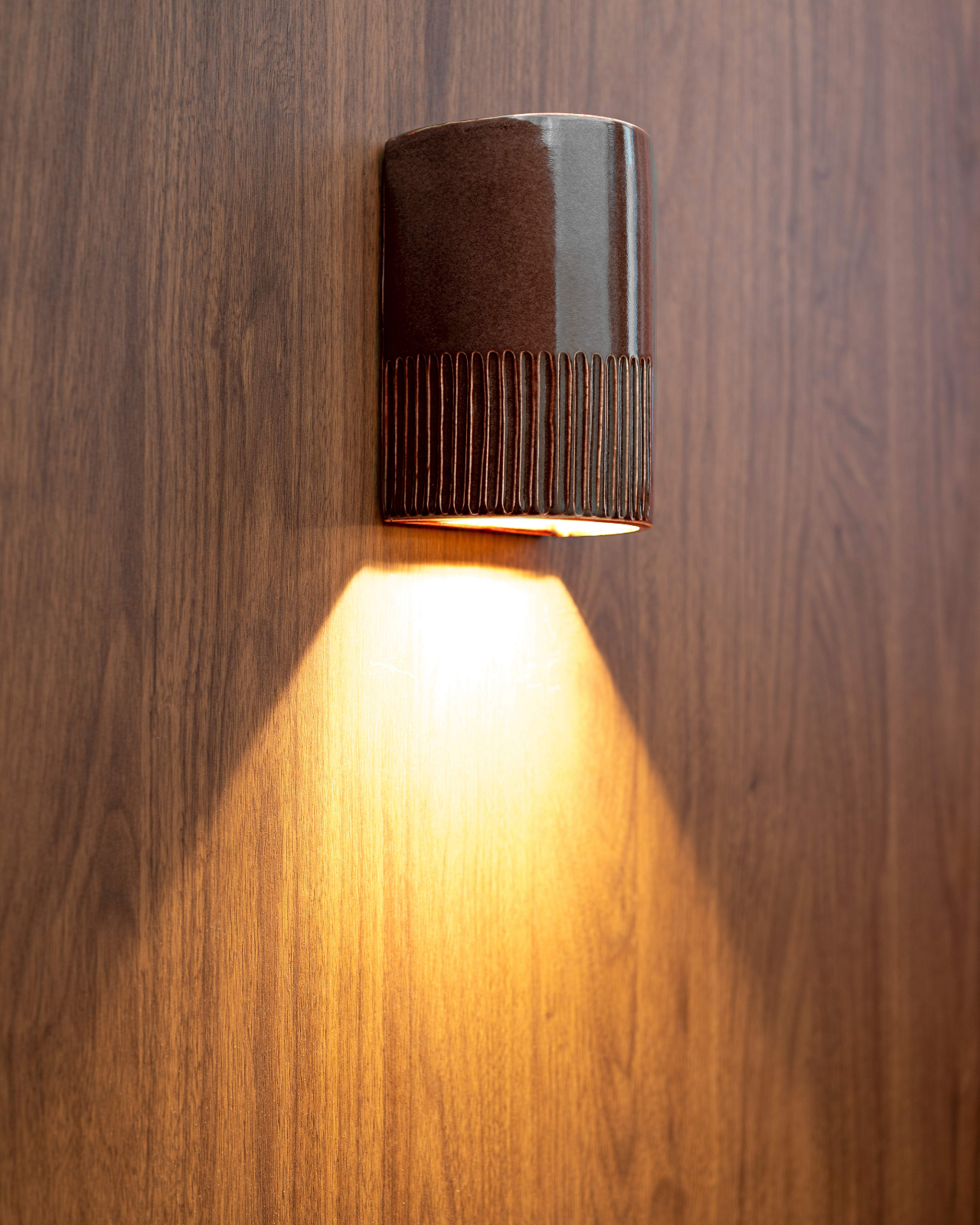 Handmade Ceramic Gloss Wall Light | Day Choccy Milk Tall Light On