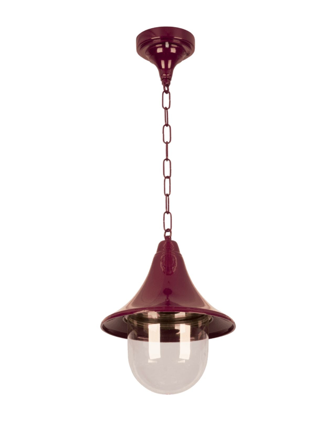 Produced in Italy and coated with powder in Australia, this pendant light, ideal for both residential and commercial outdoor areas, adds a touch of style to any setting. Equipped with a strong industrial chain and a classic die-cast aluminum shade, it comes in a variety of colours - Burgundy, Green, Black, and White - and features a versatile E27 lamp holder that accommodates a wide range of bulbs to help you create the perfect ambience.
