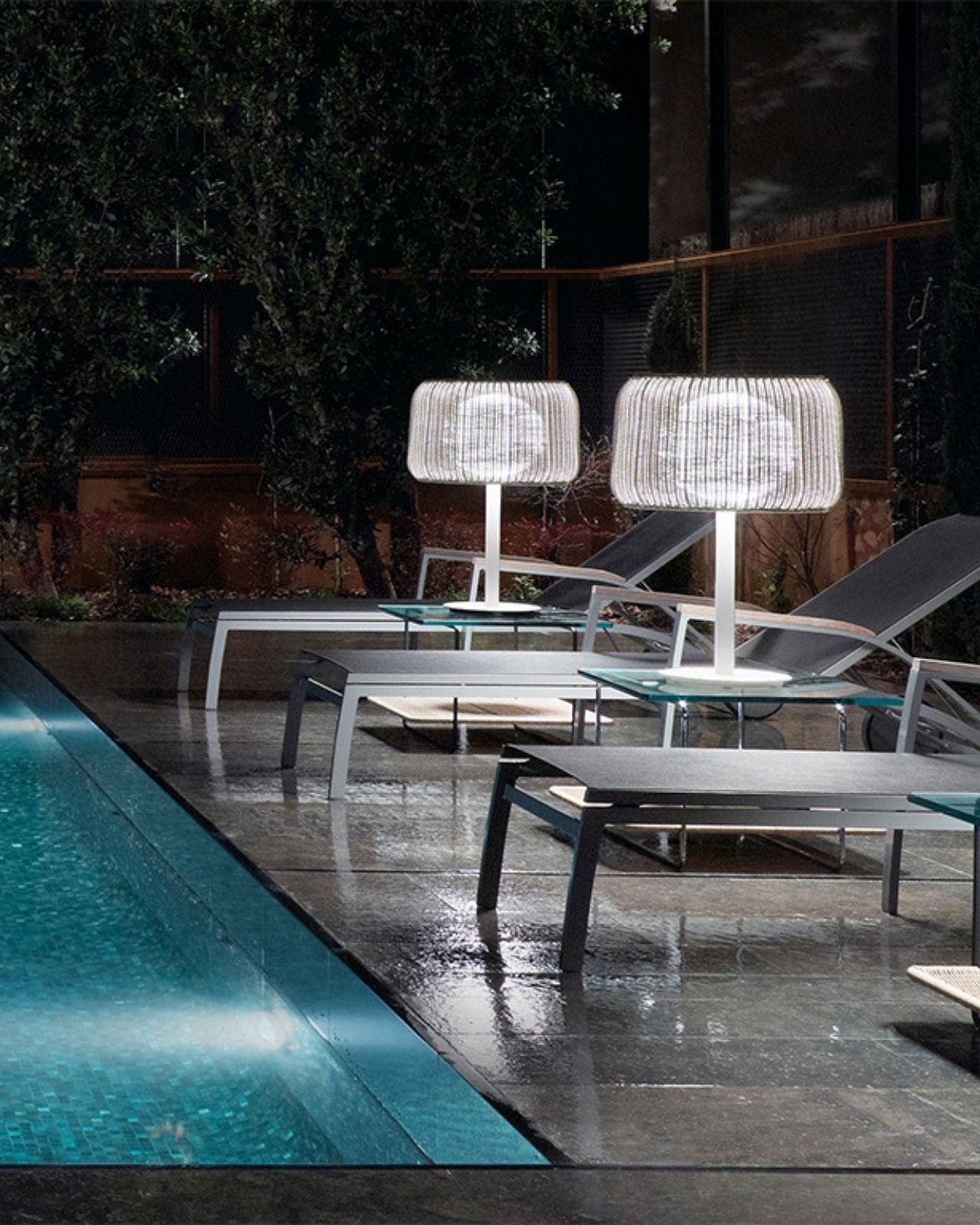 Designed and crafted in Barcelona, Spain, this table lamp offers an exquisite lighting solution for outdoor spaces. Made from hand-woven recyclable synthetic fibre and paired with a UV-protected diffuser, the lamp boasts an IP66 rating, ensuring it can withstand external elements. It is available with a light beige shade and a natural base, or a rattan brown shade with a graphite brown body, making it a versatile choice for a range of outdoor settings, from restaurants to personal entertainment spaces.