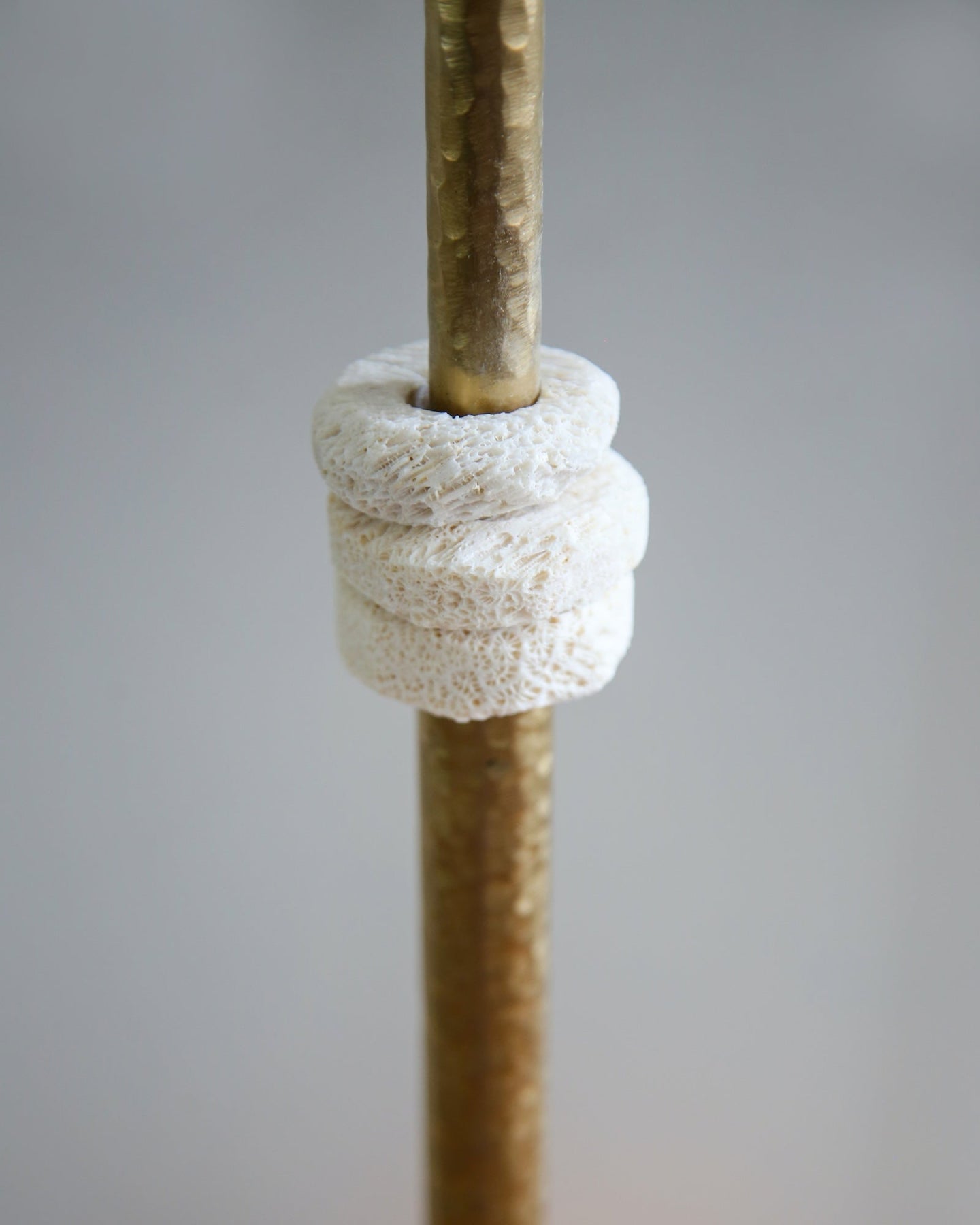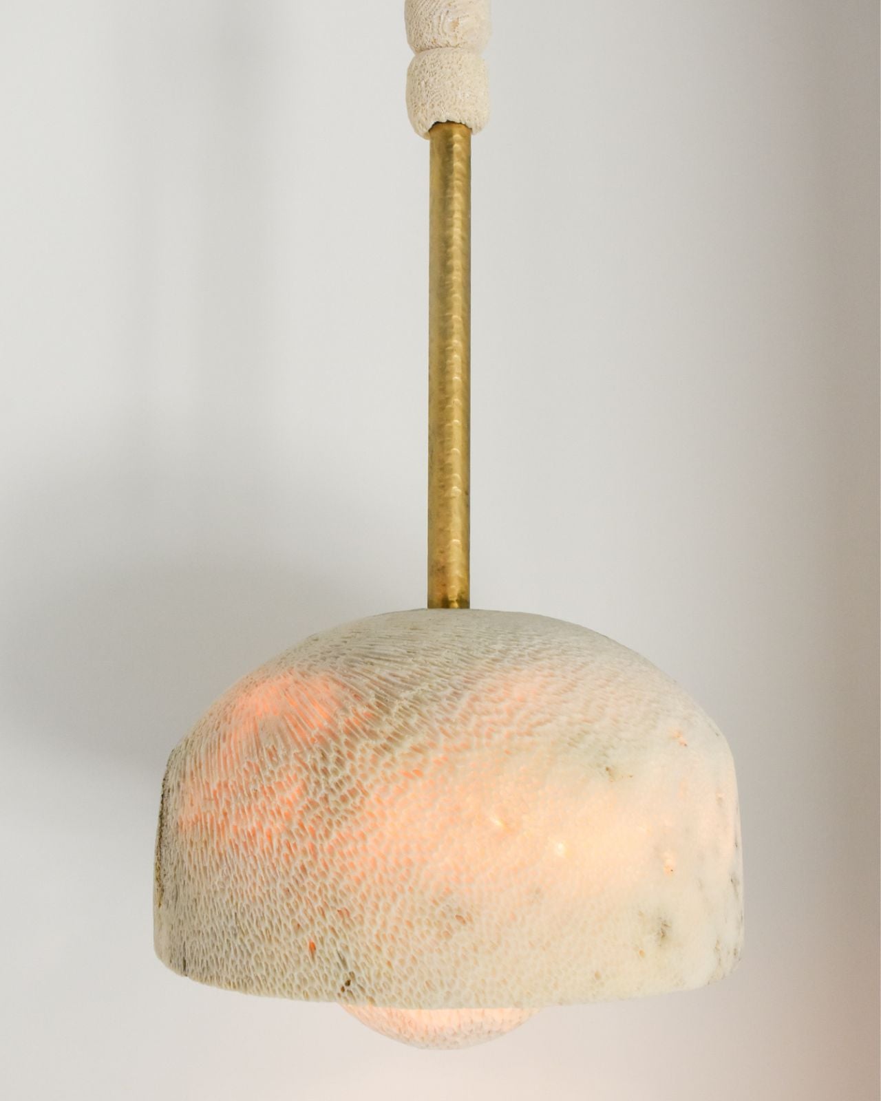 Pendant light with textured fossil coral shade and brass fixture on a neutral background