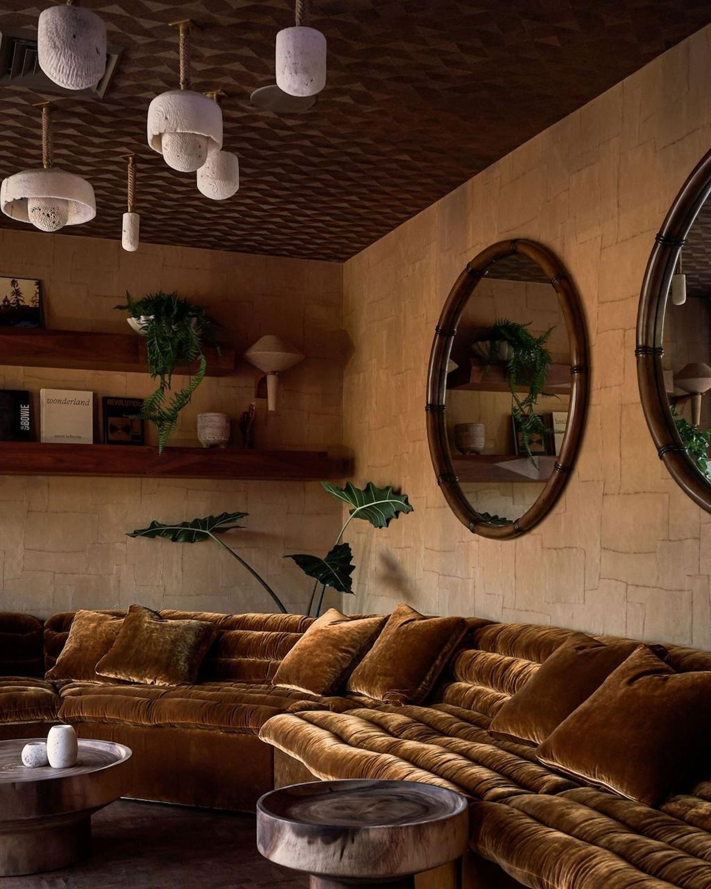 Cozy living room with brown velvet sofa, round wooden tables, and decorative mirrors.