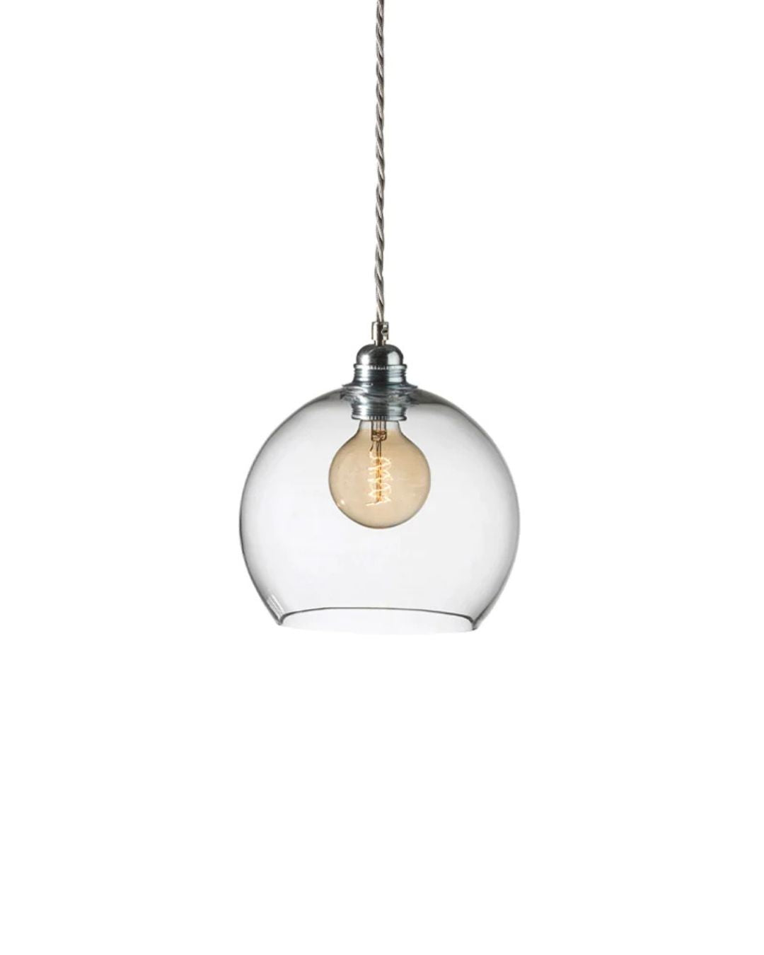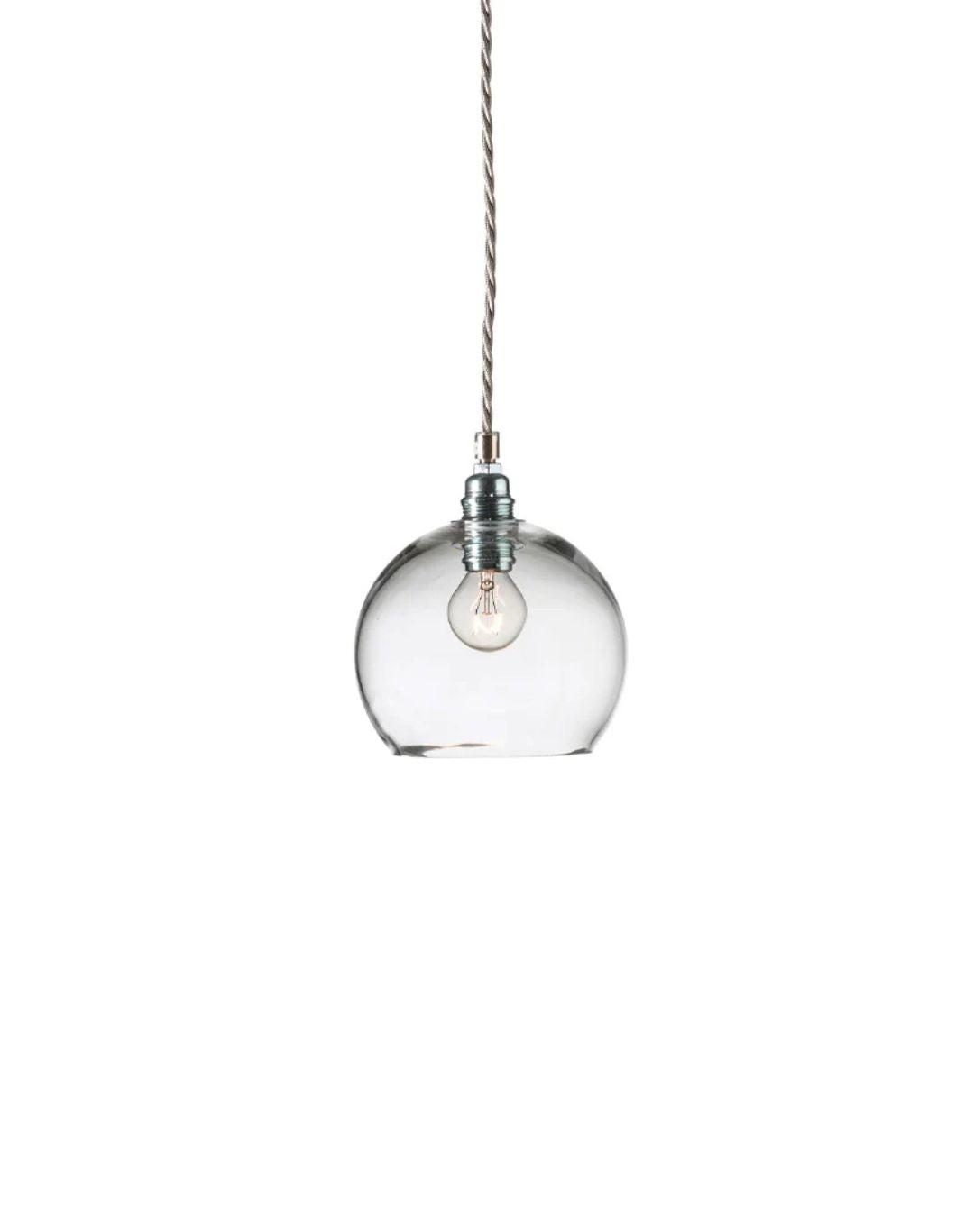 This timeless modern pendant light features a mouth-blown glass shade, a metal fitting, and a twisted silver woven textile cord. The Glass Silver Metal Spherical Pendant will stand out in living rooms, bedrooms, or kitchens, on its own or as a cluster with an adjusted suspension height, shade size, and colour. Available in four sizes and in clear, smokey grey, topaz blue, or deep blue. Due to the manufacturing process, there may be small air inclusions or slight deviations.