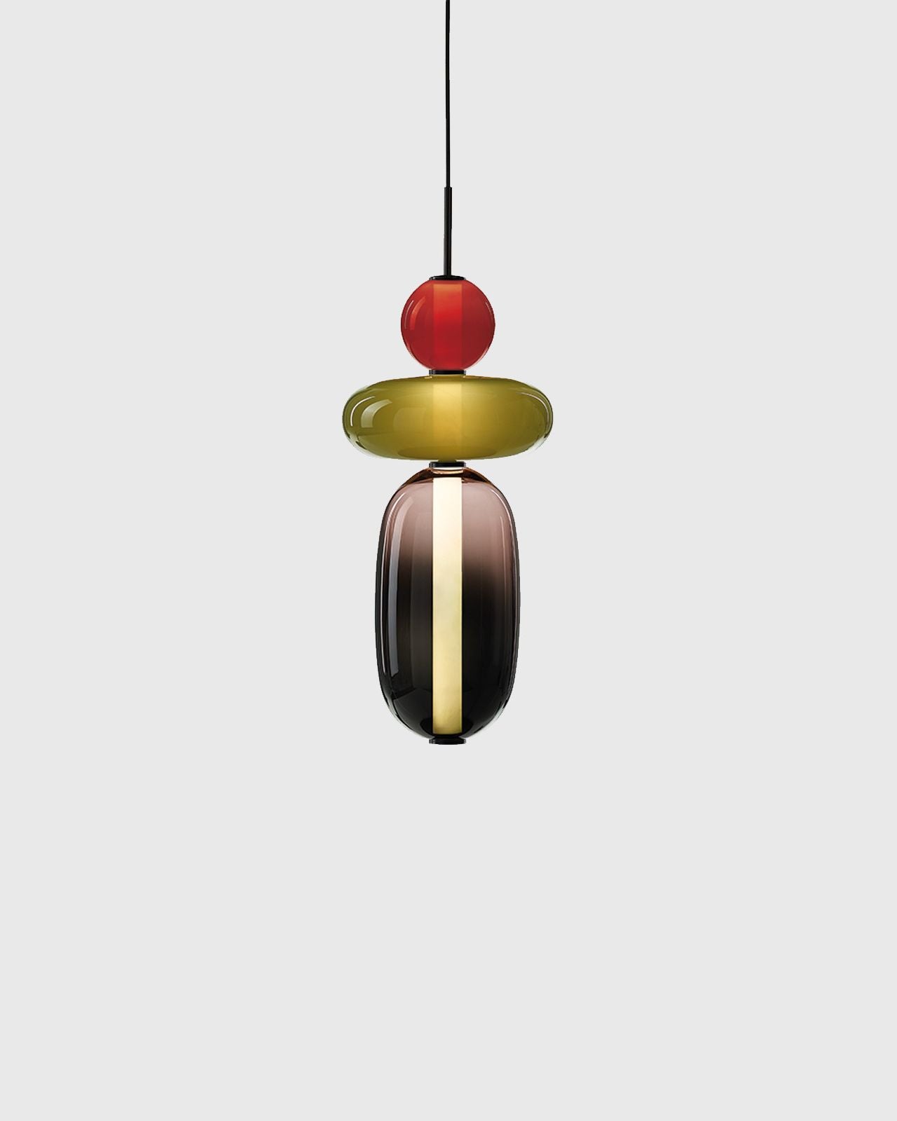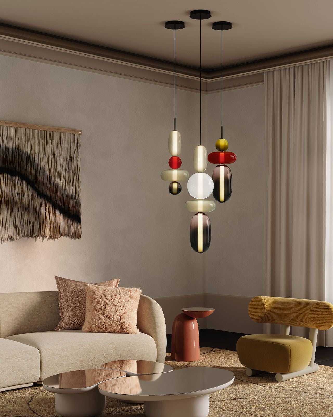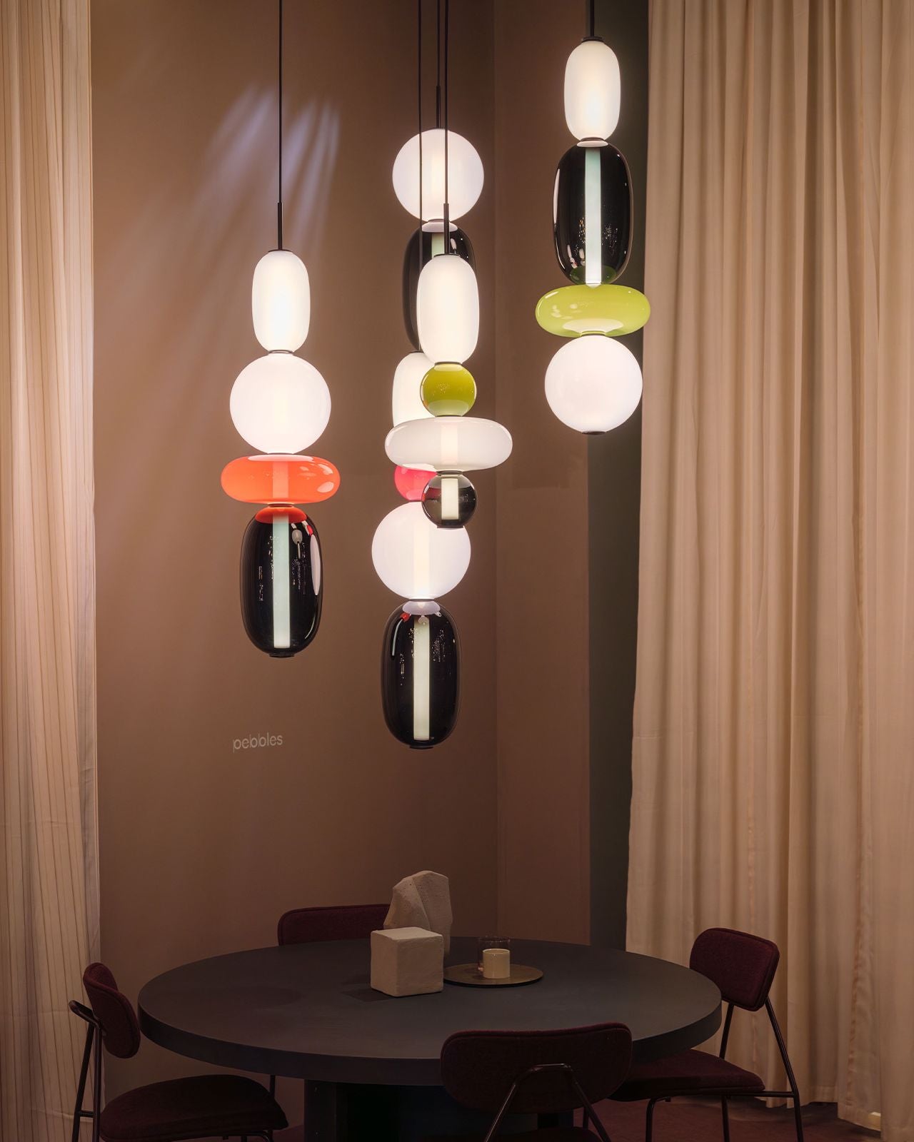 The Pebbles Small Pendant Light was crafted with inspiration taken from the vibrant hues and varied shapes of pebbles found on a sun-drenched beach. Each hand-blown glass element is connected to an interior light source and hangs like a string of colourful beads. One canopy is included, and alternate canopy options for clusters are also available upon request. For additional information, please contact customer service. Choose from 9 different colourful configurations and hang with the Large Pebble for a feature effect.