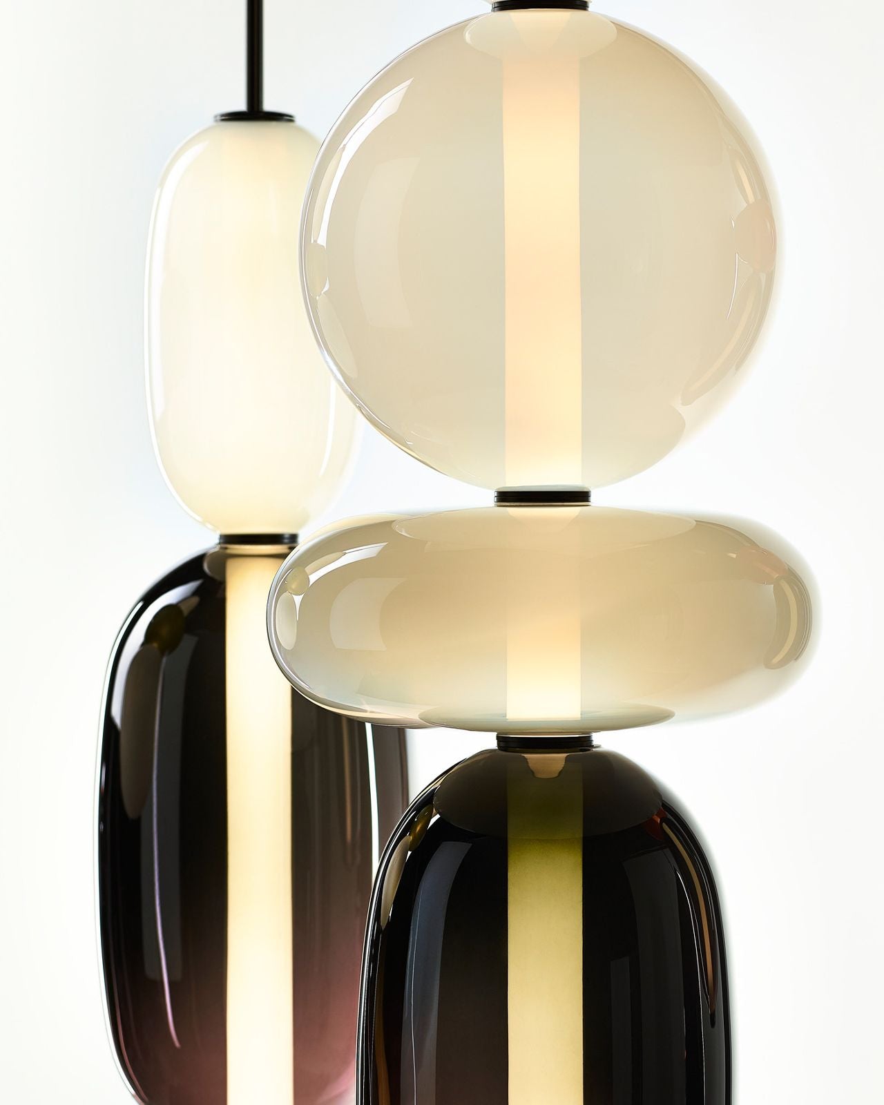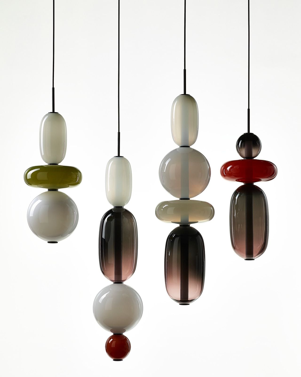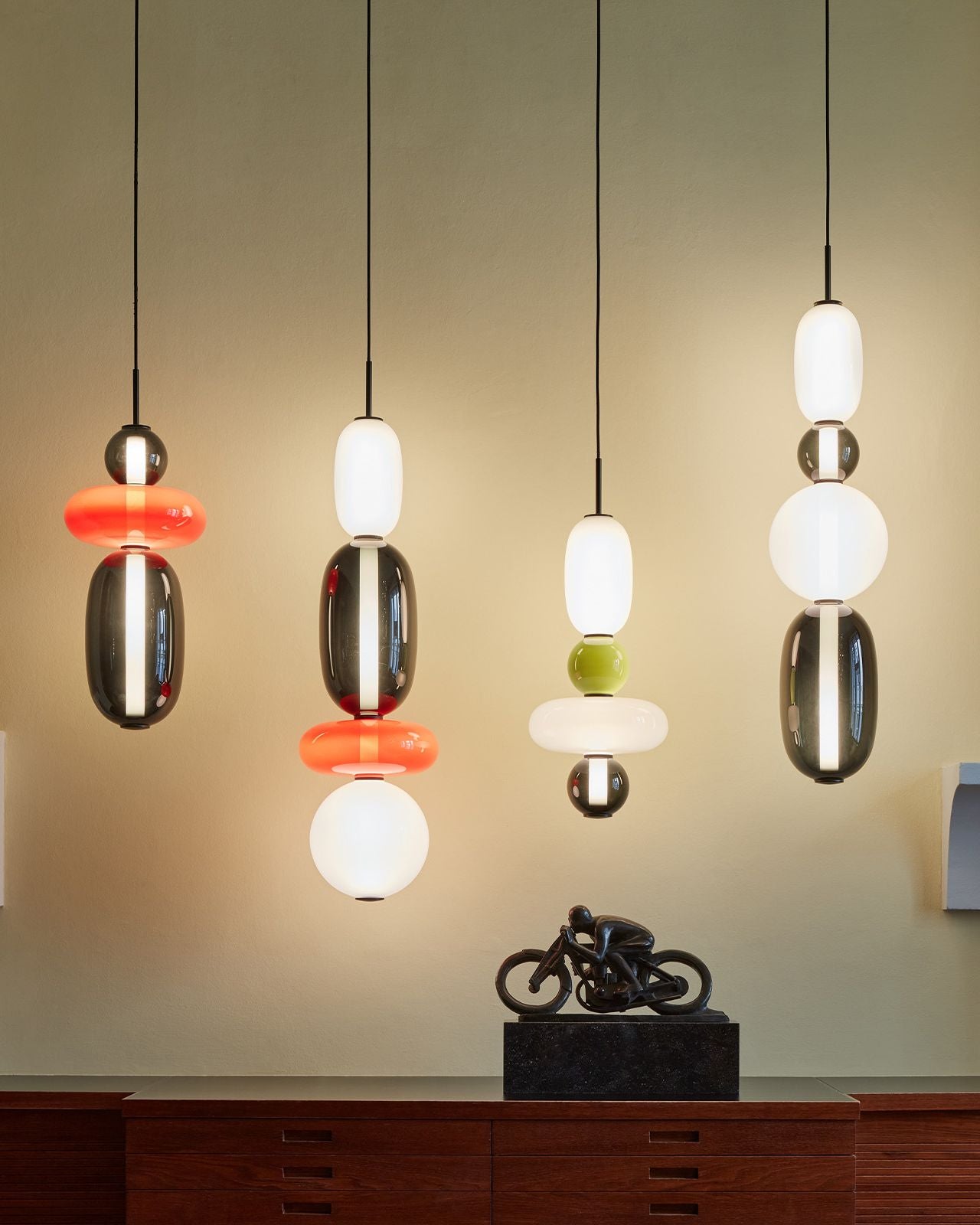 The Pebbles Small Pendant Light was crafted with inspiration taken from the vibrant hues and varied shapes of pebbles found on a sun-drenched beach. Each hand-blown glass element is connected to an interior light source and hangs like a string of colourful beads. One canopy is included, and alternate canopy options for clusters are also available upon request. For additional information, please contact customer service. Choose from 9 different colourful configurations and hang with the Large Pebble for a feature effect.