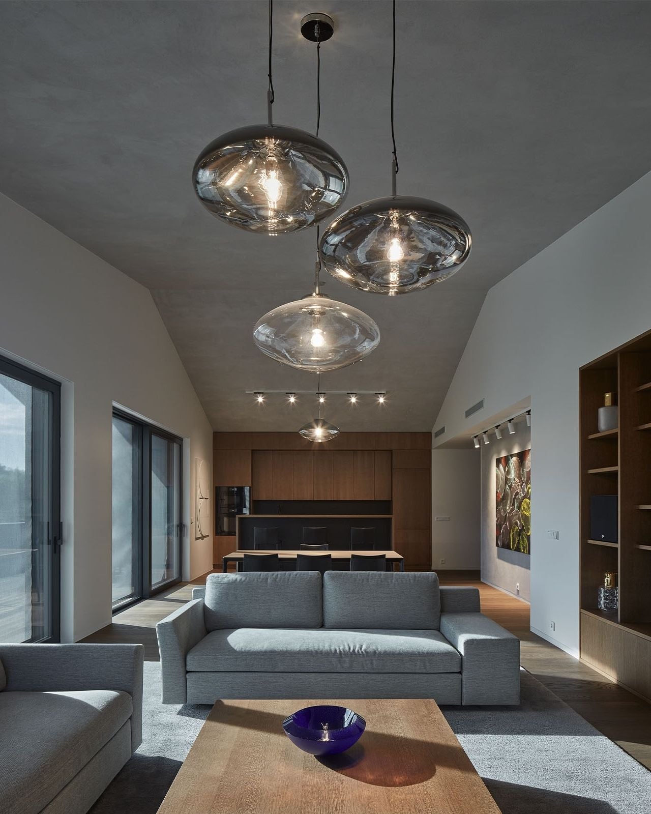 Refined Textured Glass Pendants small and large sizes displayed as clusters in a coastal restaurant
