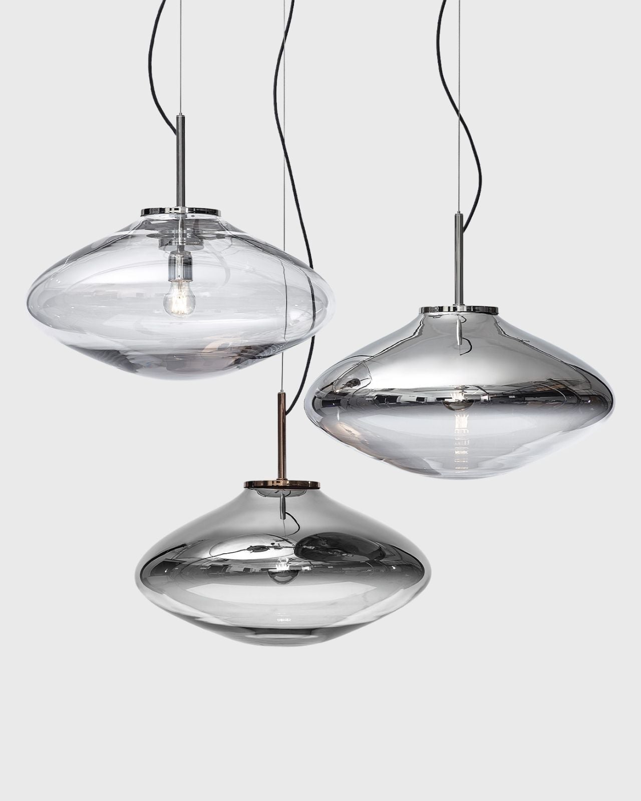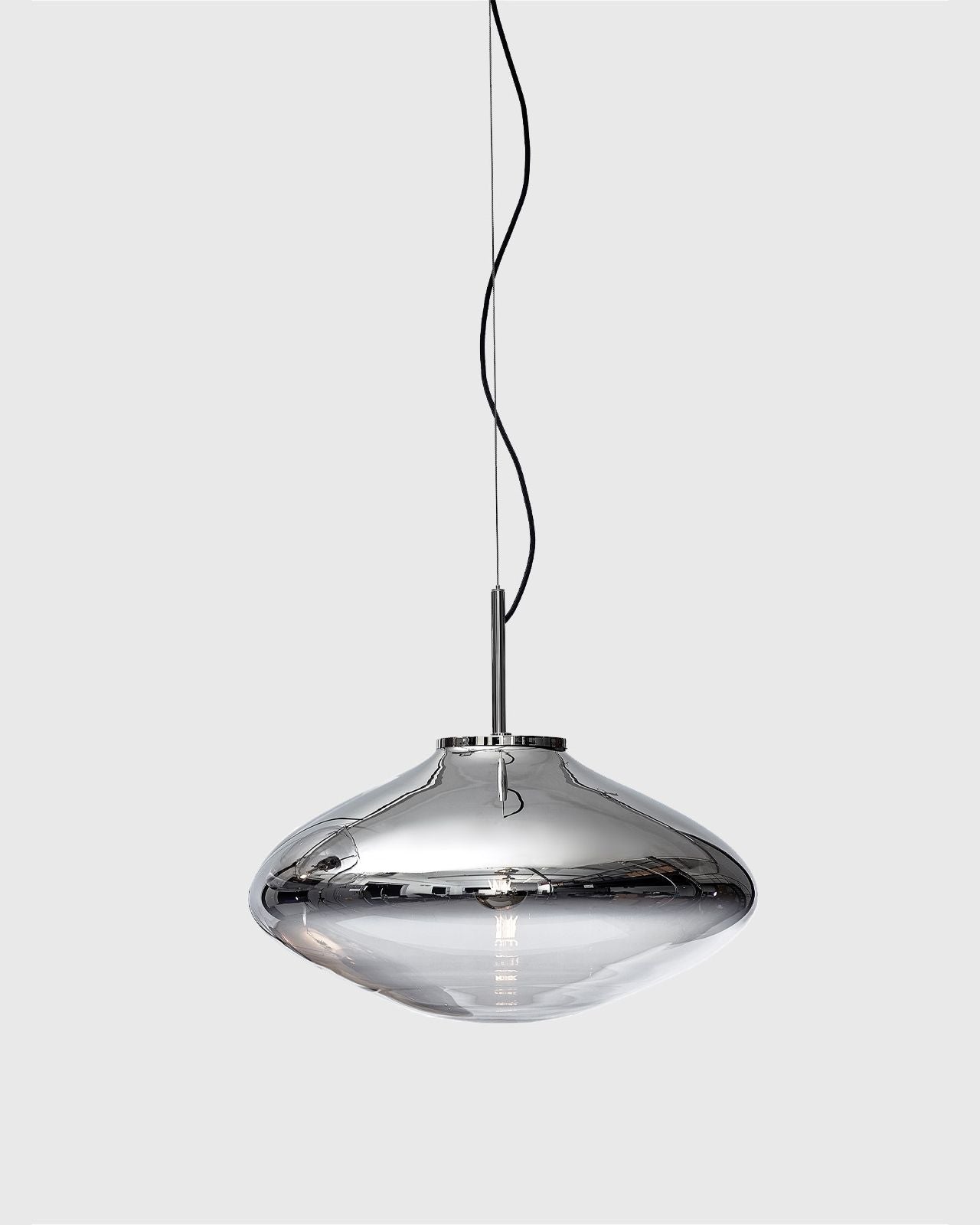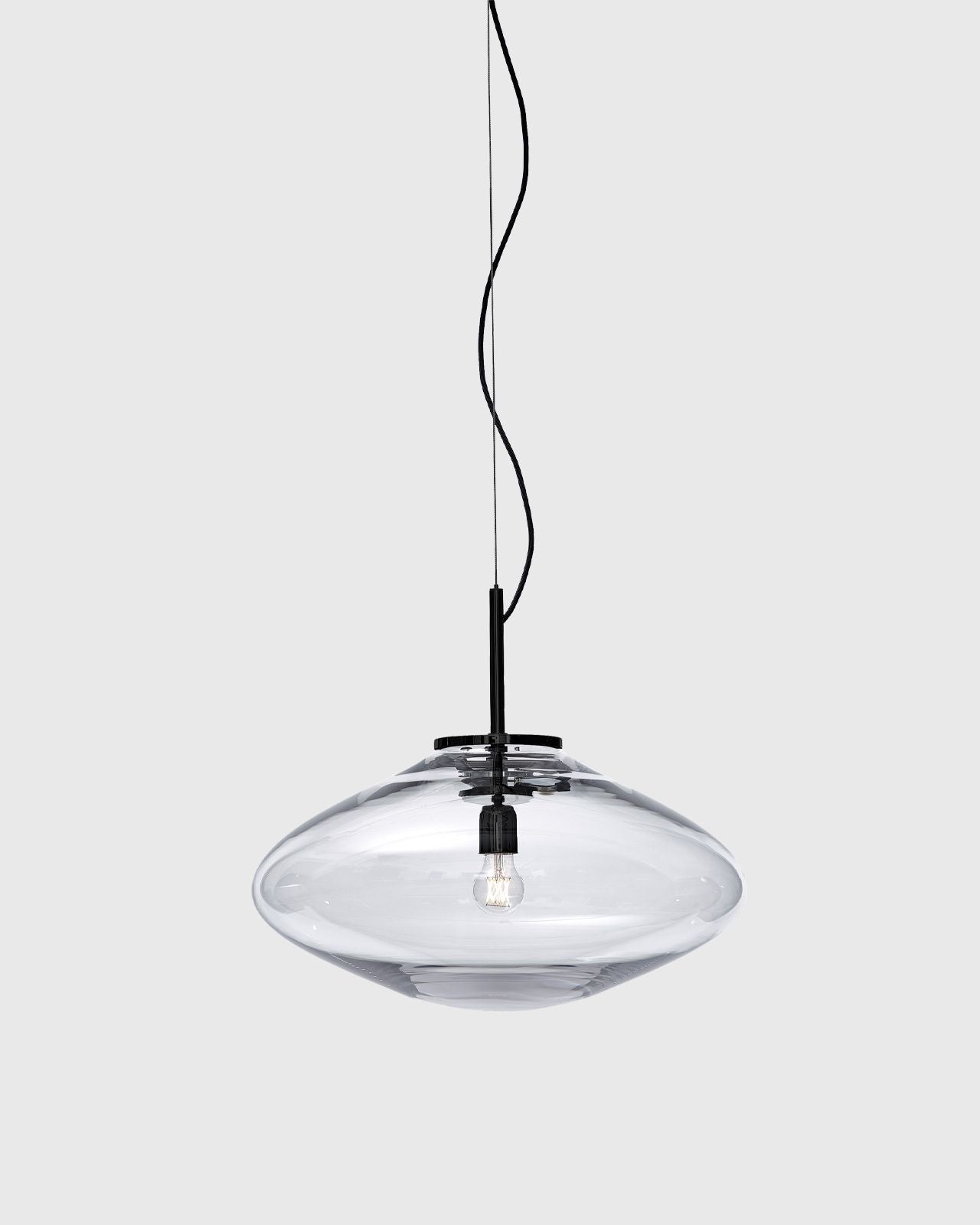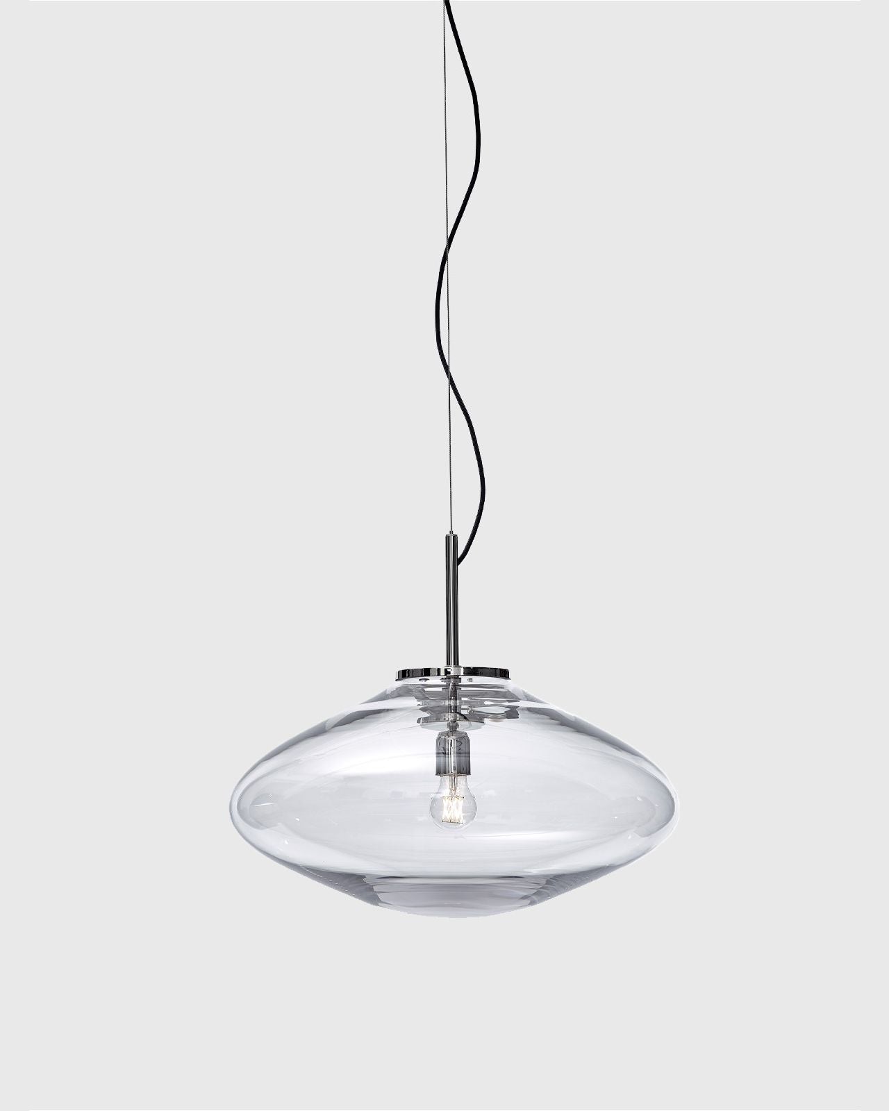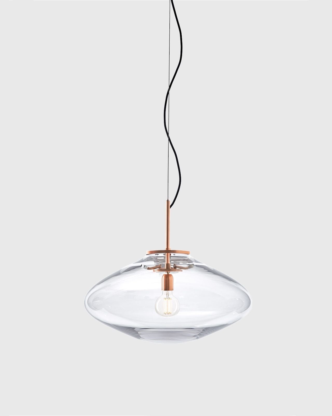 This collection artfully combines metal and the finest crystal, expertly crafted and hand-blown into wooden moulds to create the distinctive, minimalist form of Disc. Its elemental design resembles a UFO, creating a captivating, otherworldly design as it floats through any space. The friendly familiarity of this pendant adds character to interiors, while its clear, silver, or copper metal fixture creates a unique allure elevating the glass form.