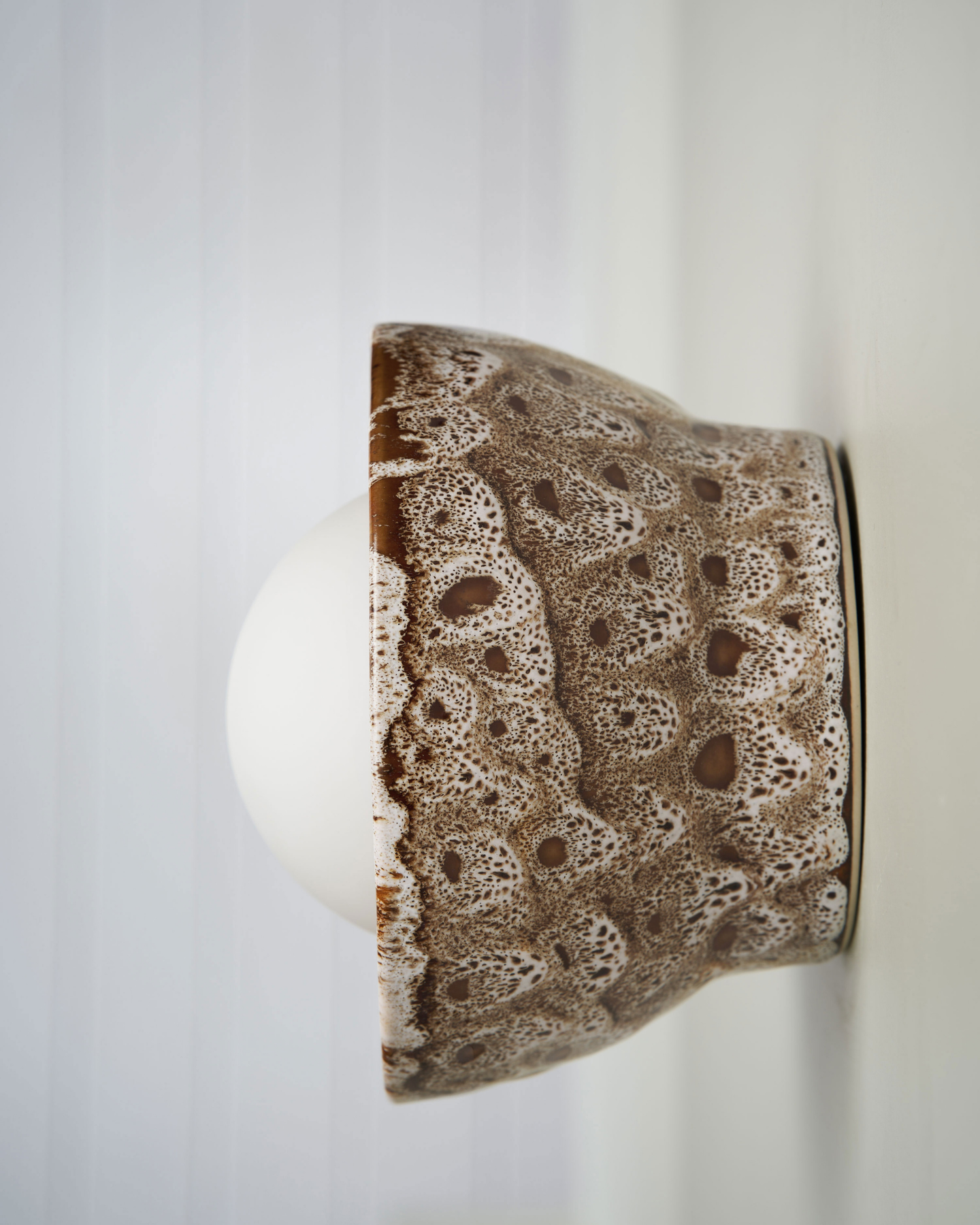 Ceramic wall light with textured brown surface on a white background.
