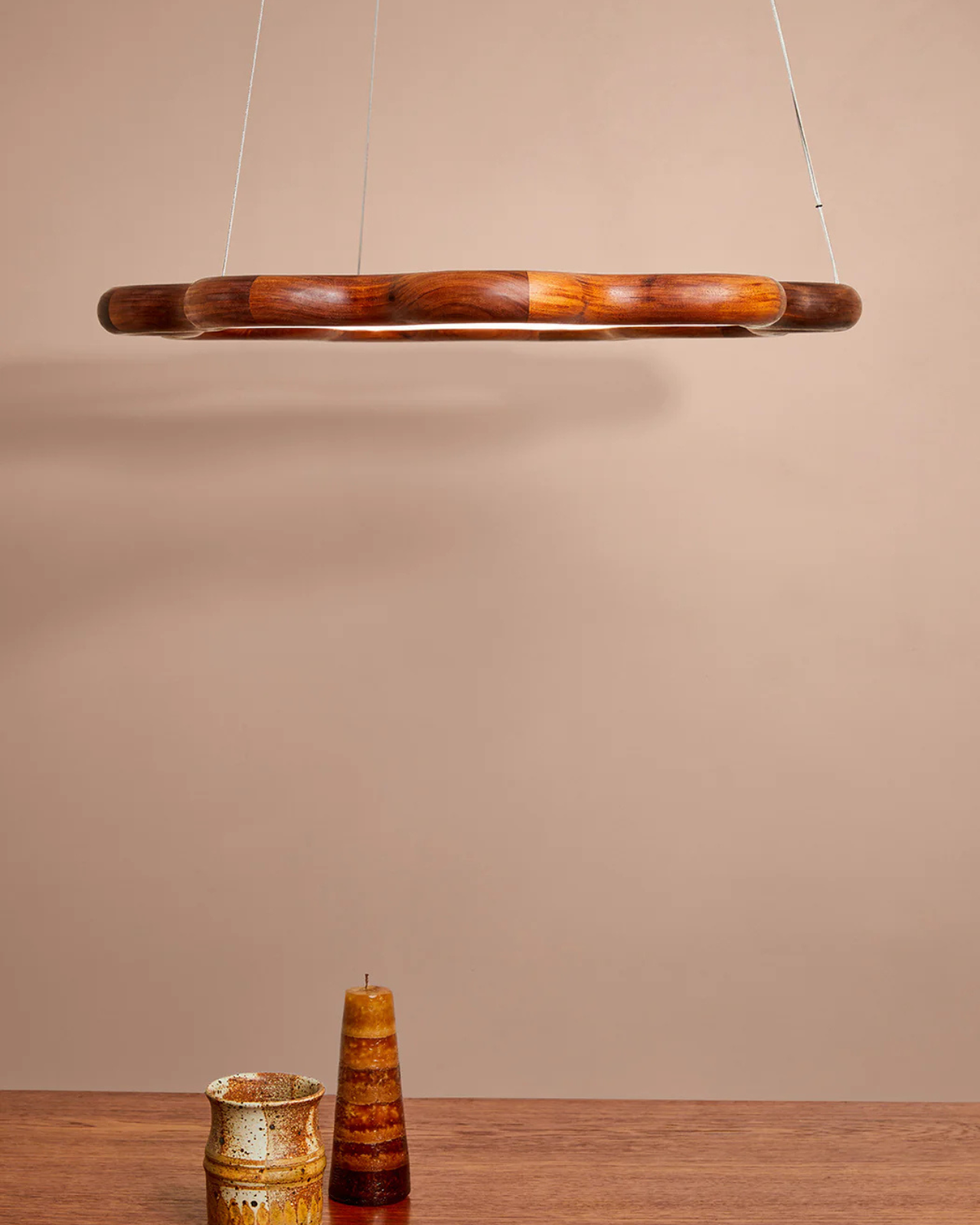 Handmade Wavy Circular Chandelier | Ripple fixture on a beige wall with a wooden surface below.