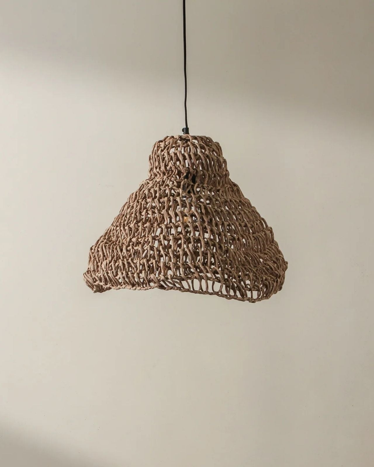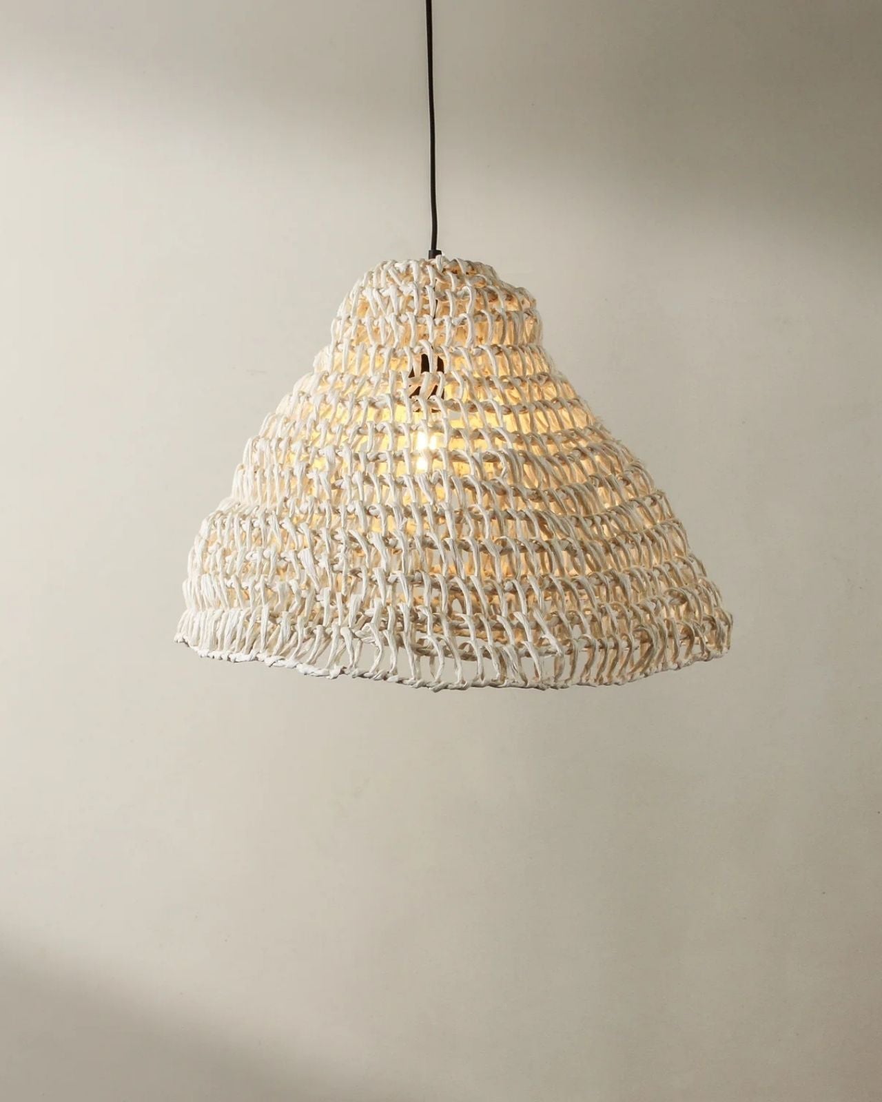 The Handwoven Paper Rope Bell Pendant features a rope construction in a natural or white finish, forming an elongated, triangle-shaped silhouette. Its organic form and soft diffusion of light is ideally paired with curved sofas, boucle textures or pale timber accents. This pendant would be best placed within a dining setting, high-ceiling stairwells, or layered installations.