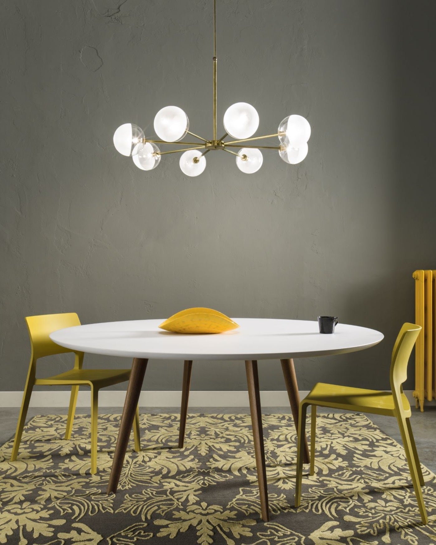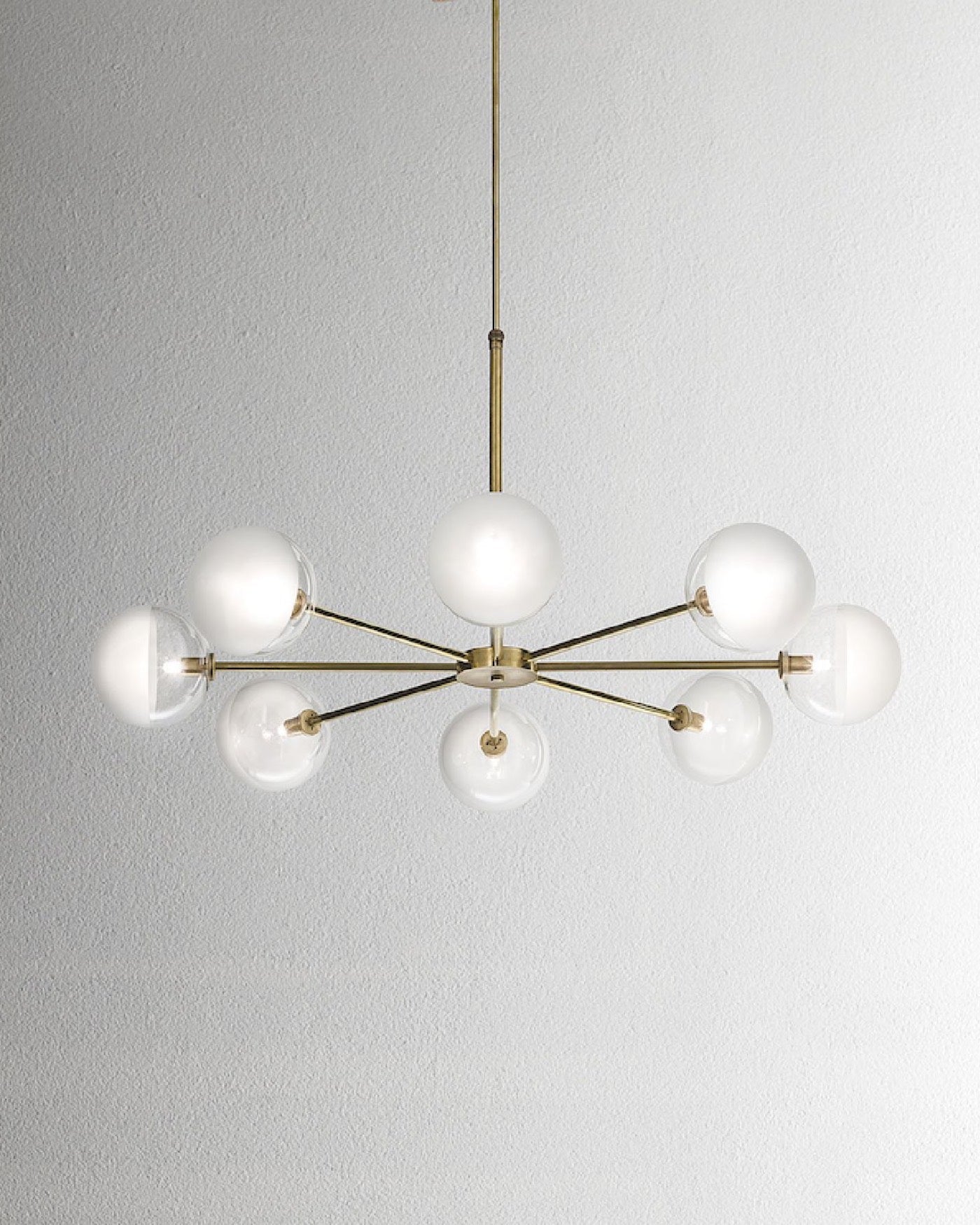 This is a beautiful eight-light brass pendant light with a natural finish, and made in Italy. The bodies base material is top quality antique brass which holds a very slight sheen and very subtle brush strokes, giving it gorgeous textural qualities. It makes for a superb piece over a dining or coffee table and will gracefully light up your space.