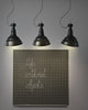 Three industrial-style pendant lights above a framed artwork with text on a gray wall.