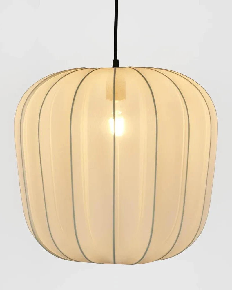 Crafted from ivory chiffon, this pendant draws inspiration from traditional rice paper lanterns. When unlit, the soft, translucent fabric presents a refined ivory finish. Once illuminated with a warm light globe, it emits a gentle, welcoming glow that adds warmth and character to living spaces. Finished with a black cord suspension, the pendant is available in medium and large shade sizes.