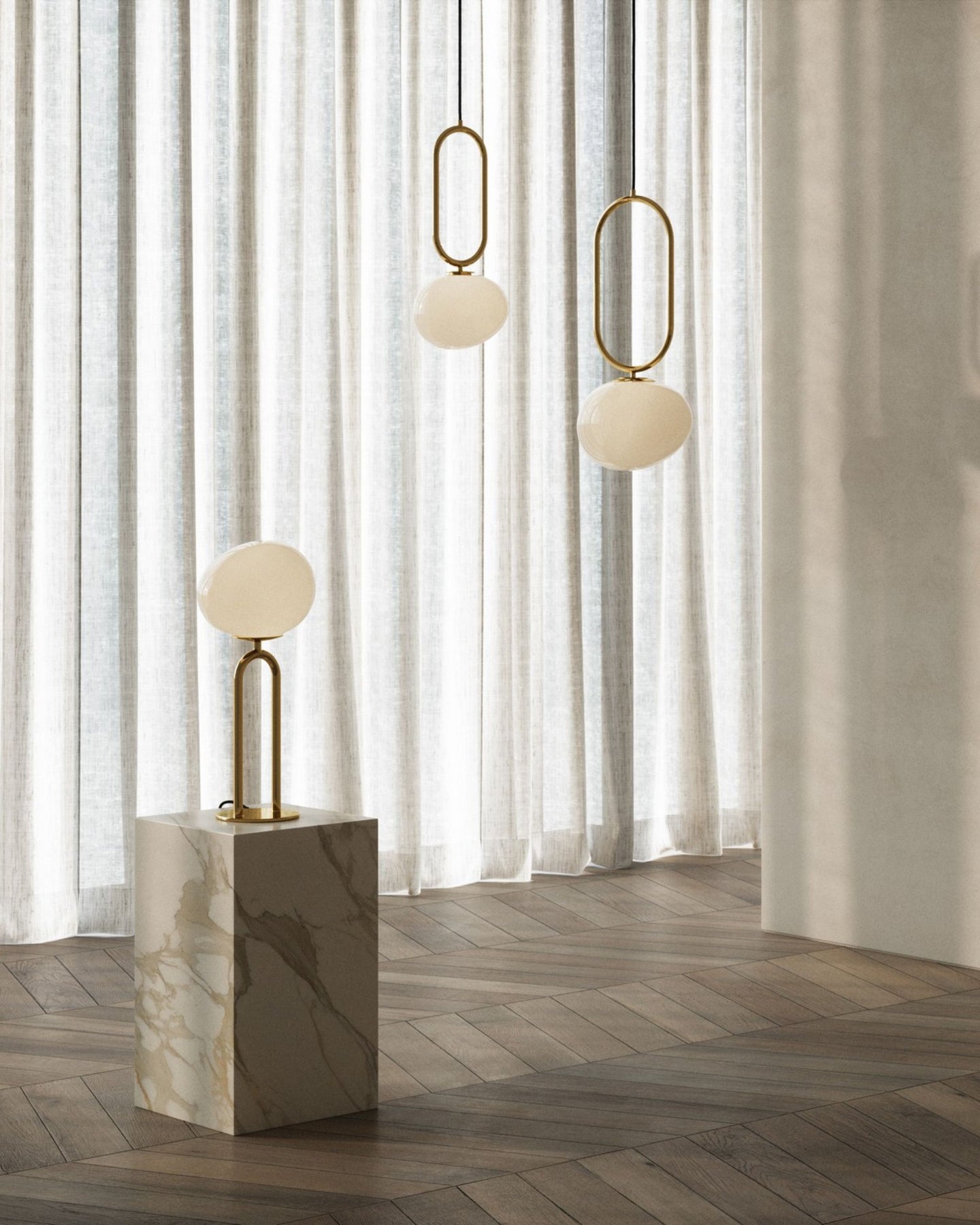 The Jewellery Shape Brass Suspended Light features a unique asymmetrical opal glass shade complementing the brass base. This contemporary suspended light will add a nostalgic charm to your kitchen, dining or living room.