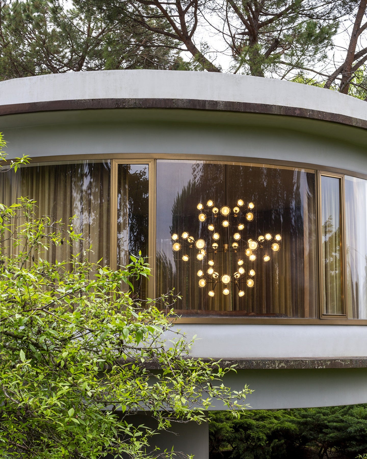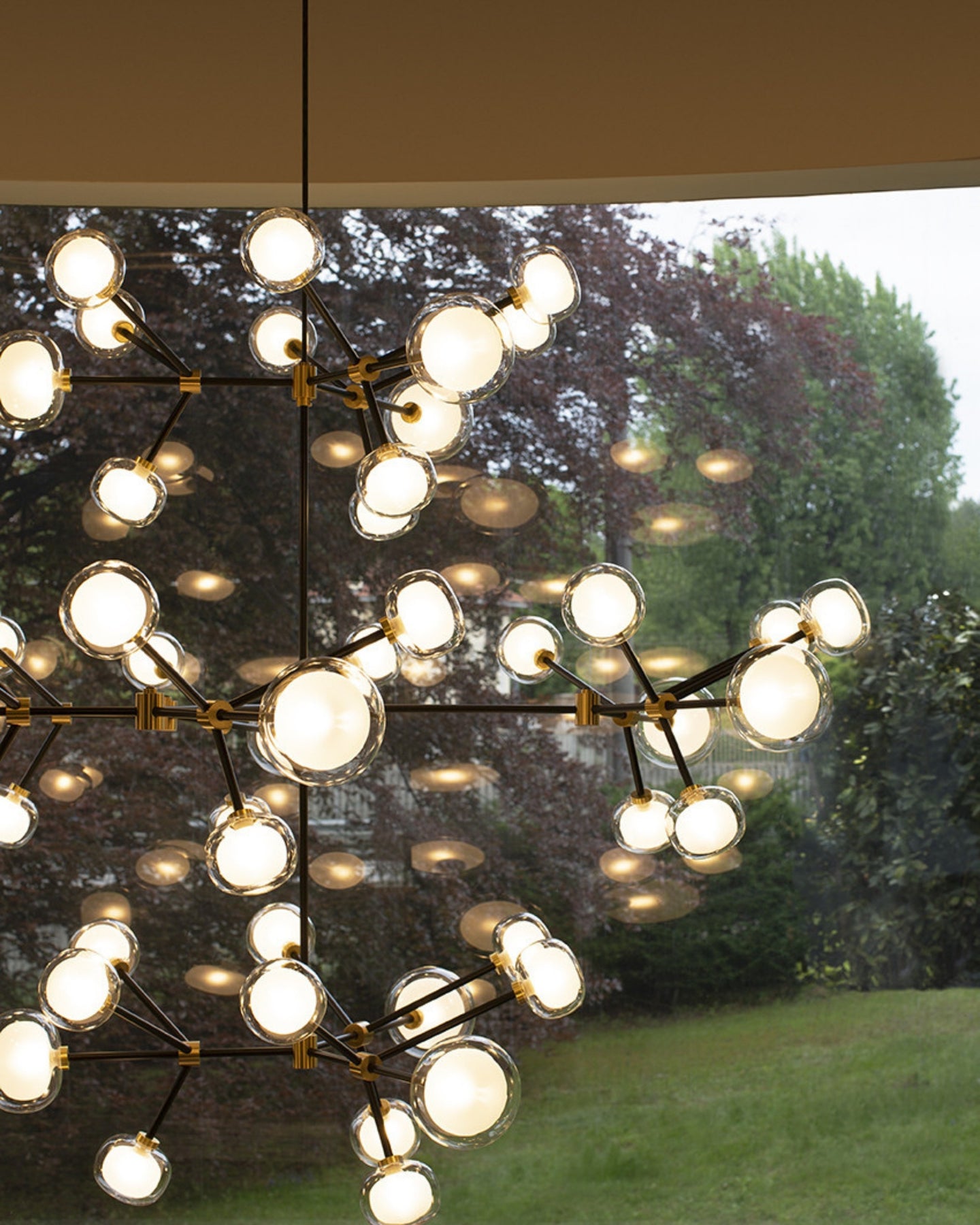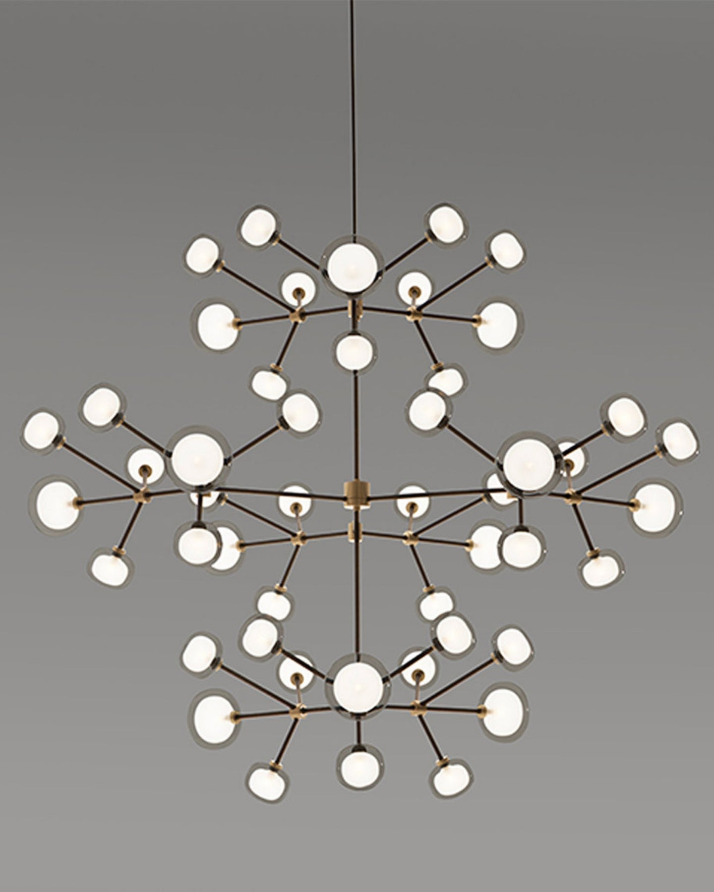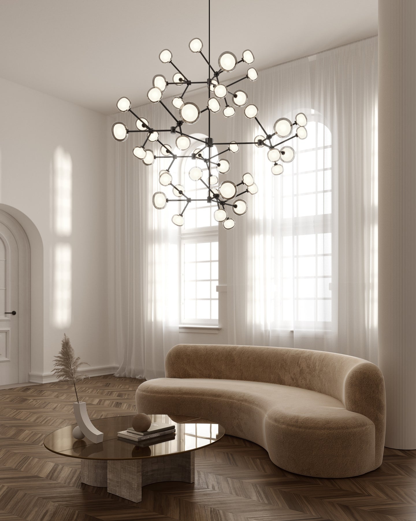 The Large Layered Glass Chandelier is a mesmerising centerpiece that blends mid-century elegance with contemporary sophistication. It features 48 double-walled borosilicate glass spheres delicately arranged on a sleek metal frame with brass or black chrome accents, creating a floating, sculptural effect. Perfect for large living rooms, dining areas, or grand foyers, this impressive chandelier measures 180 cm in diameter and 148 cm in height, providing dramatic visual impact while illuminating interiors with warmth and style.
