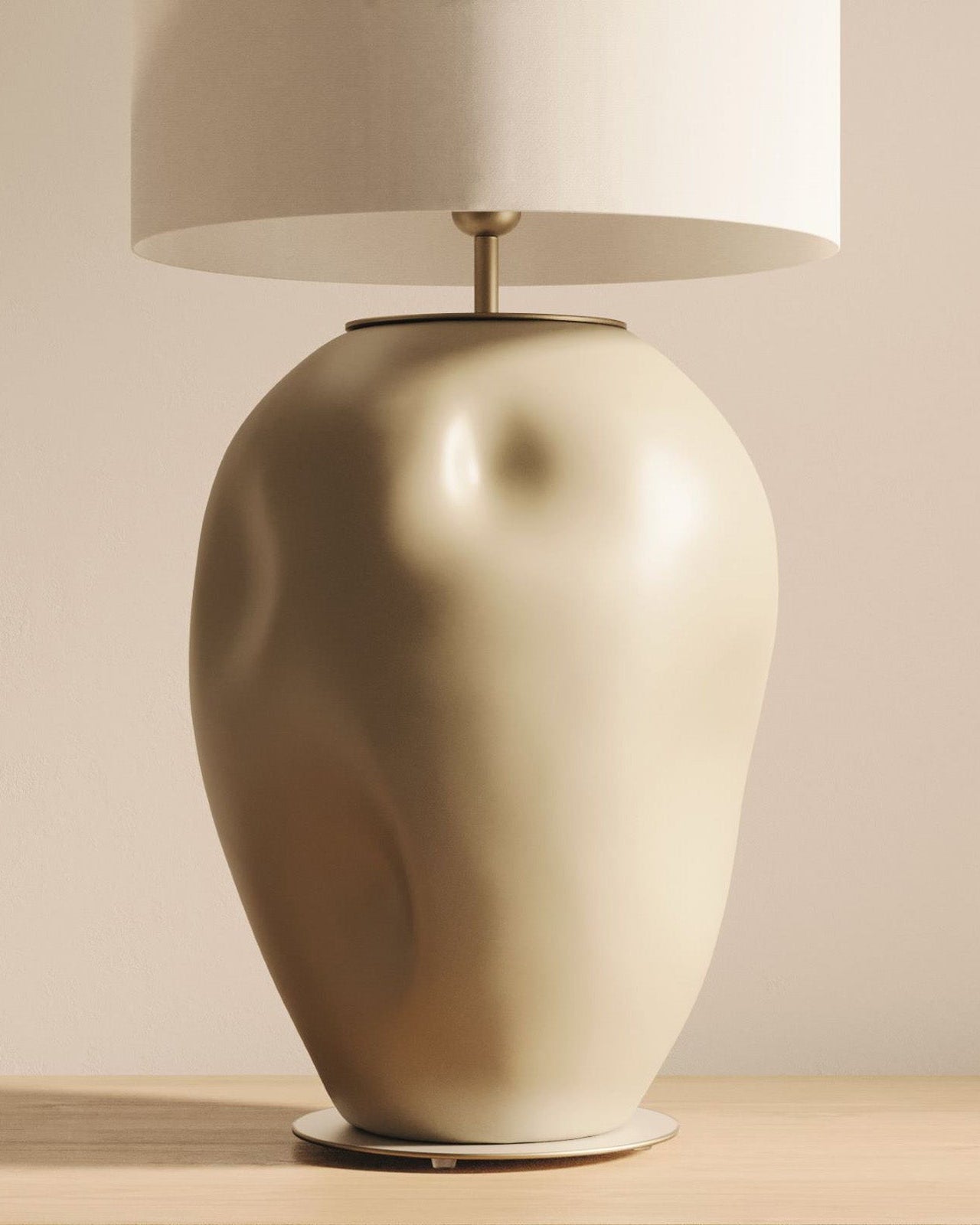 Expertly crafted, this table lamp captures attention with its large, rounded ceramic form. Its remarkable organic base with smooth indents delivers a unique tactile and visual experience, available in nude or silhouette finish. Featuring a white shade, this lamp emits a soothing glow, making it a high-end addition to any room.