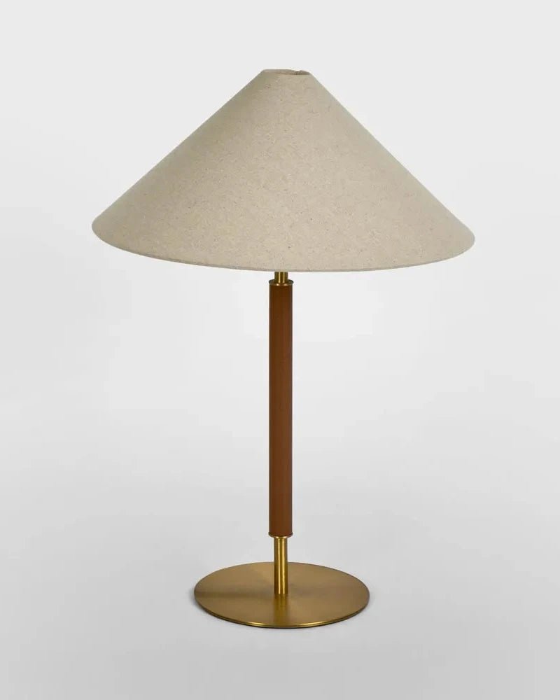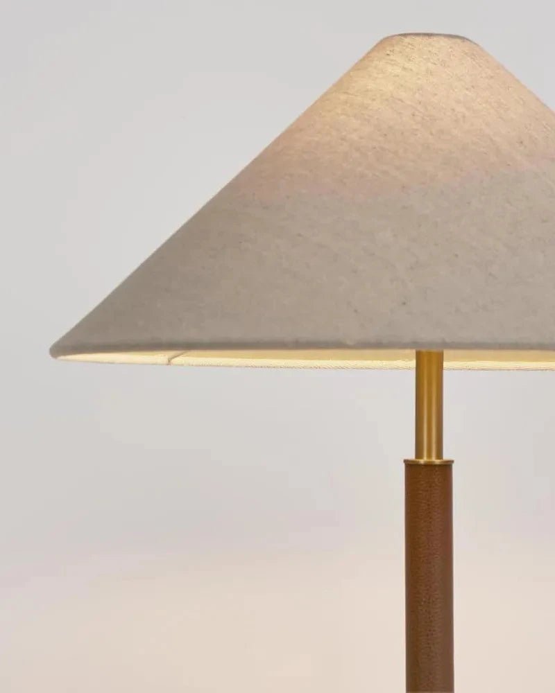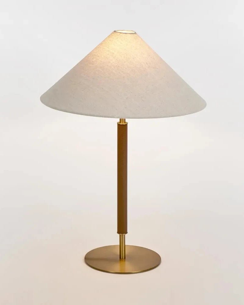 The Leather & Brass Table Lamp features a sleek, modern design with a warm brass base and a leather-wrapped stem for a refined, textured look. The wide, tapered linen shade casts a soft, diffused light, creating a cozy and inviting atmosphere. Its minimalist yet elegant aesthetic makes it a versatile piece, ideal for a bedside table, desk, or reading nook.