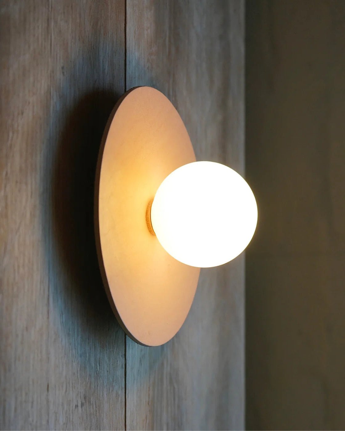 Handmade in Melbourne from locally sourced materials, this leather Disc Wall Sconce is a testament to meticulous craftsmanship and considered design. The flat disc form offers a minimalistic yet organic textural shade to suit interior spaces. Available in four versatile finishes and textures to suit an array of designs - Natural, Olive, Dark Brown Emboss and Terracotta.