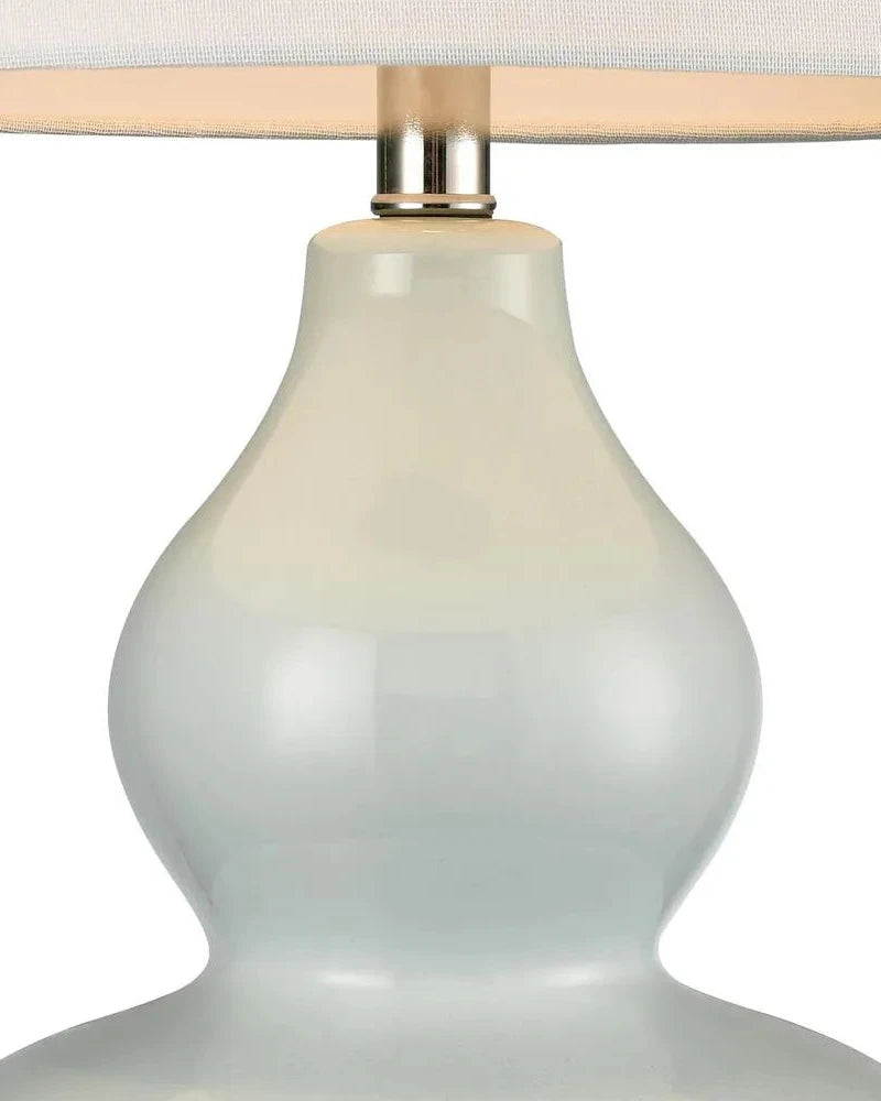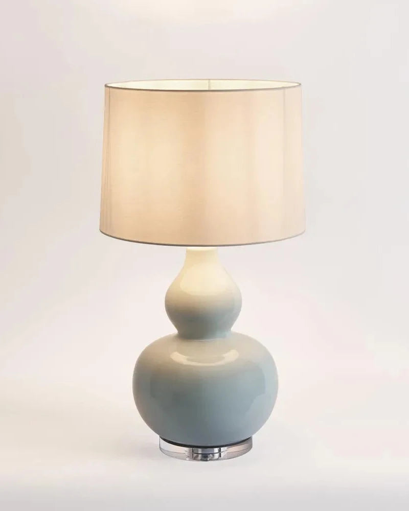 The Light Blue Ceramic Table Lamp has a graceful, sculptural design with a curvy ceramic base in a soft, muted pastel shade. The glossy finish adds a touch of elegance, while the simple white drum shade provides a clean, timeless look, with a soft, diffused light creating a warm and inviting atmosphere. Resting on a sleek, chrome-finished base, this lamp blends classic and contemporary styles, making it an ideal accent for bedside tables or stylish office spaces.