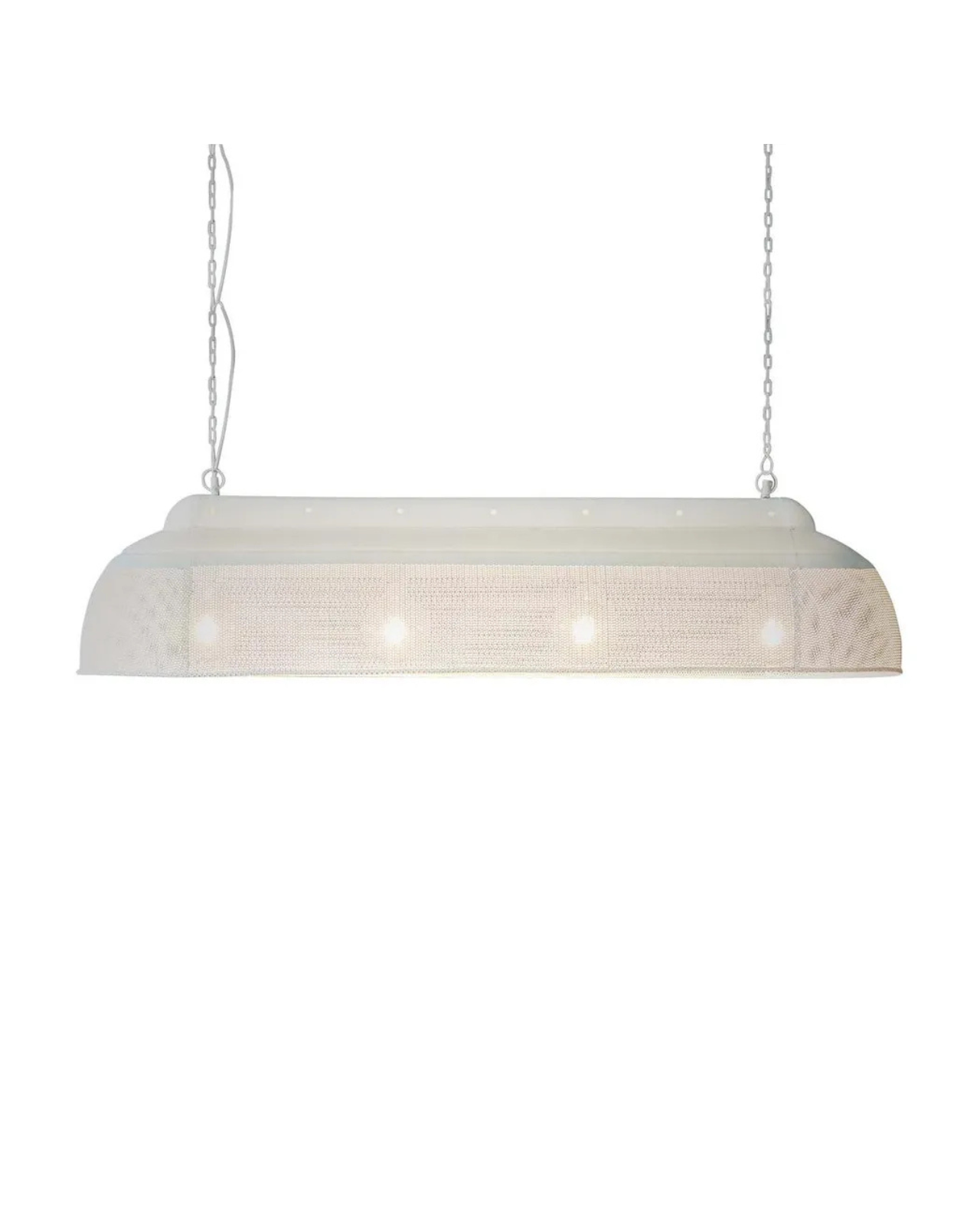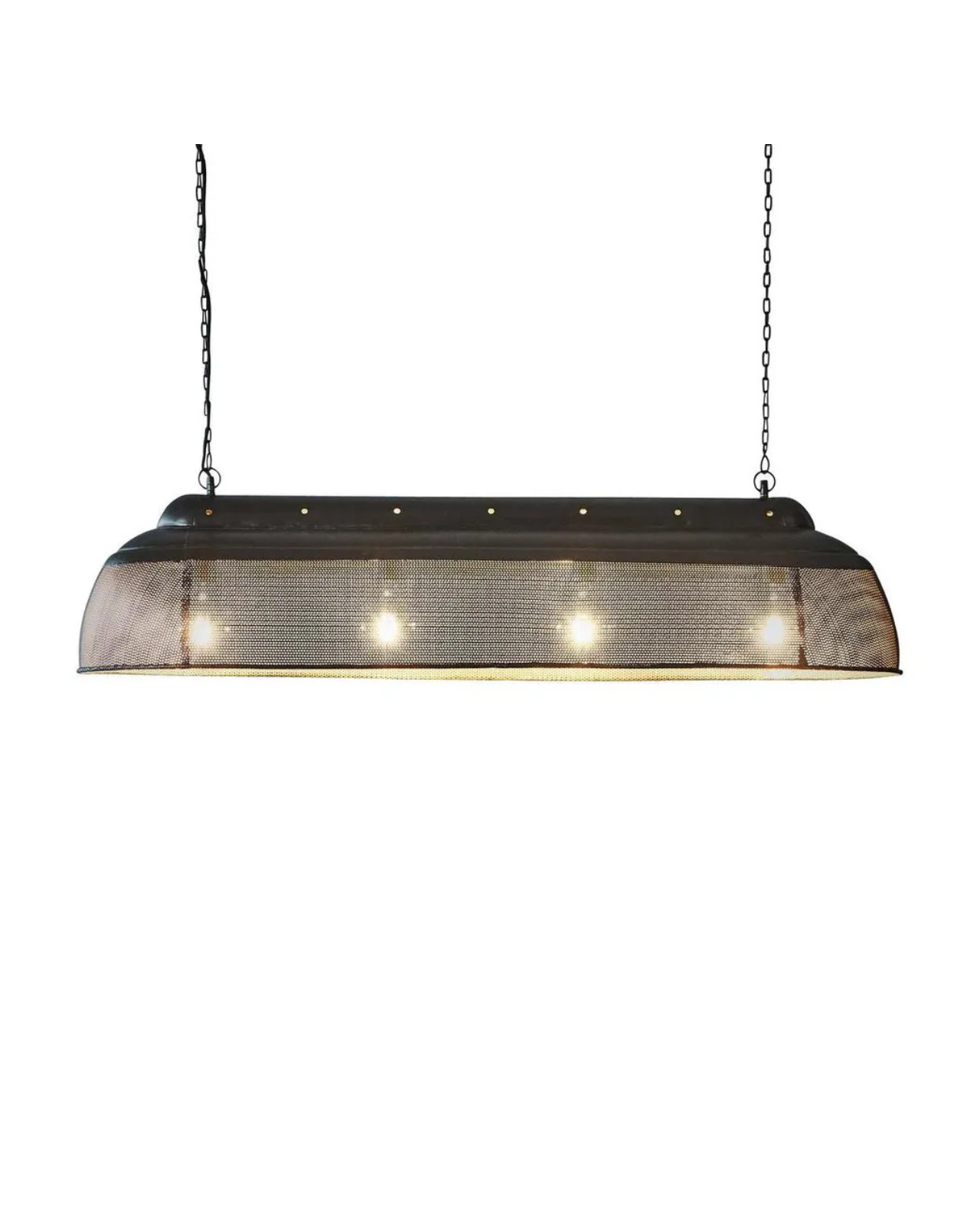 Featuring a robust iron frame, the pendant accommodates four light globes, ensuring even, ambient lighting across a wide surface. It is suspended by two chains and matching ceiling roses for stability and visual symmetry with only one ceiling rose housing the electrical port for a clean, streamlined installation.