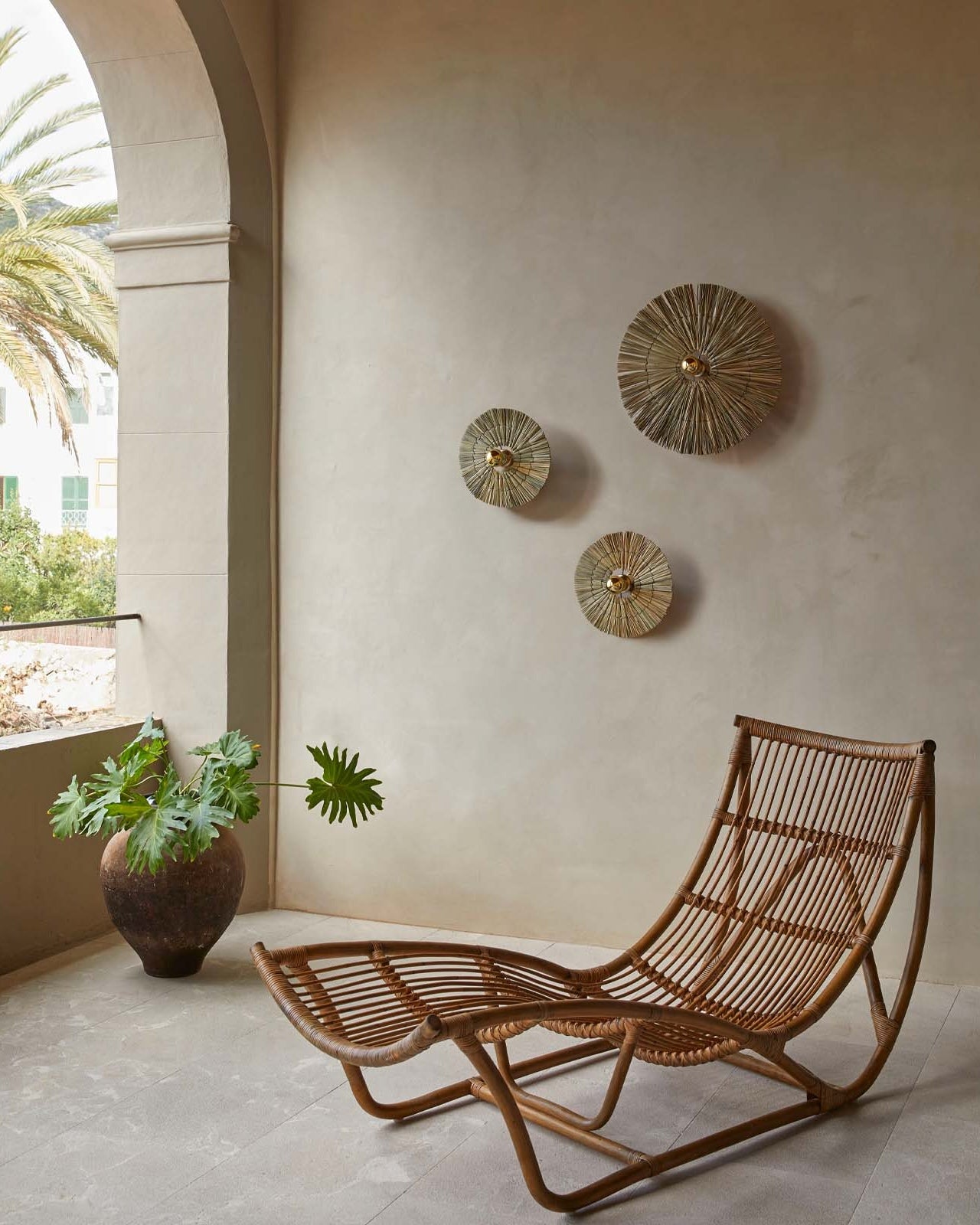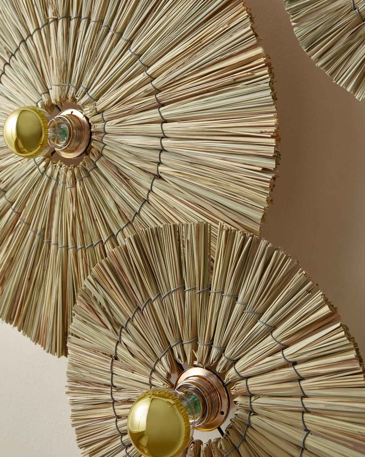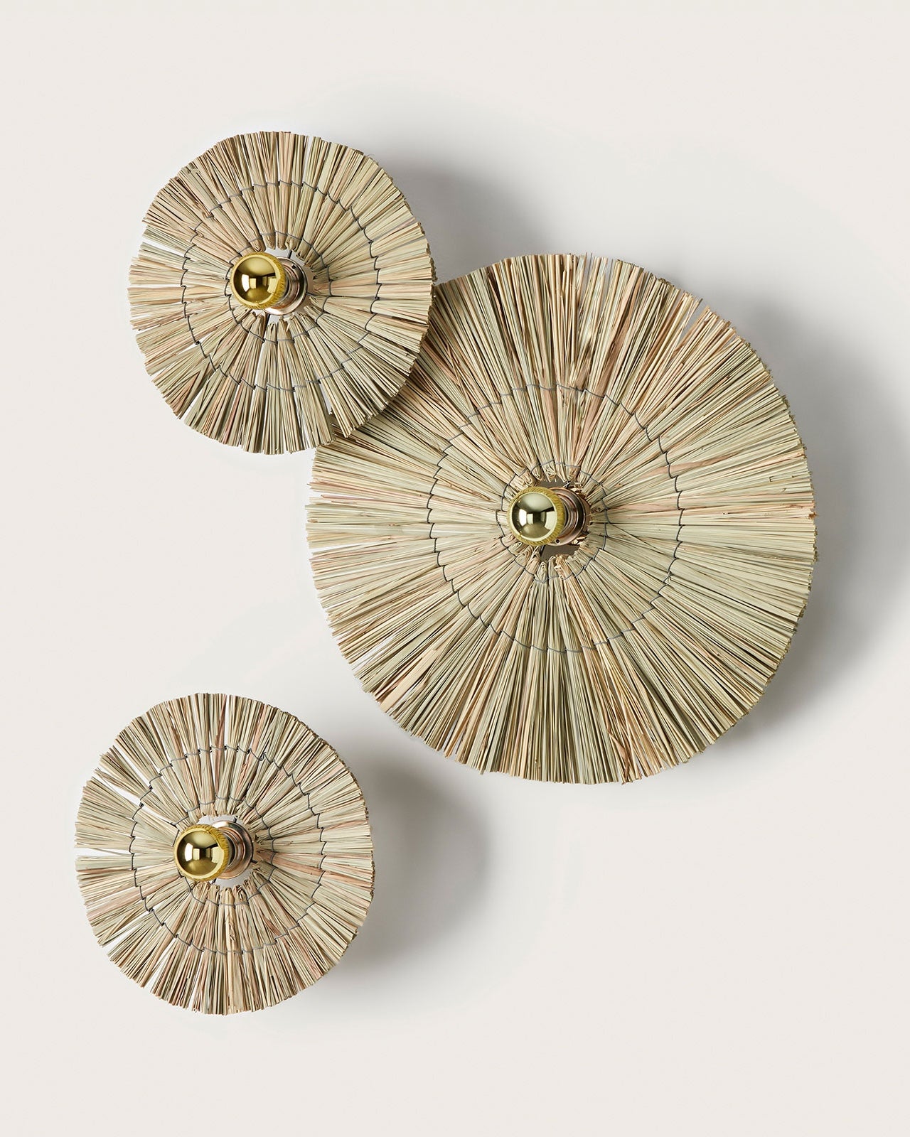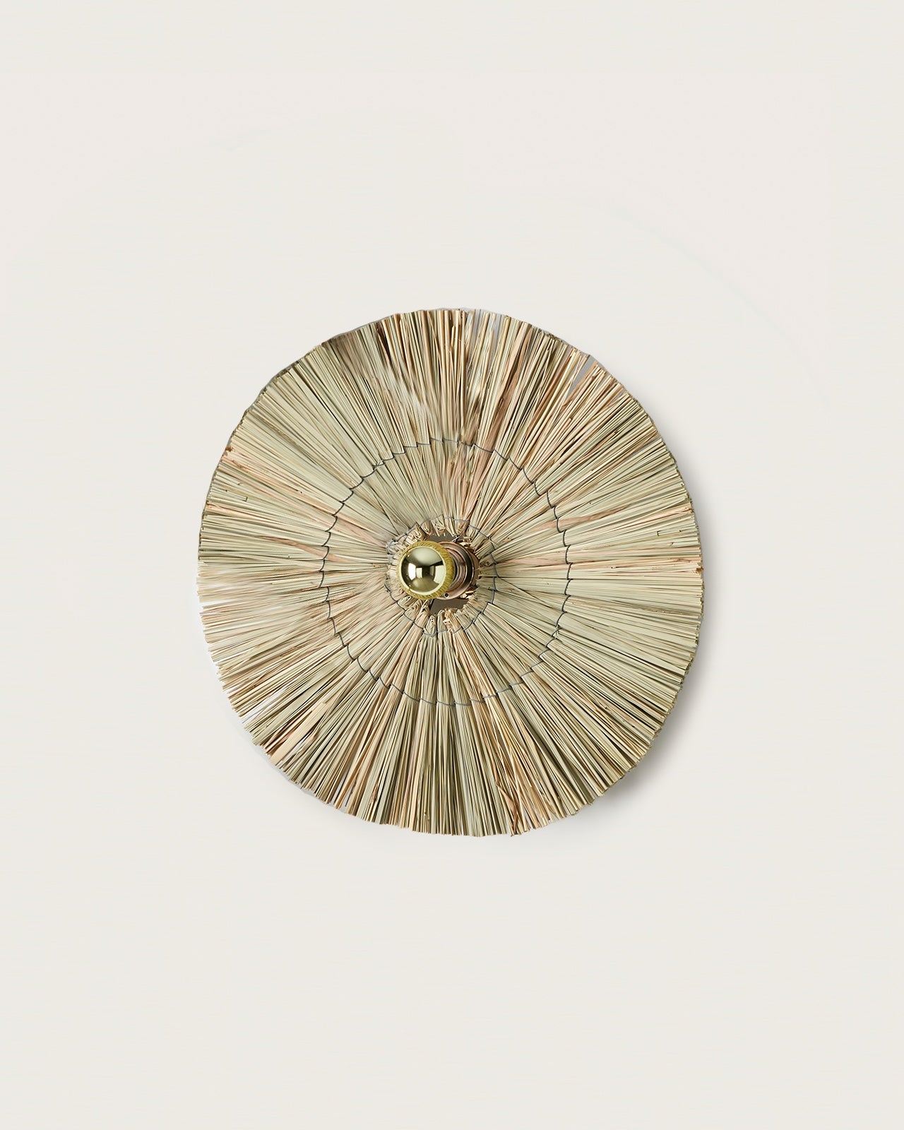 This decorative Spanish design is made from a dried grass circular frame and gold metal structure. Bringing effortless luxury to any interior this design is suited for illuminating living areas, bedrooms and hallways. Available in a small or large this wall light is sold individually but is beautiful when grouped in a composition of three. This design is recommended to be paired with a gold or silver capped E27 to add an extra touch of luxury.