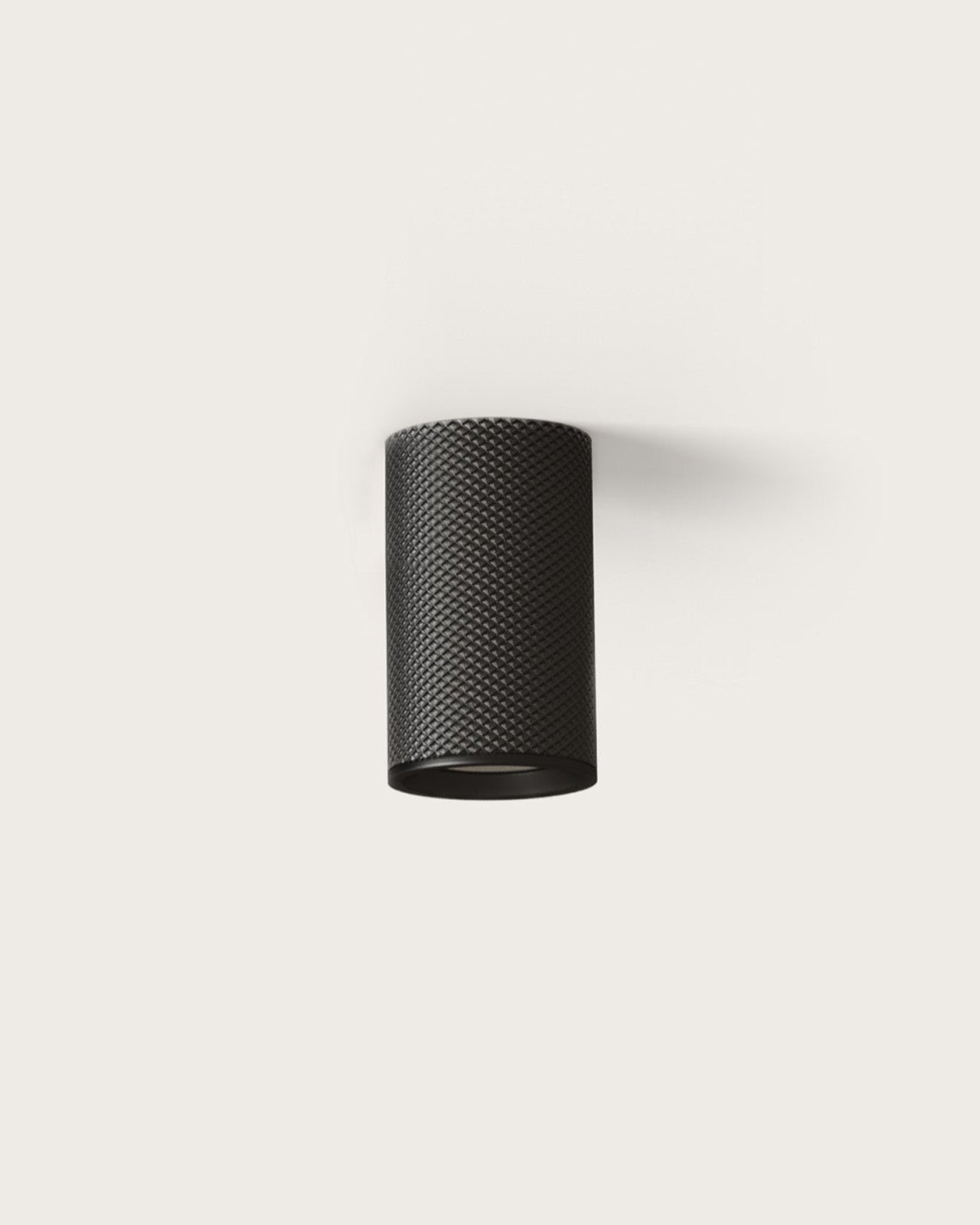 This small ceiling light features a simple yet sophisticated cylindrical shade. Made from robust aluminium, this fixture comes with an incorporated textured pattern allowing it to bring some modernity and refinement to any interior. This downlight will illuminate kitchen islands, corridors, and bookshelves, and is available in Aged Gold, Matte Black or an Anthracite finish.