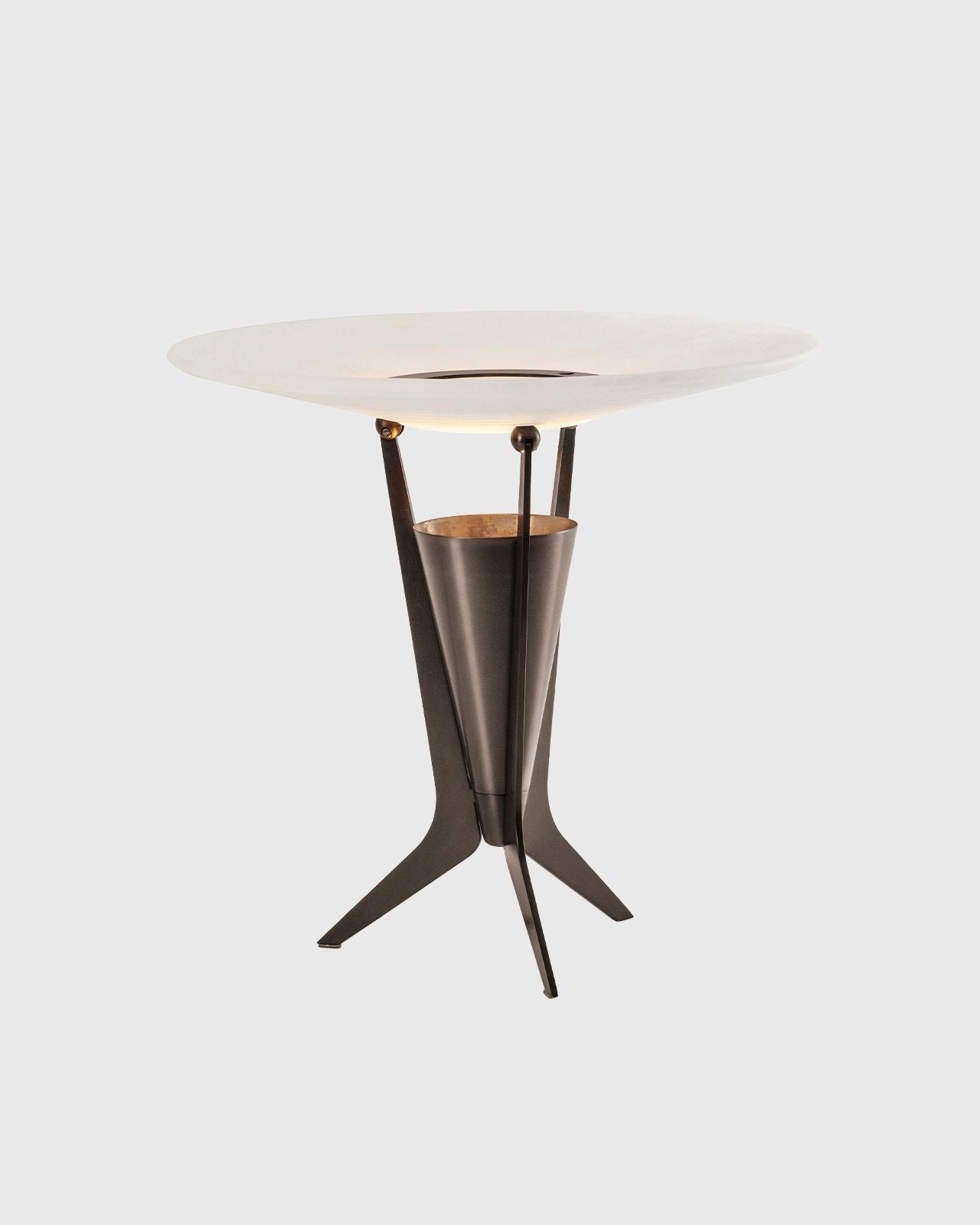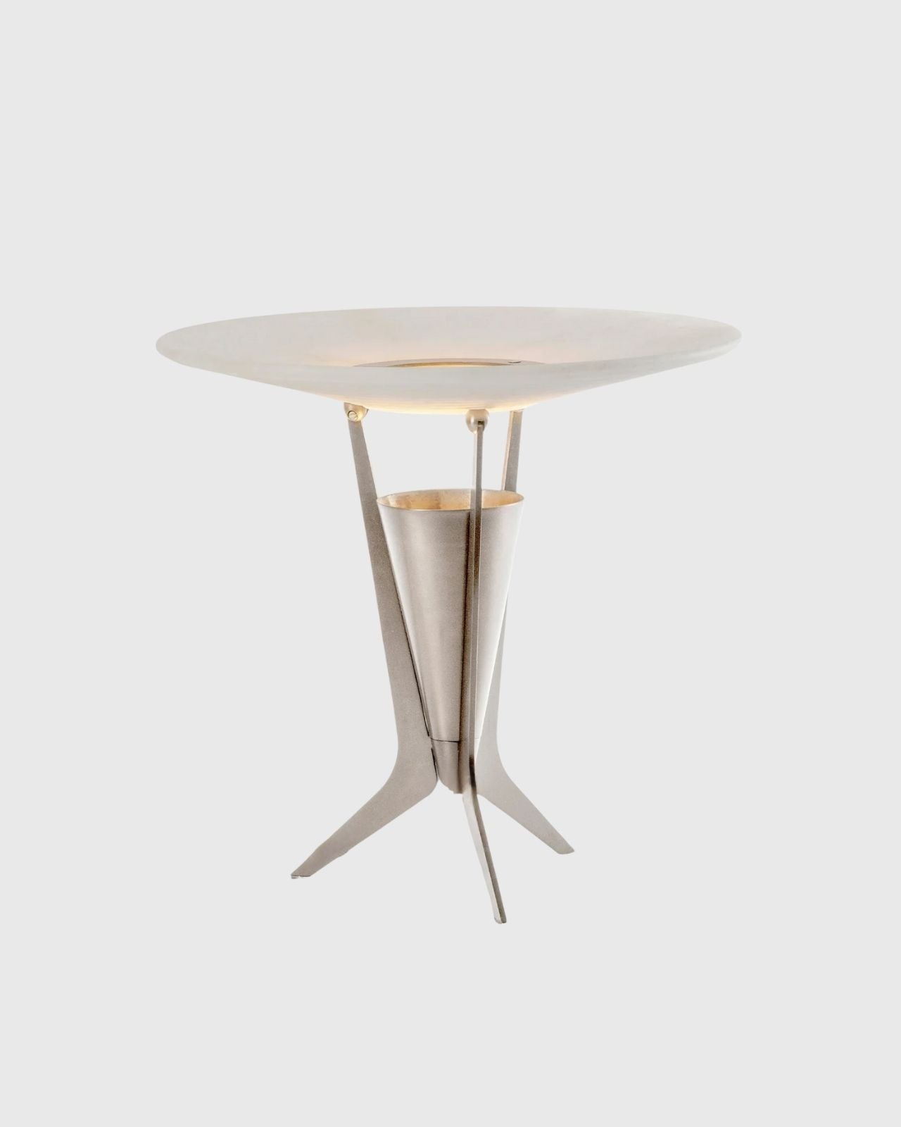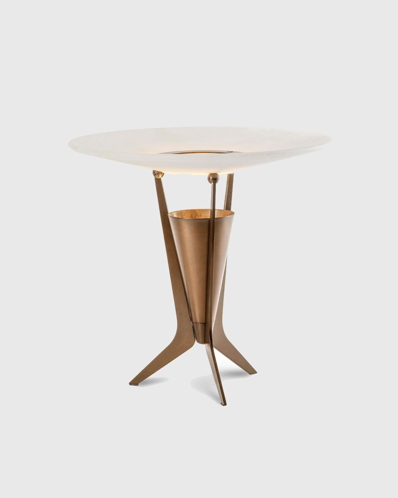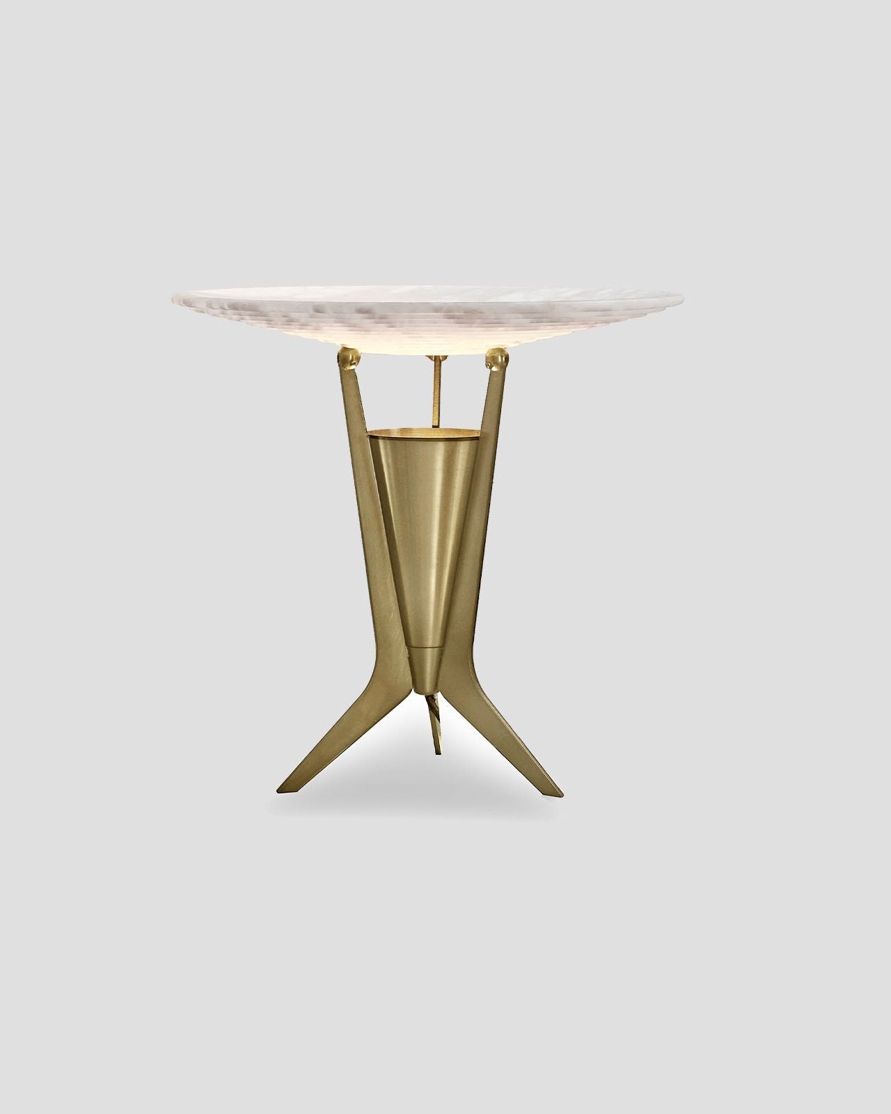This table lamp plays with texture and light as the opalescent sculptural alabaster contrasts with the lustrous brass body. The conical stepped shade is designed to diffuse and upwardly reflect the LED light source, allowing it to create a warm and inviting atmosphere. Ideal on a side table on a console near an entrance, or as a bedside lamp. This fixture is available in antique brass, bronze, satin brass or satin nickel finish and will elegantly elevate interiors.