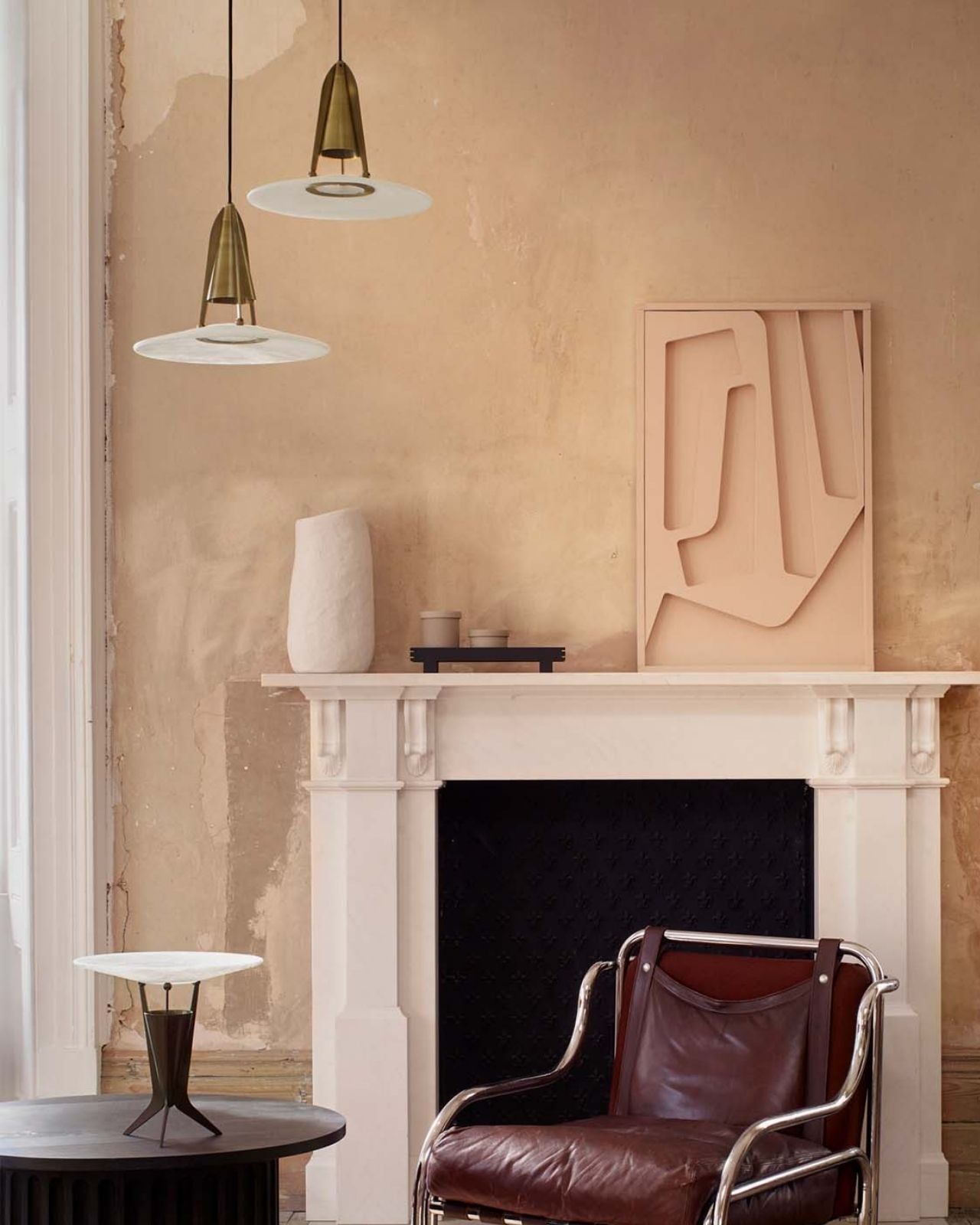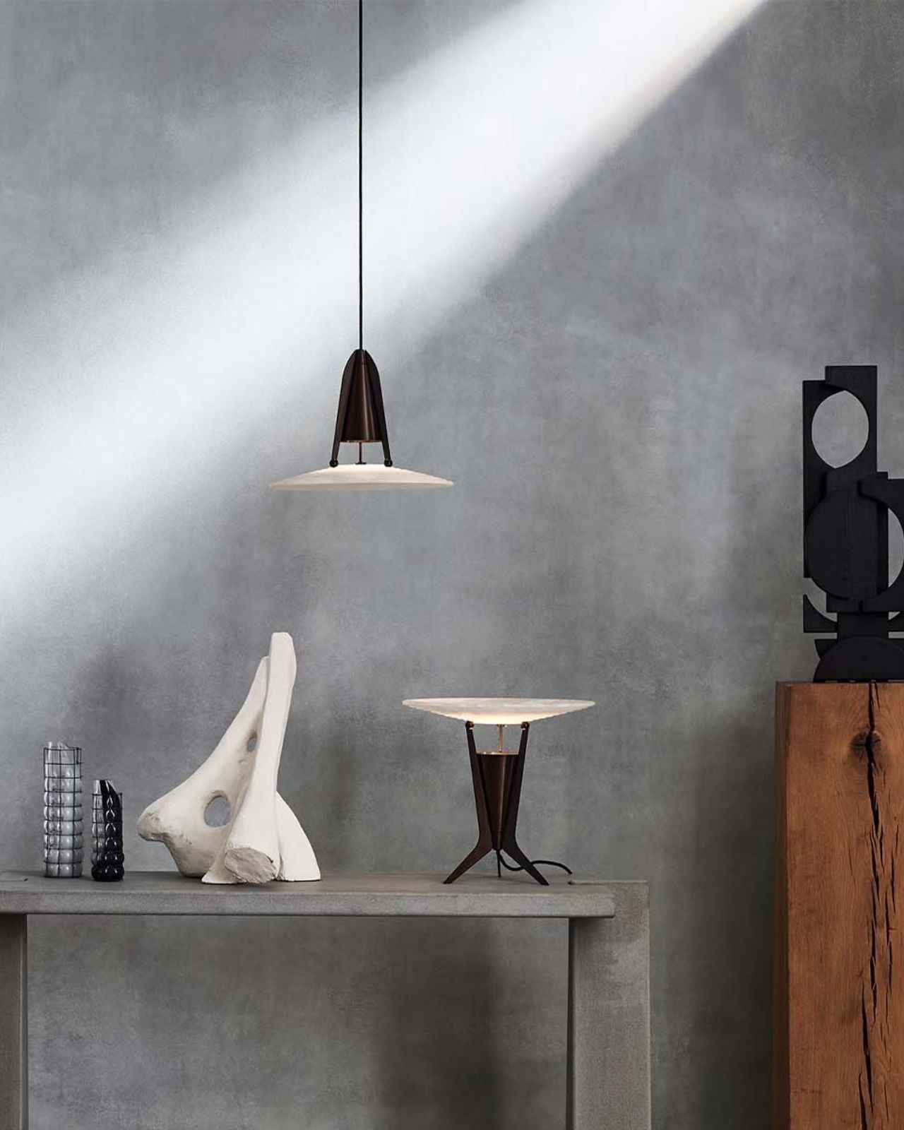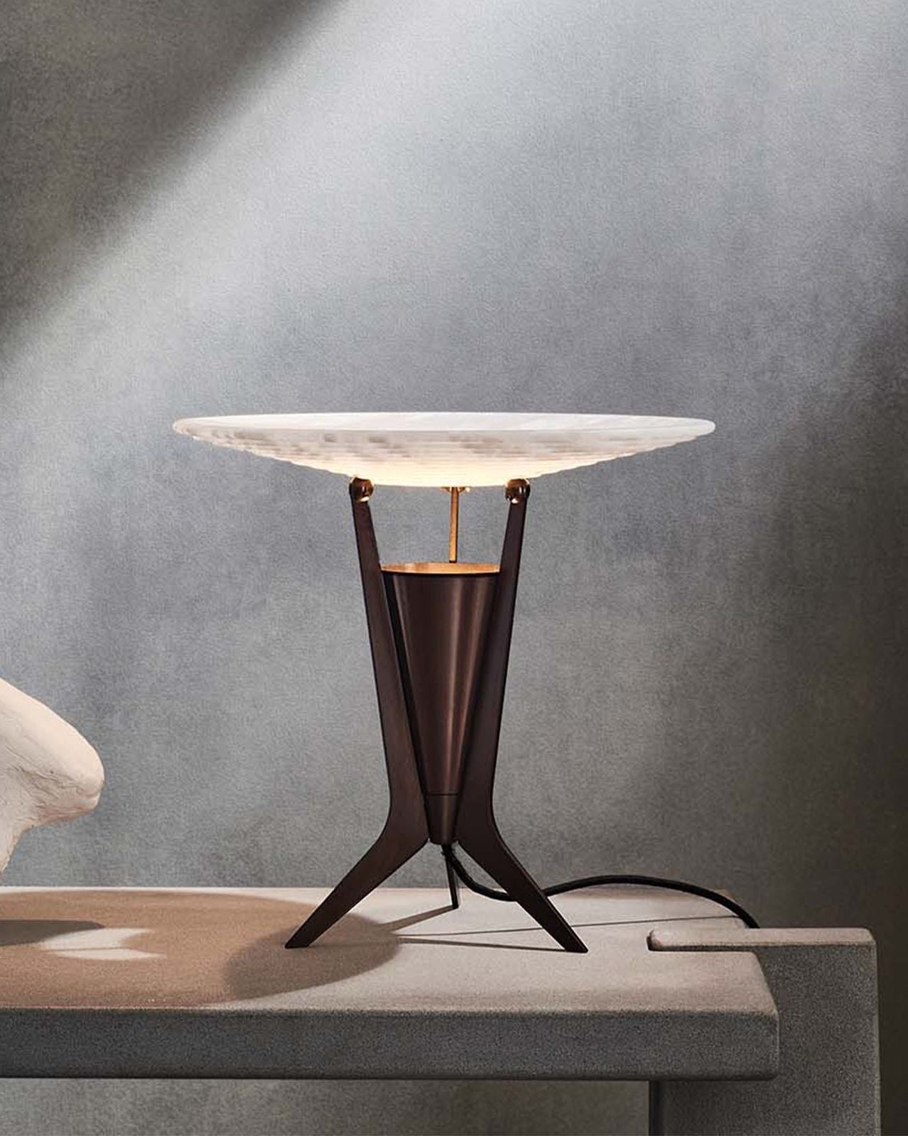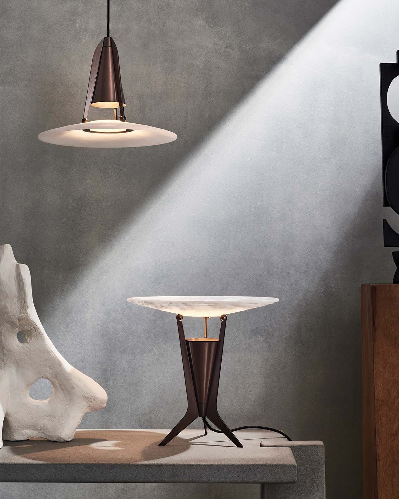 This table lamp plays with texture and light as the opalescent sculptural alabaster contrasts with the lustrous brass body. The conical stepped shade is designed to diffuse and upwardly reflect the LED light source, allowing it to create a warm and inviting atmosphere. Ideal on a side table on a console near an entrance, or as a bedside lamp. This fixture is available in antique brass, bronze, satin brass or satin nickel finish and will elegantly elevate interiors.