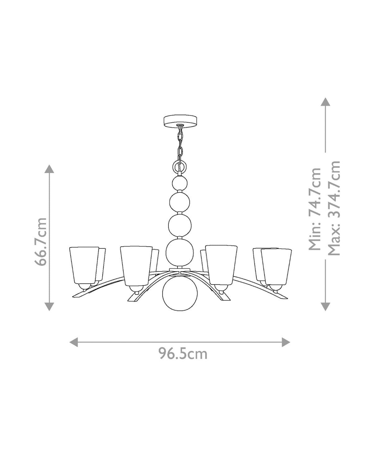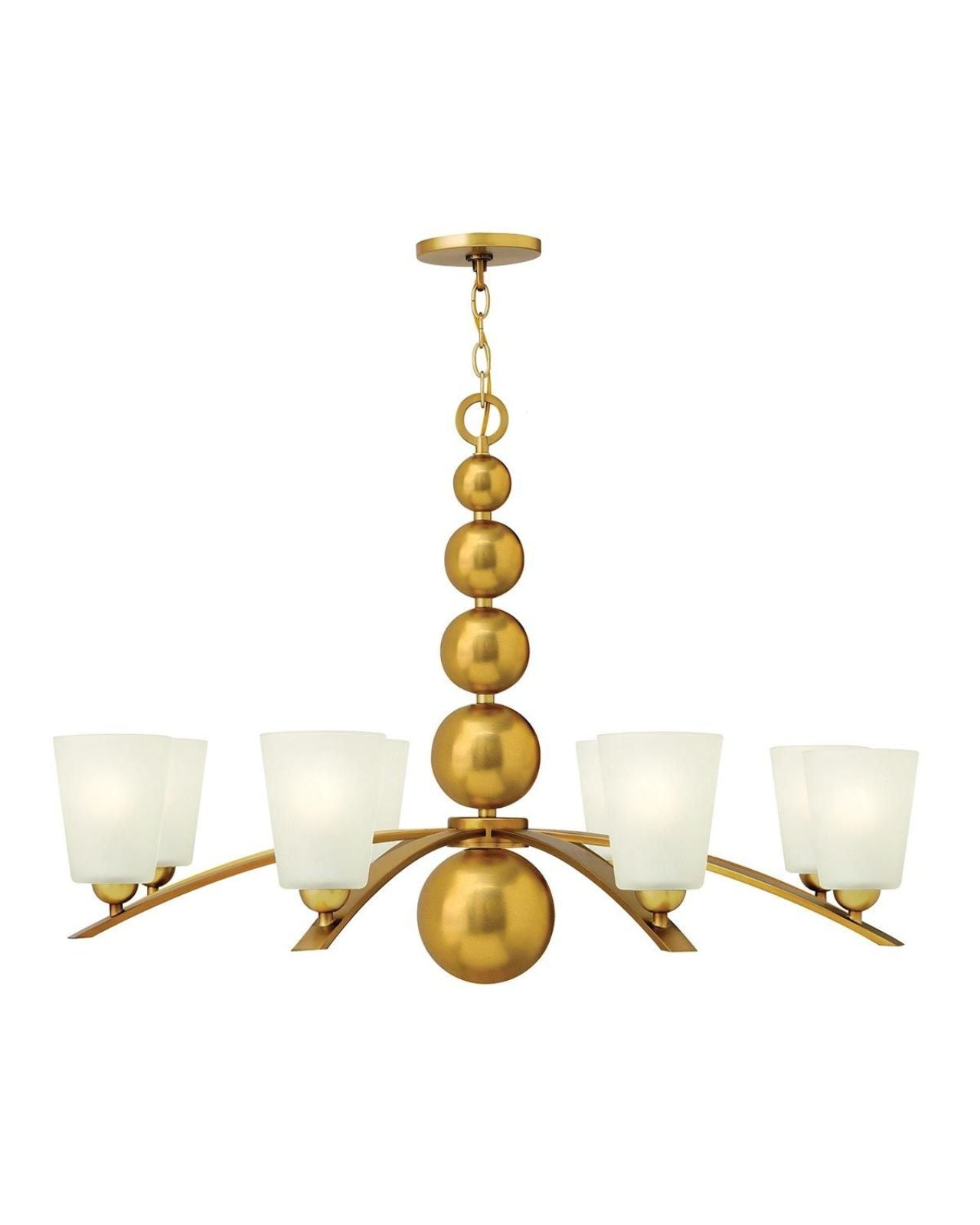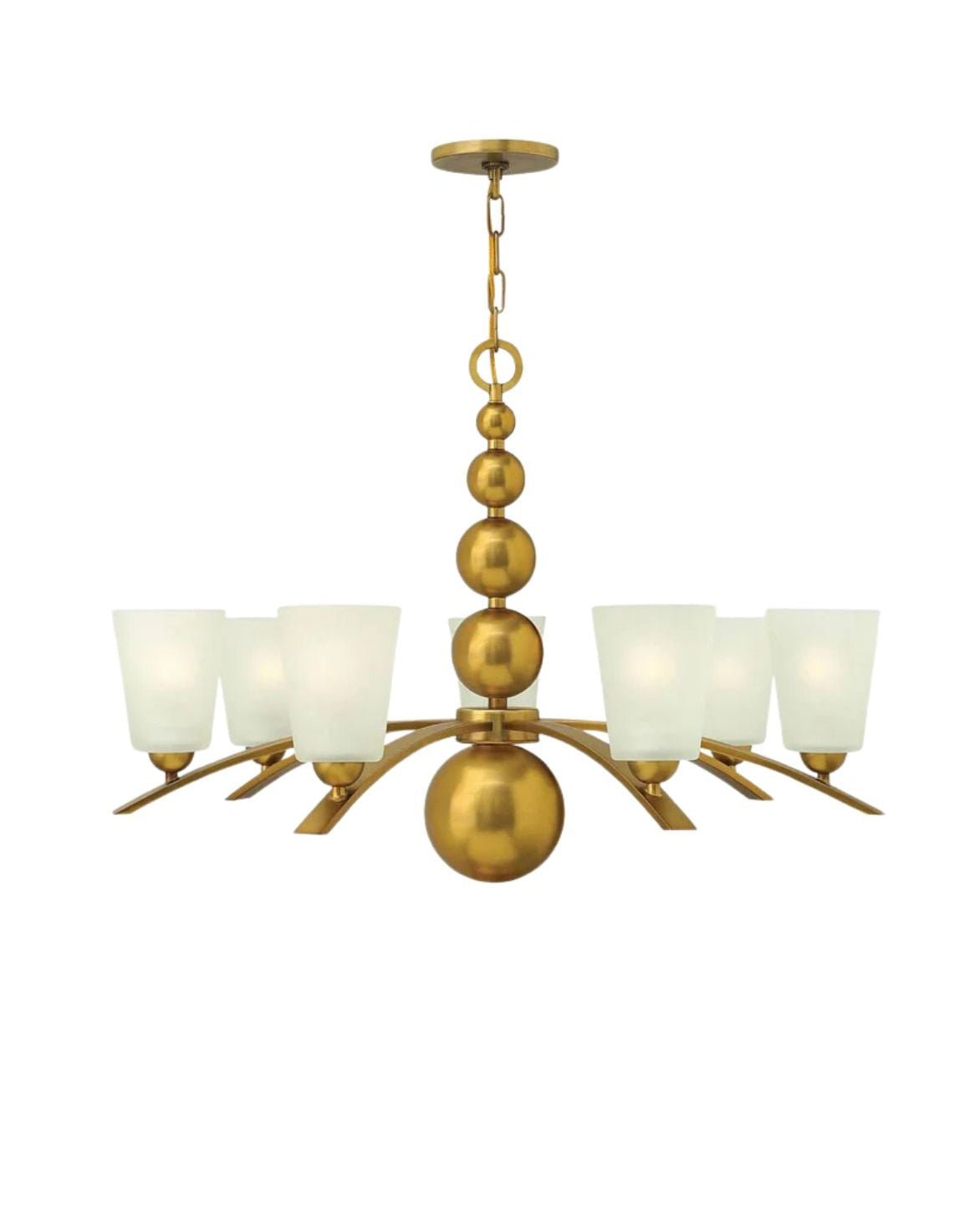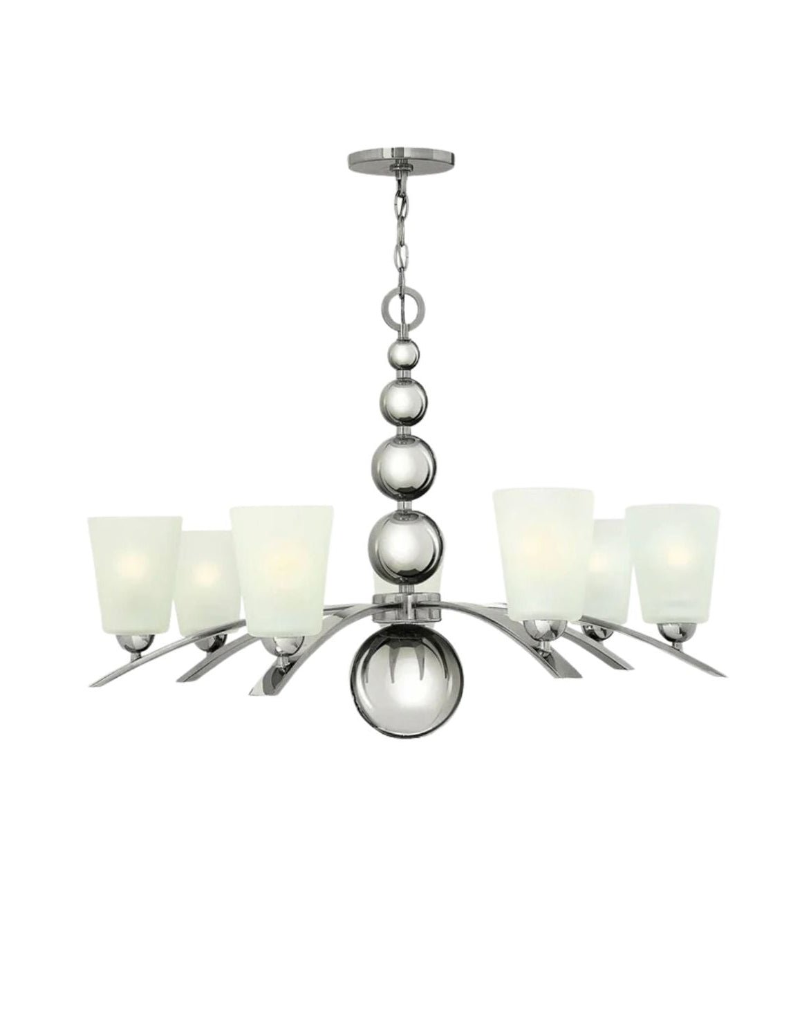 The Mid-Century Metal Sphere Chandelier is a statement piece that draws on a unique contemporary shape with a stylised design. The silhouette features metal spheres finished in Polished Nickel and Vintage Brass which increase in size as they descend from the top loop, creating an elegant look. The bowed arms support tapered etched glass shades. This piece is available with five, seven or eight lights and is sure to add character above your kitchen island, dining table or as a feature in your foyer.