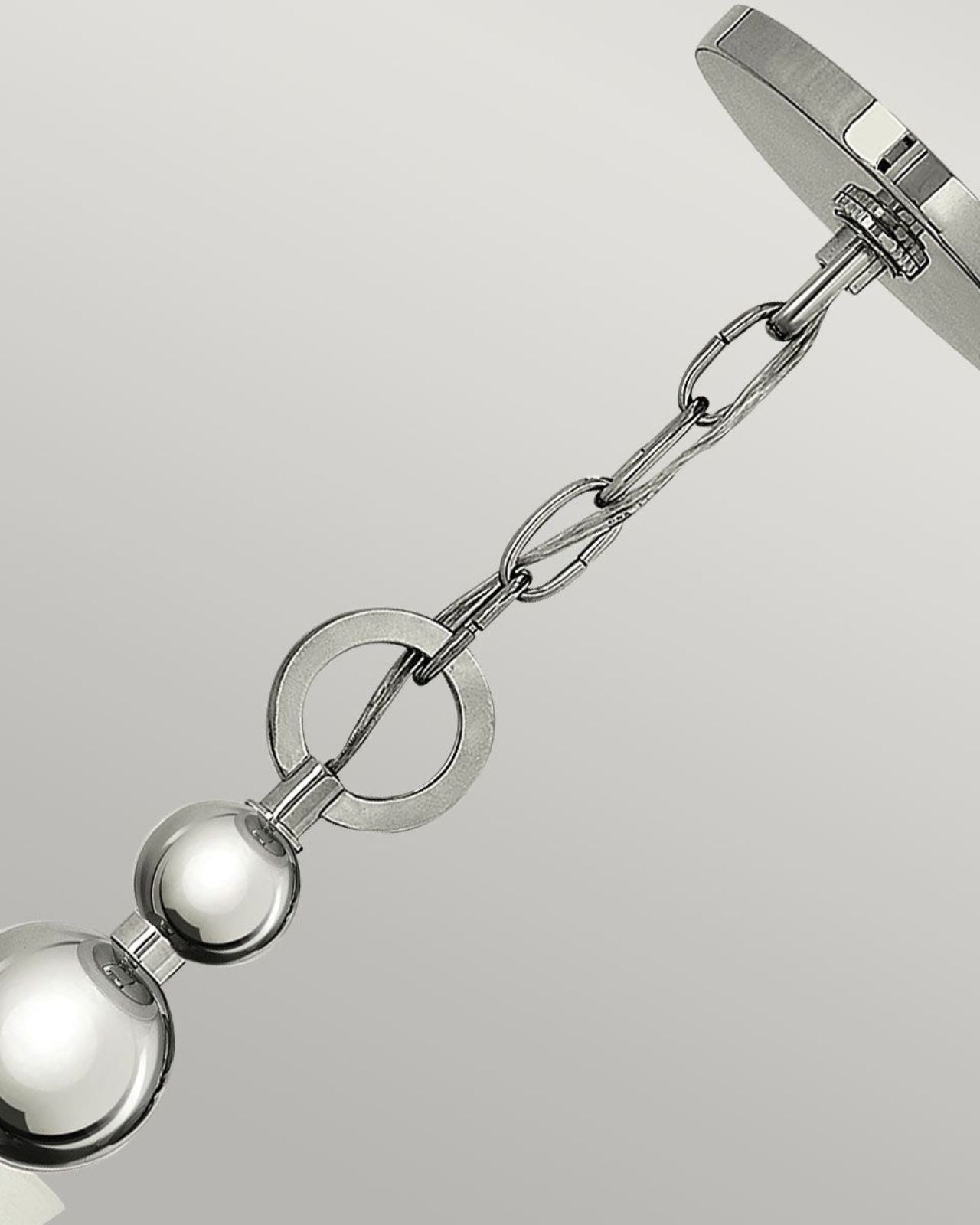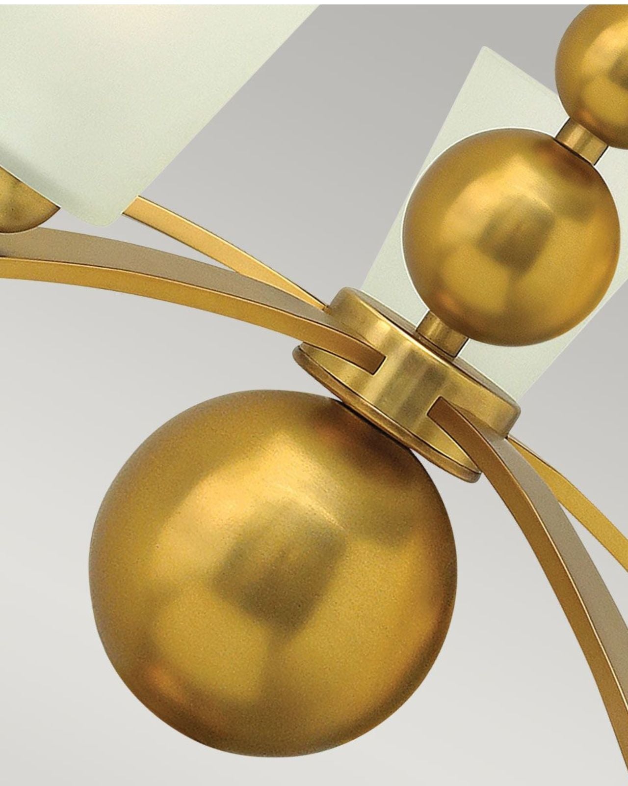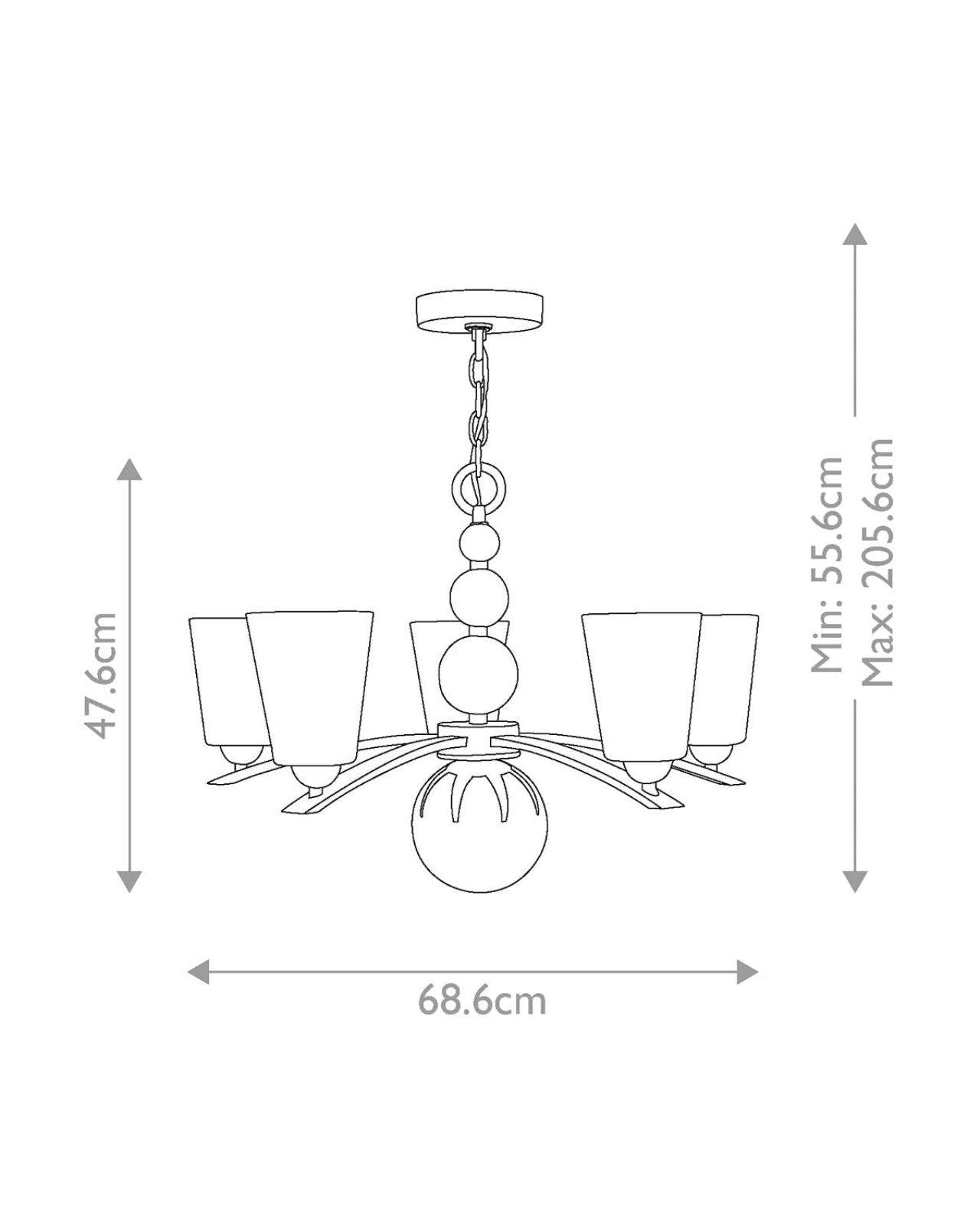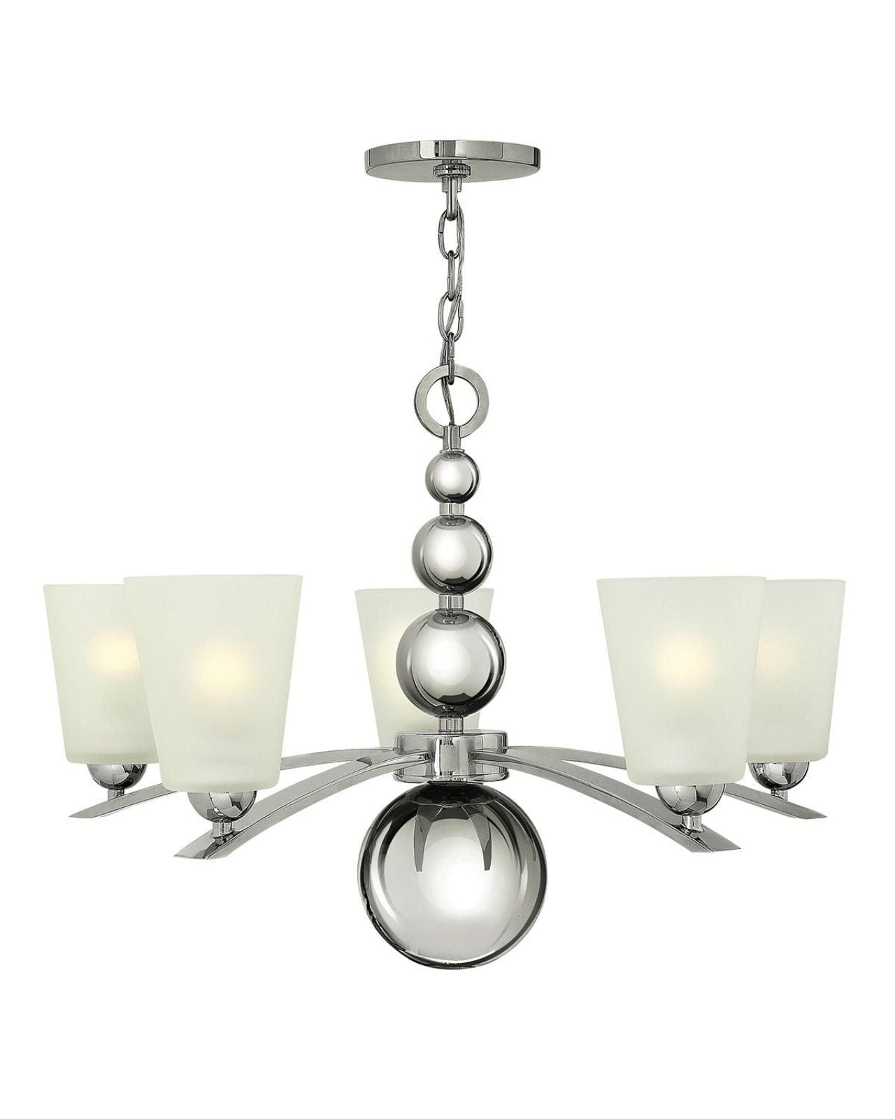 The Mid-Century Metal Sphere Chandelier is a statement piece that draws on a unique contemporary shape with a stylised design. The silhouette features metal spheres finished in Polished Nickel and Vintage Brass which increase in size as they descend from the top loop, creating an elegant look. The bowed arms support tapered etched glass shades. This piece is available with five, seven or eight lights and is sure to add character above your kitchen island, dining table or as a feature in your foyer.