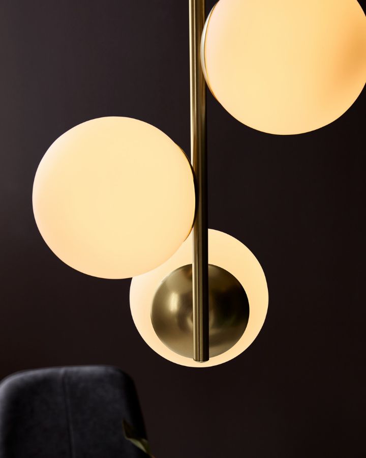 The Mid-Century Modern Tri-Globe Hanging Pendant features three luminous opal globes that emanate a warm glow when illuminated. The mixture of brushed brass and opal glass makes this an elegant addition to any mid century inspired interior.